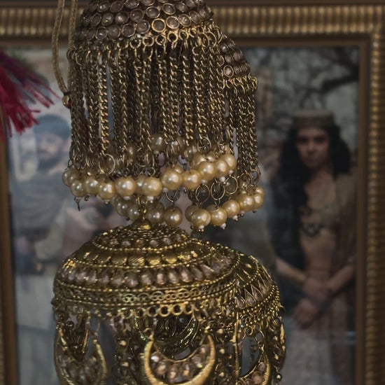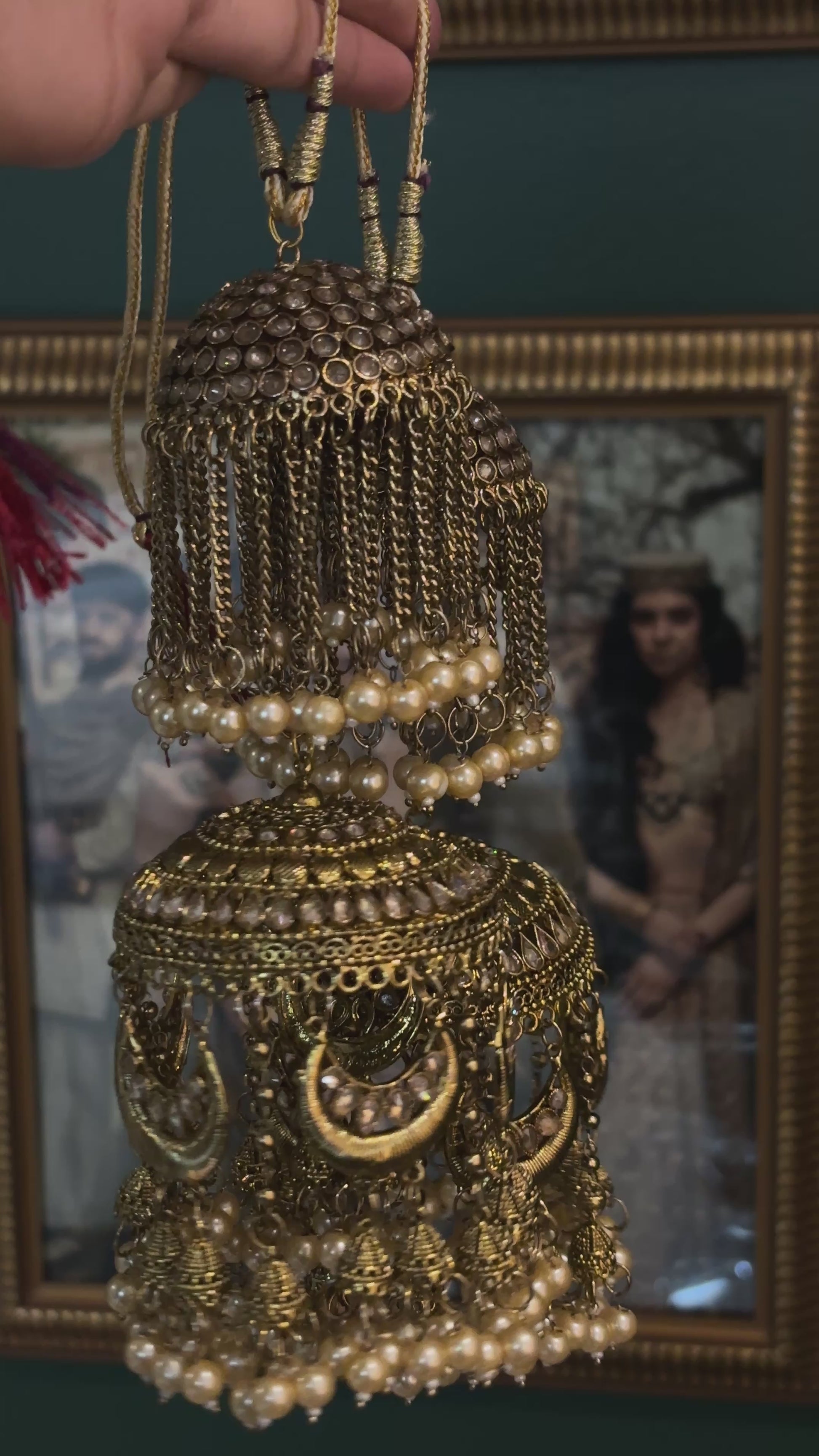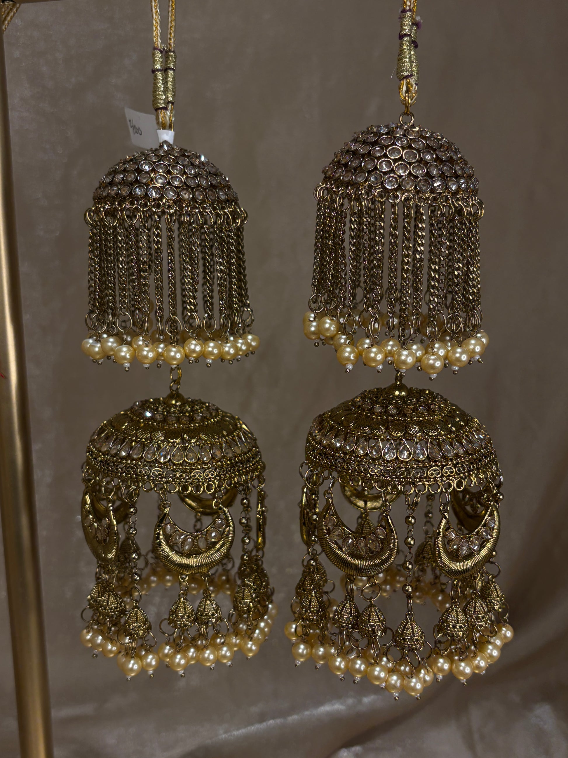 2 layer jhumki kalire with champagne coloured pearl detailed; comes with adjustable string to attach to wrist. About 7 inches long