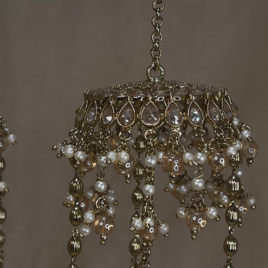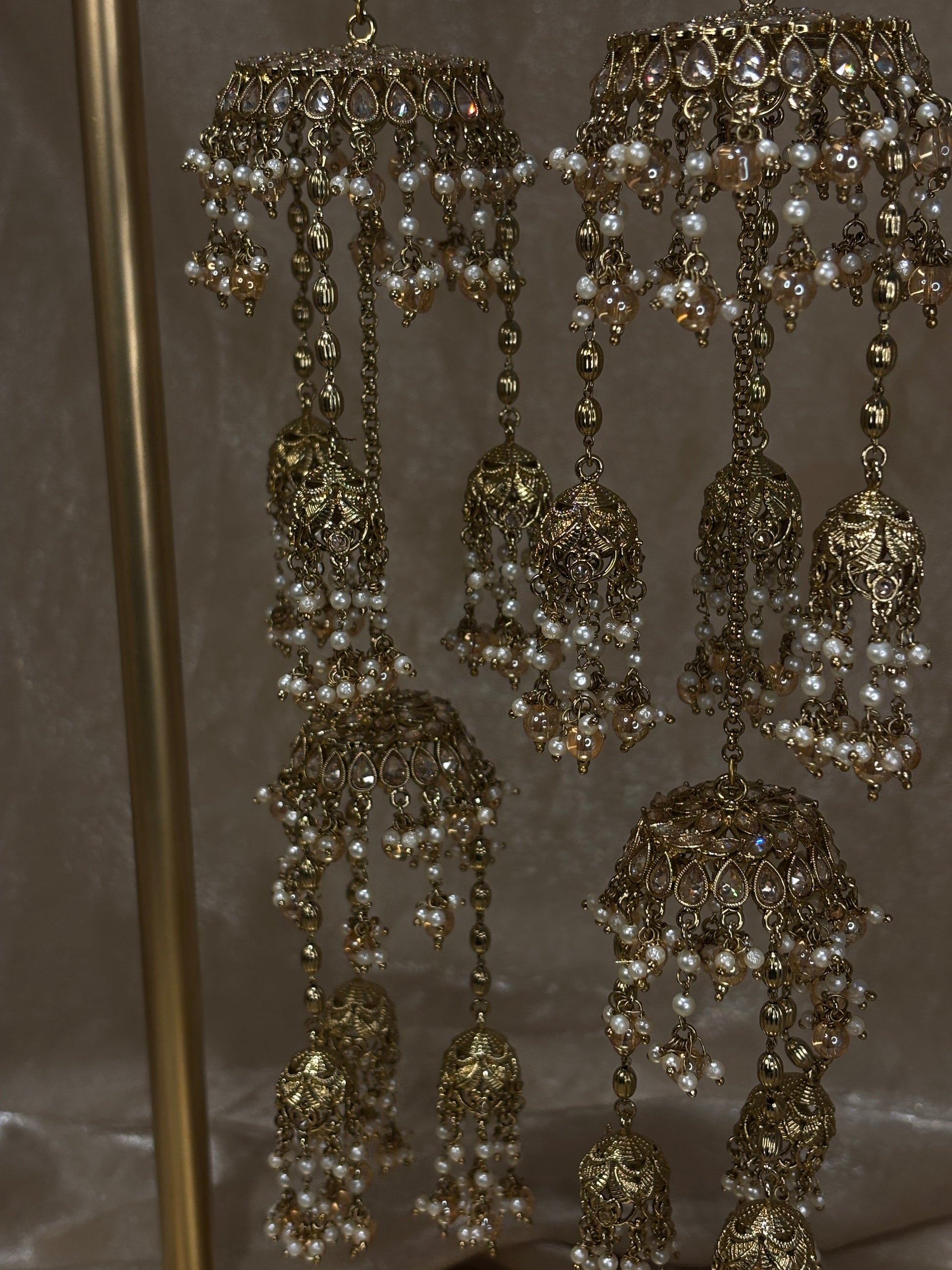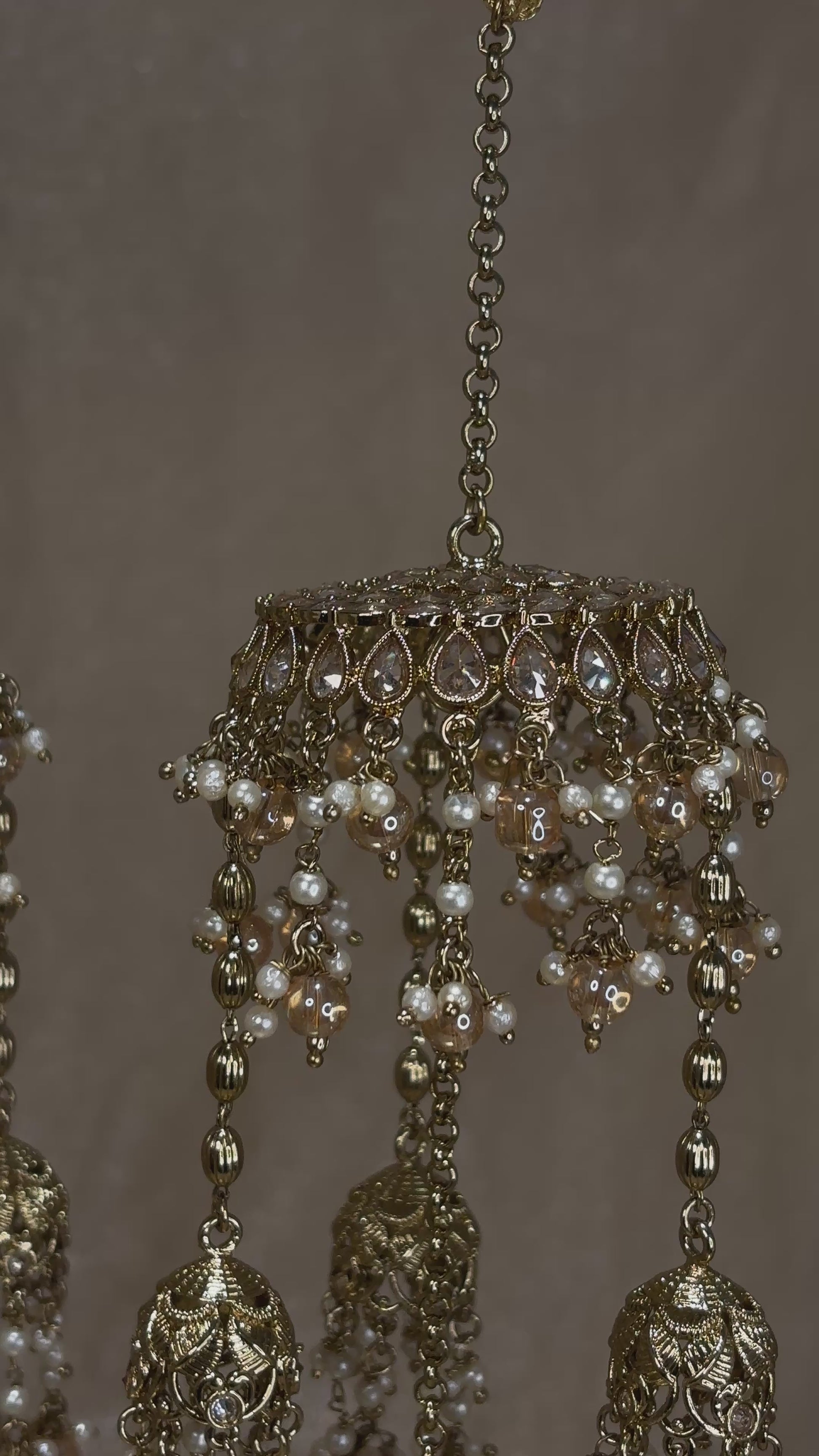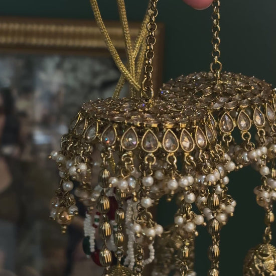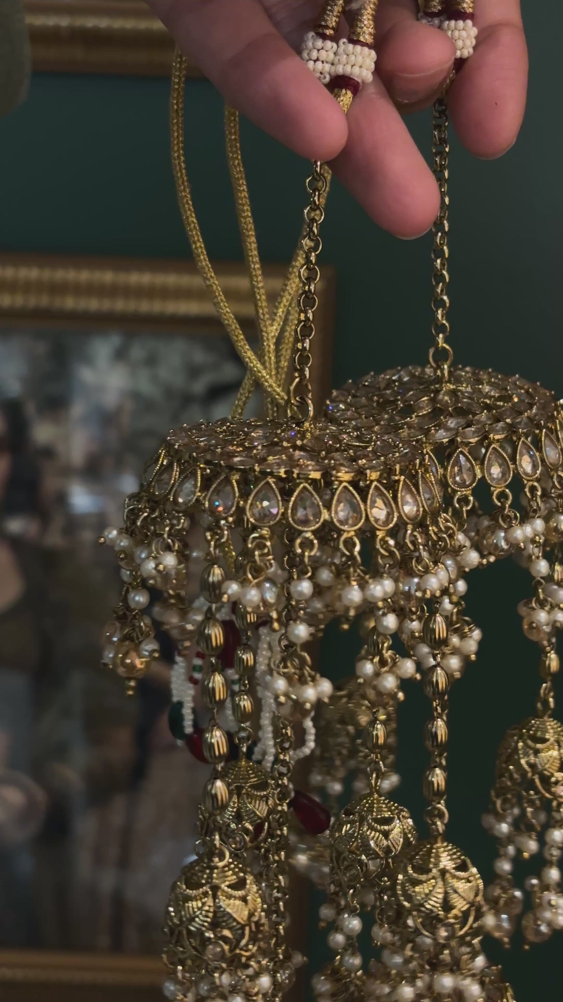 Stunning 2 layer pearl detail kalire with mini jhumki; comes with adjustable string to attach to wrist. About 9 inches long.