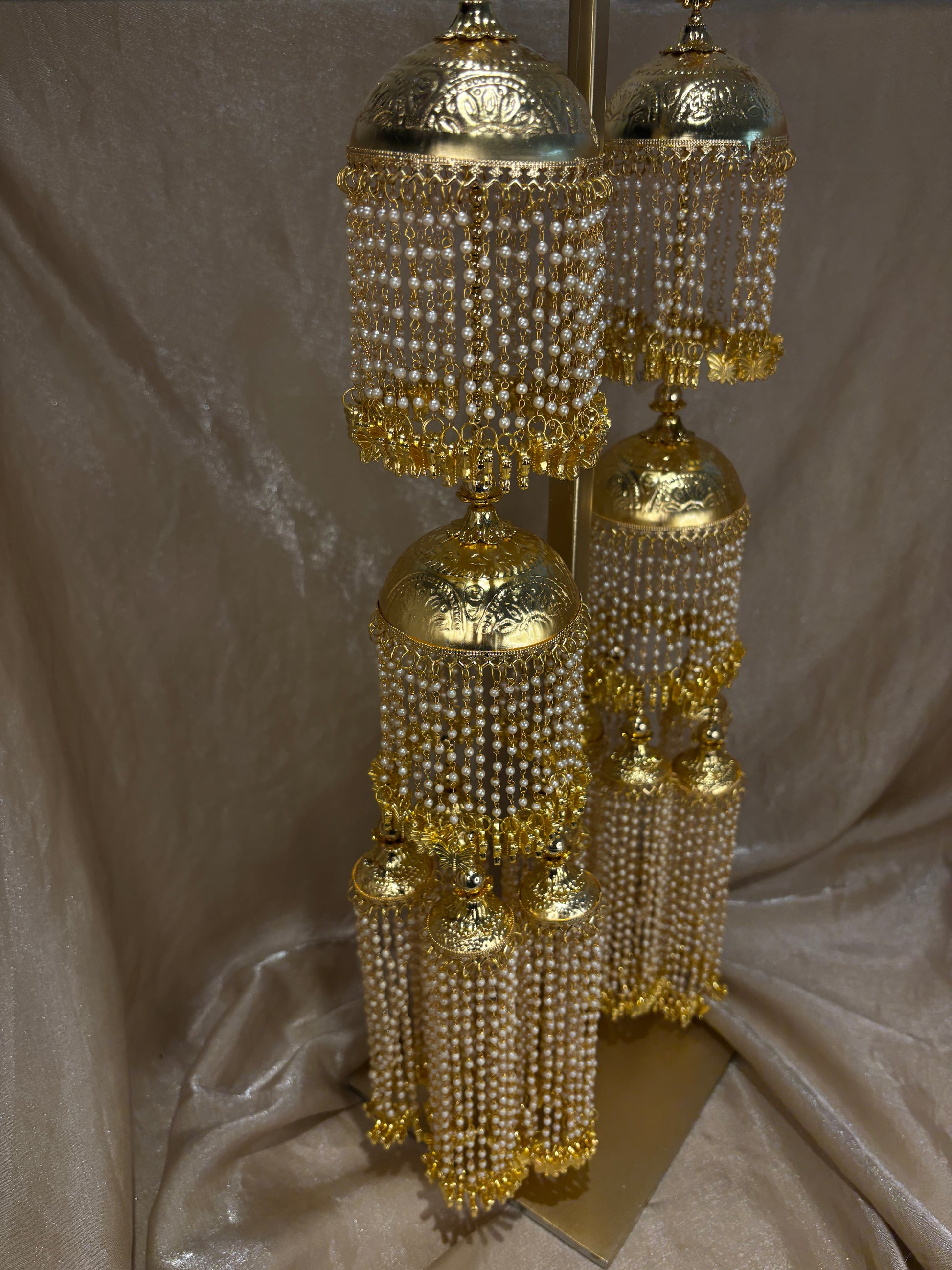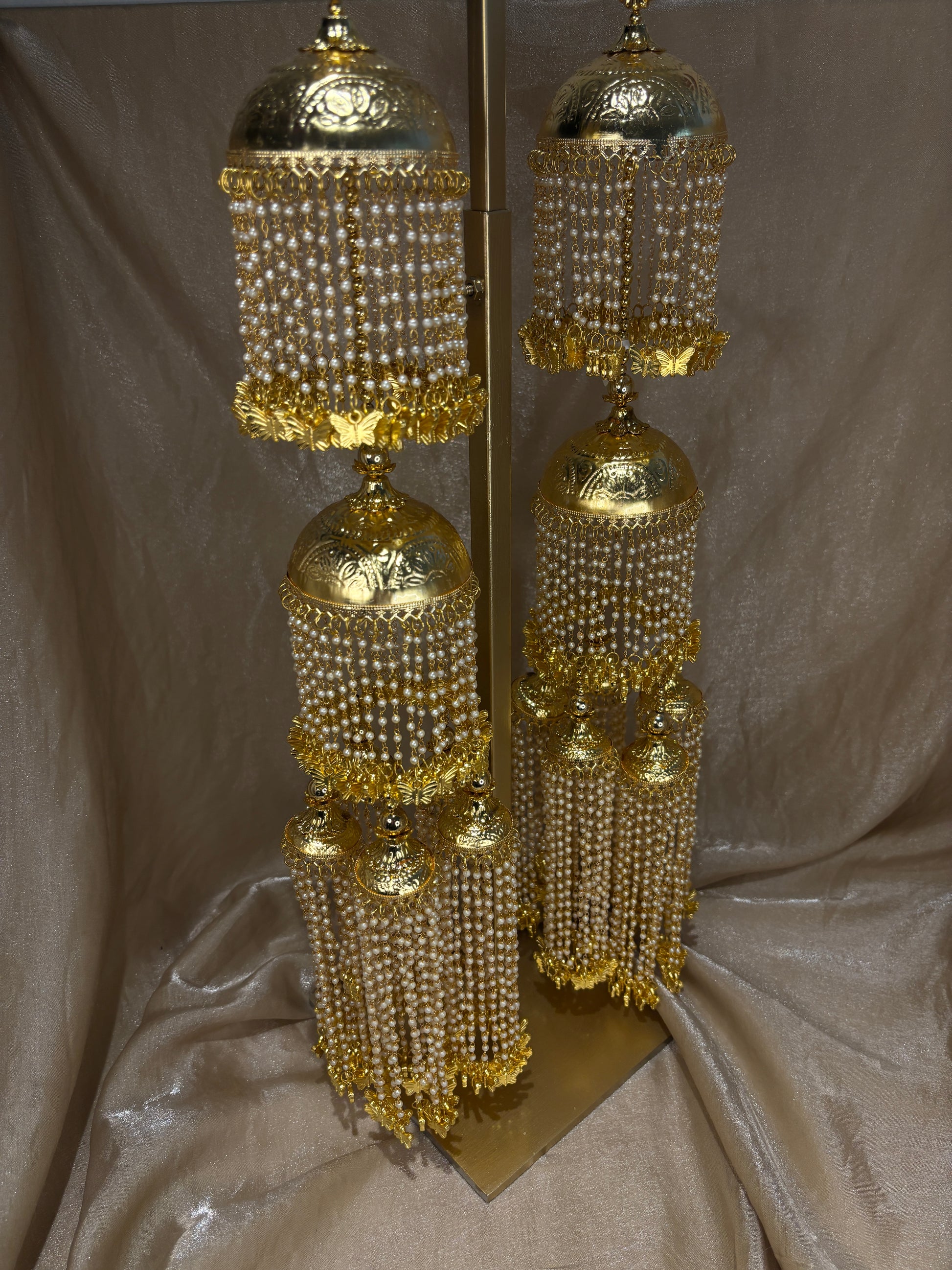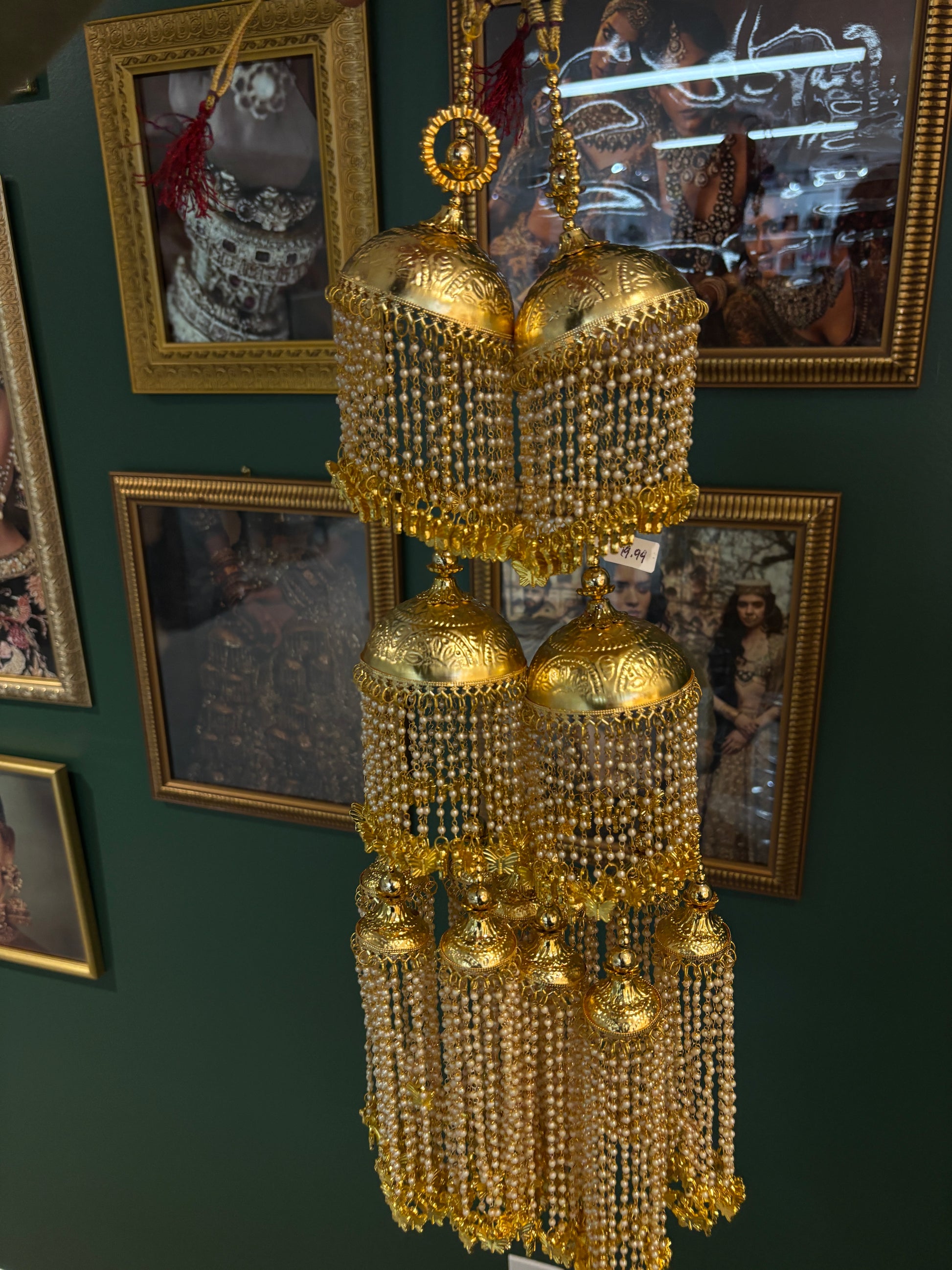 Statement 3 layer pipal Patti kalire with small pearl and butterfly details. Yellow gold colour. About 18 inches long.