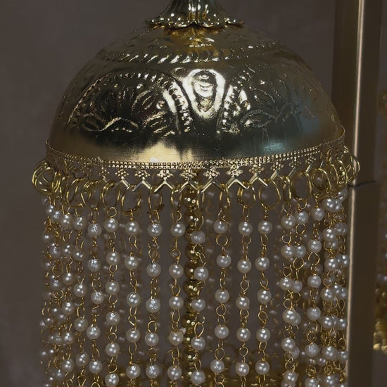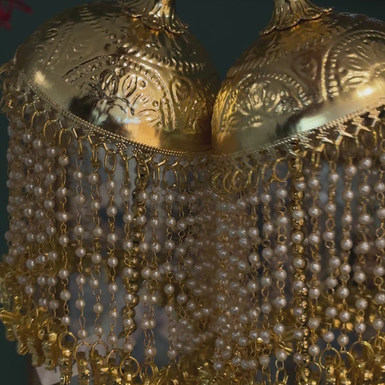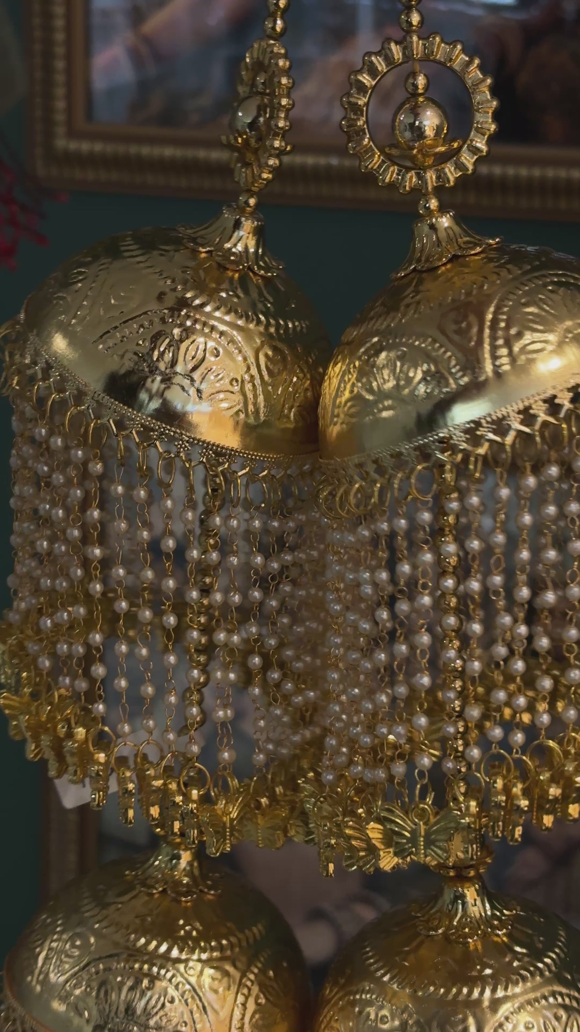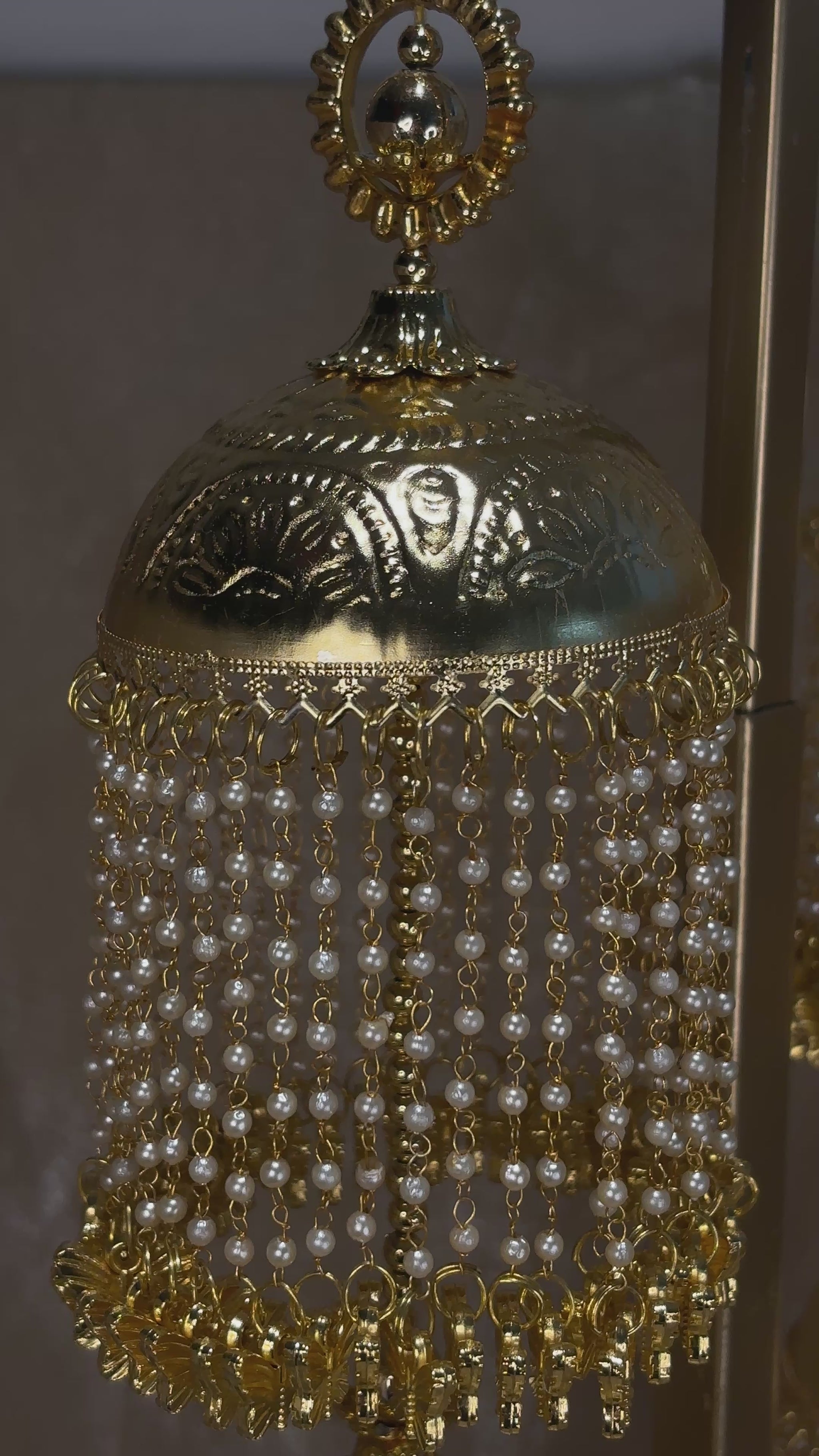 Statement 3 layer pipal Patti kalire with small pearl and butterfly details. Yellow gold colour. About 18 inches long.