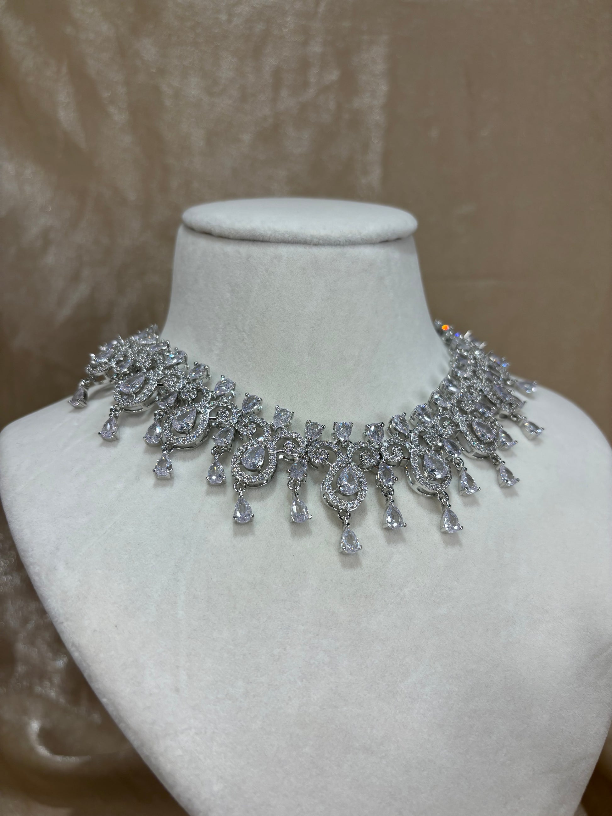 American diamond necklace set; comes with earrings, tikka, and passa.