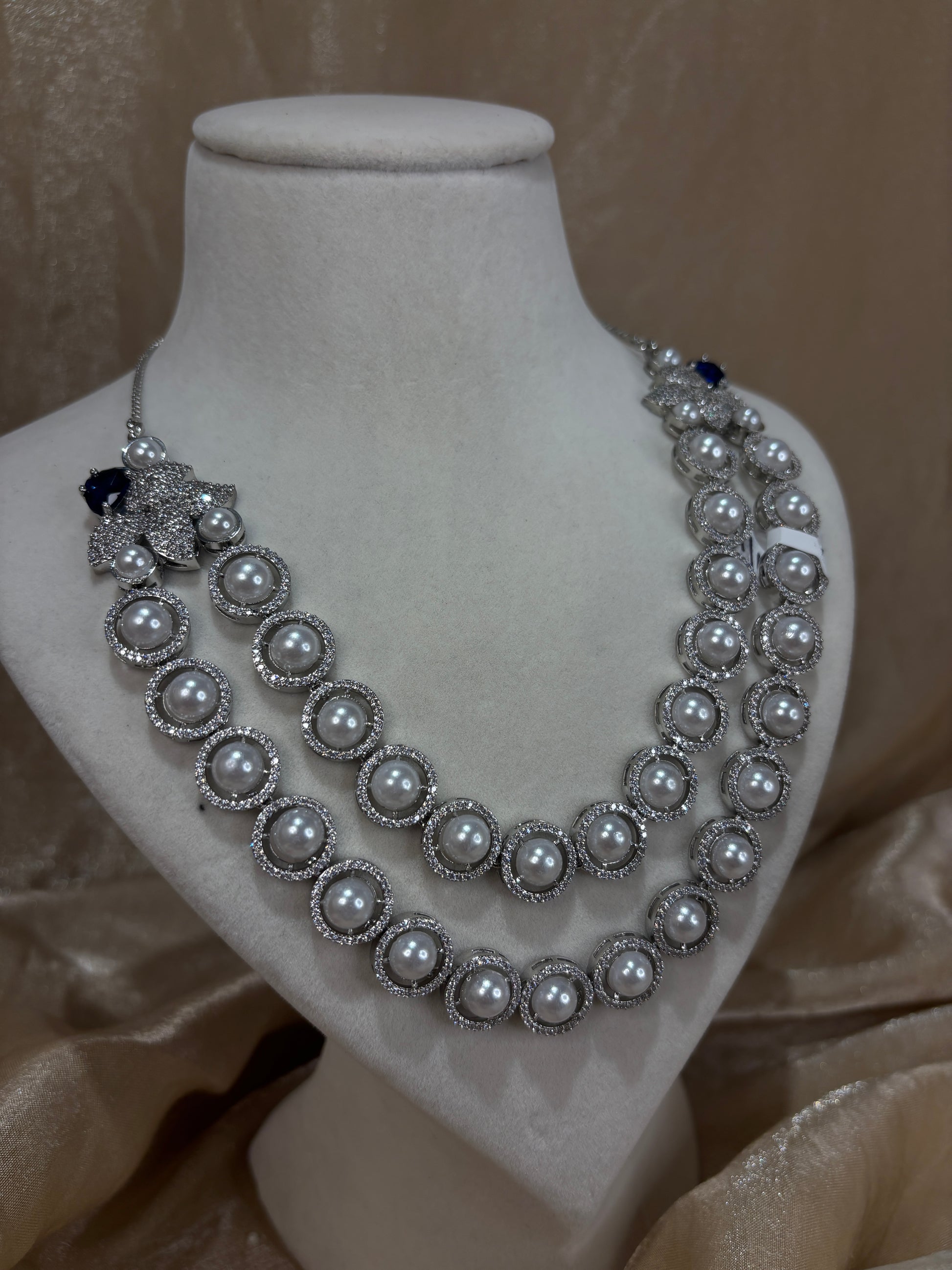 American diamond 2 layer necklace set with navy blue details; comes with earrings