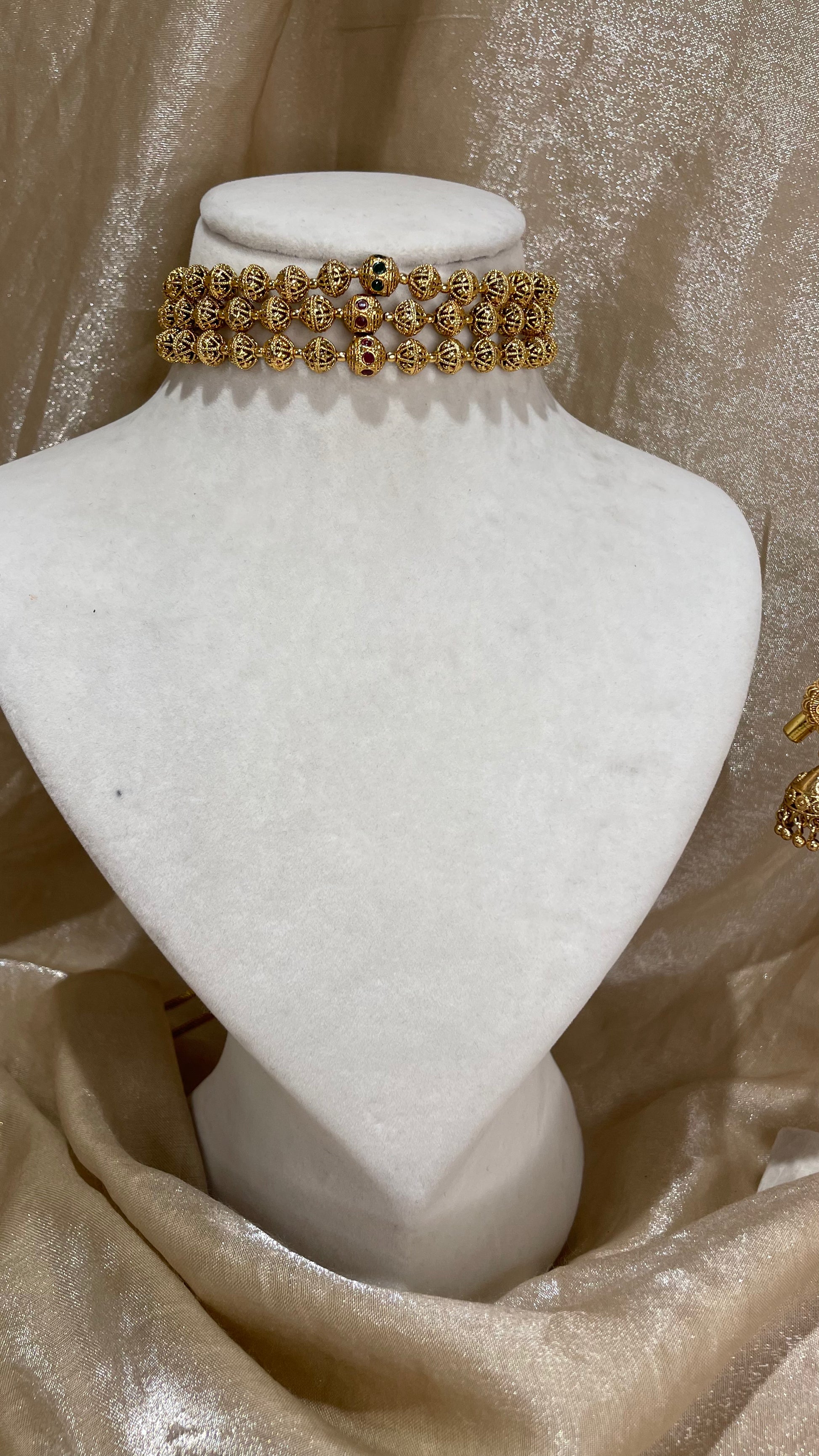 3 layer antique gold matar mala choker set; comes with small jhumki earrings