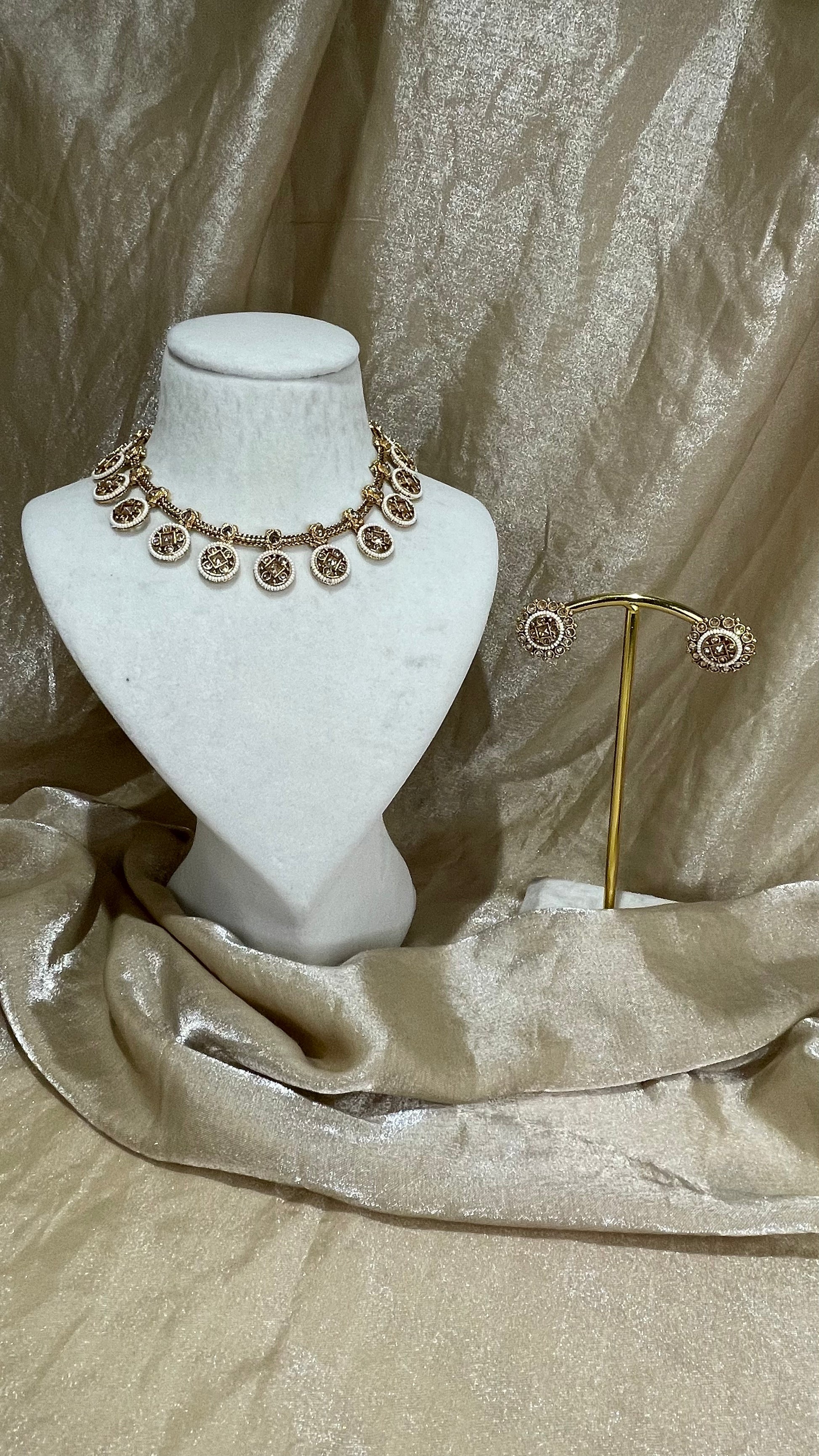 antique gold necklace set with pearl detail; comes with stud earrings