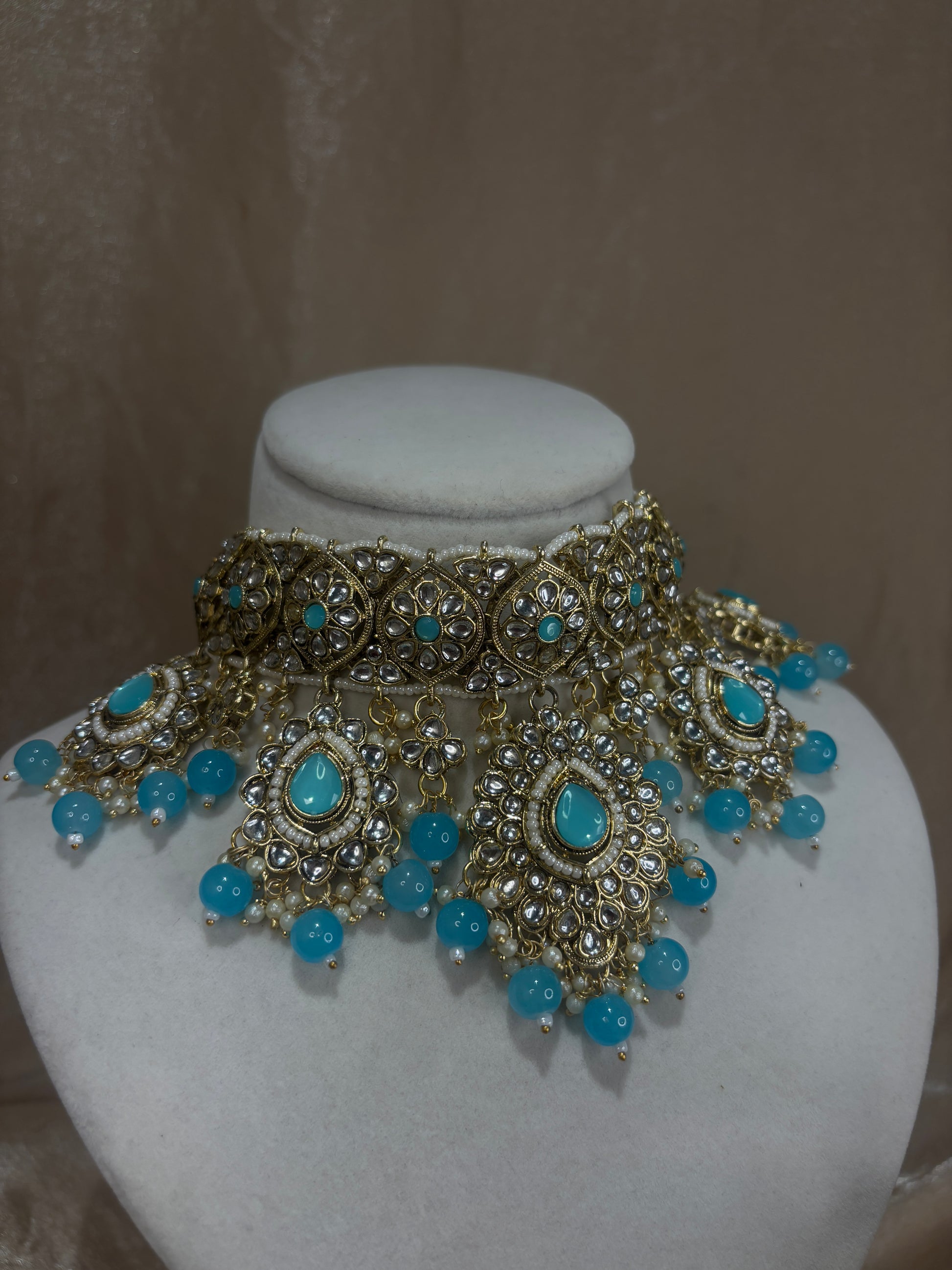Baby blue kundan choker set with pearl details; comes with earrings and tikka
