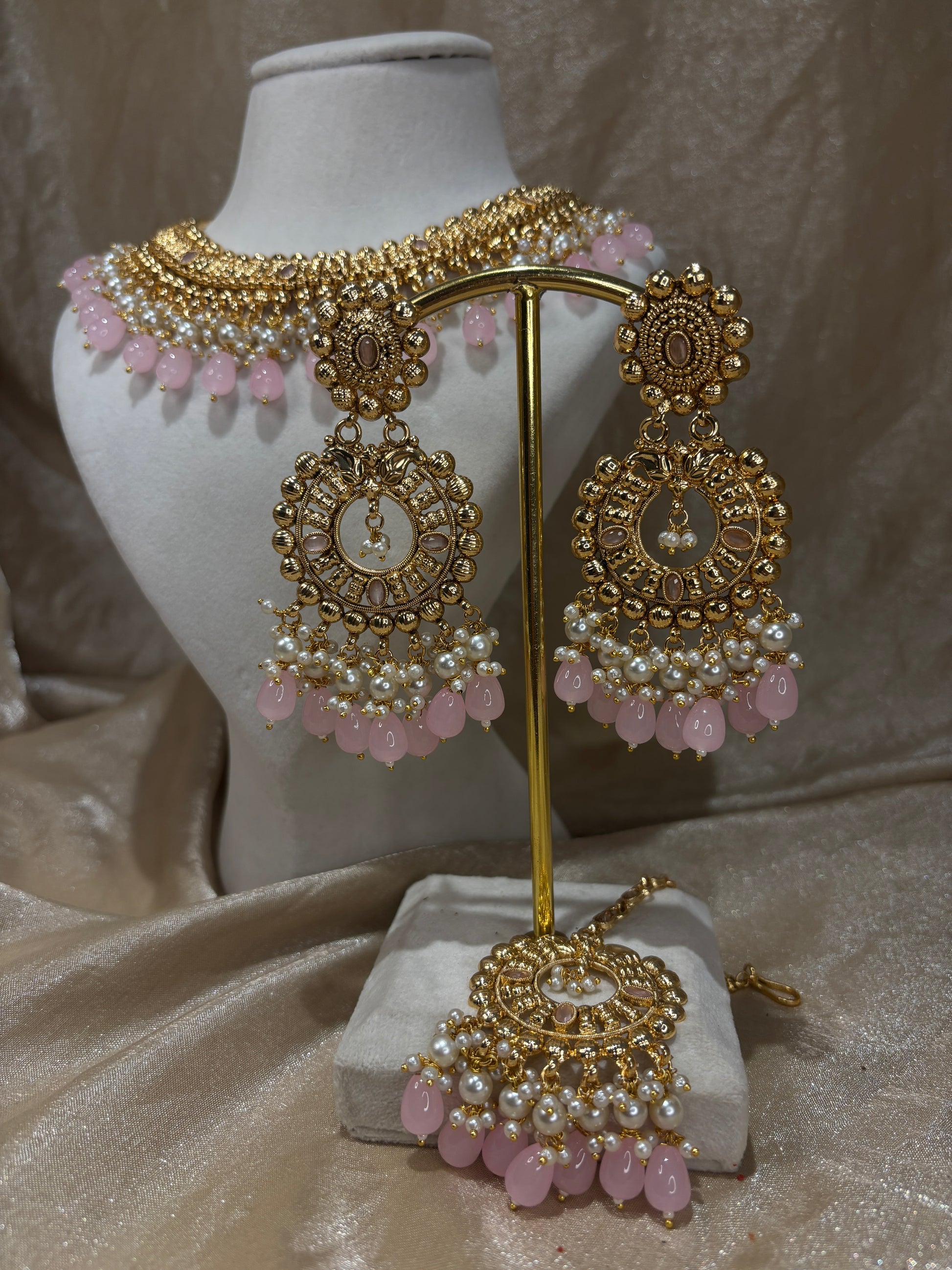 Antique gold necklace in baby pink with small pearl details; comes with earrings and tikka