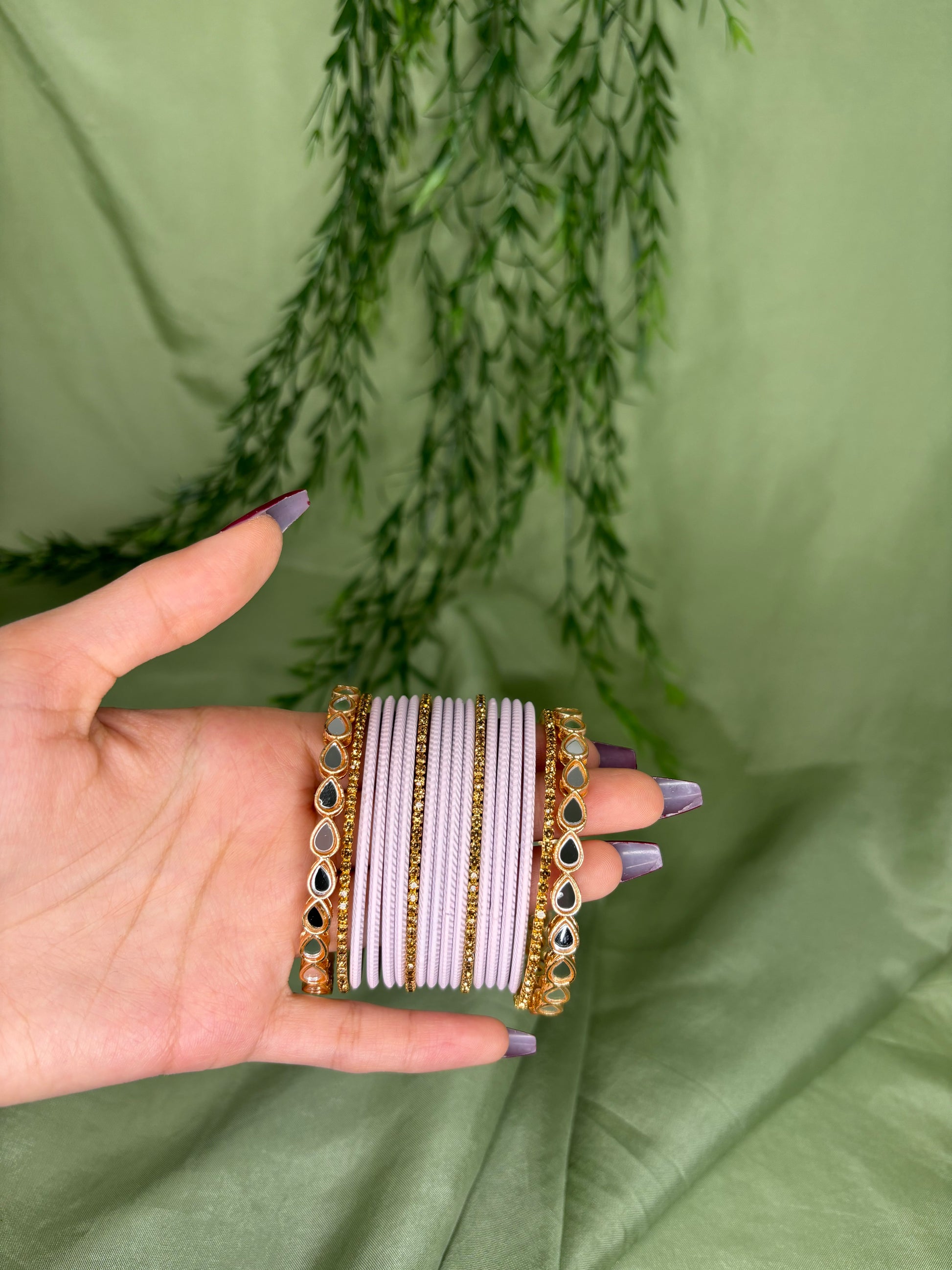 baby pink bangle set with mirror work kare; comes with bangles for both hands