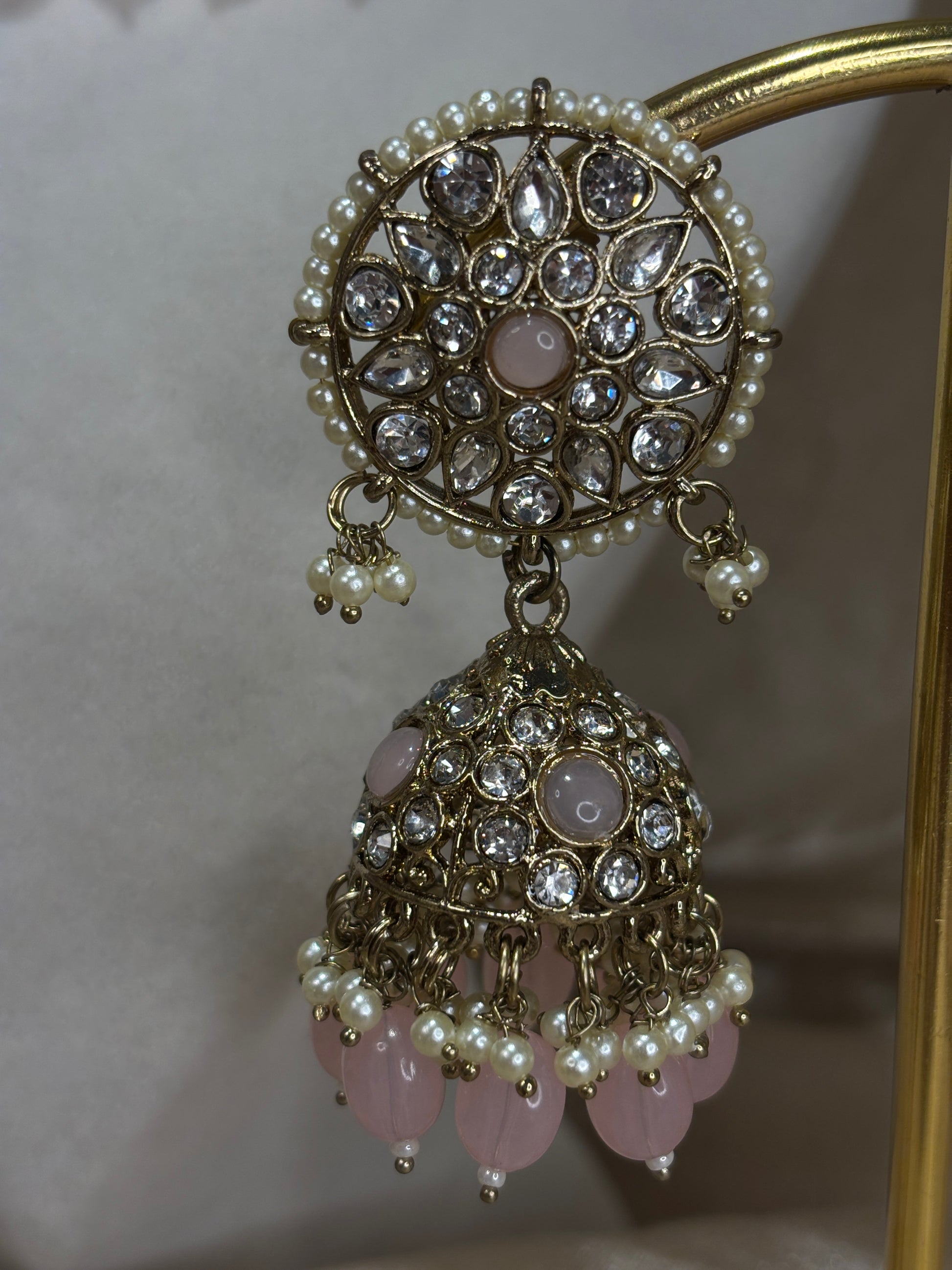 Baby pink choker set with pearl details; comes with jhumki earrings and tikka