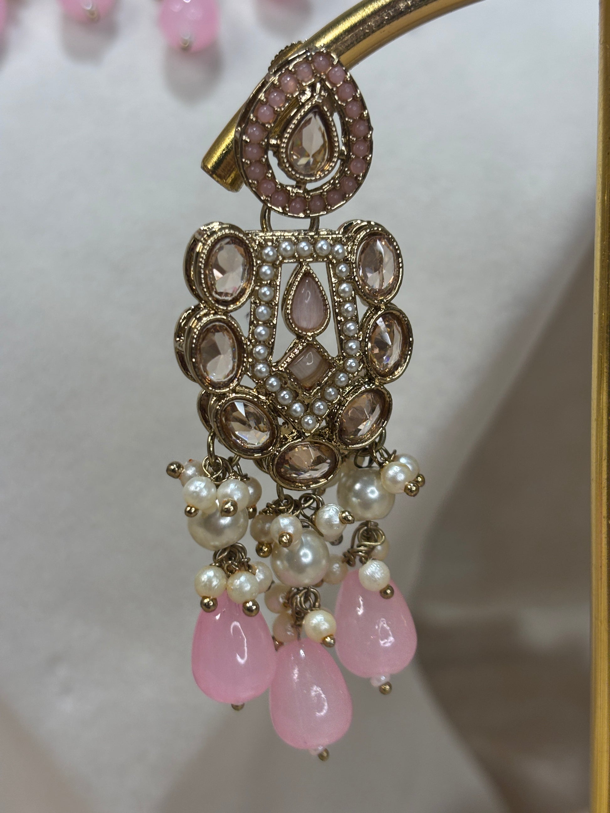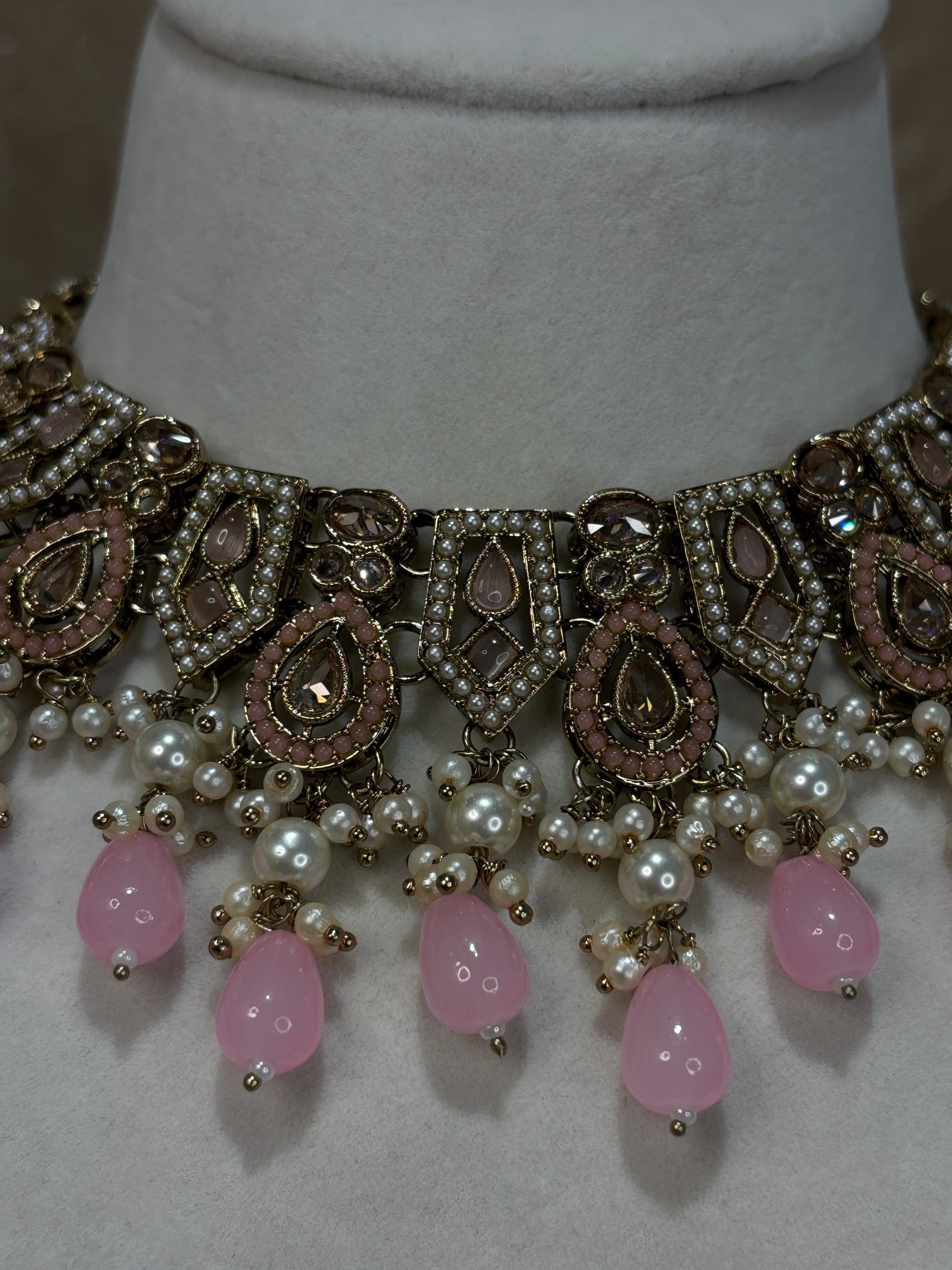 Baby pink necklace with intricate pearl details; can be worn as choker or necklace