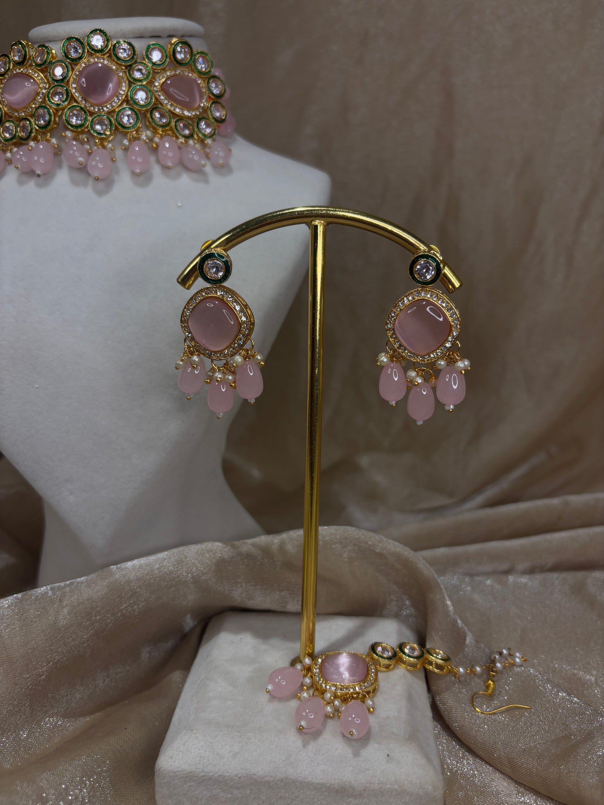 Baby pink Mona Lisa flower detail set; comes with earrings and tikka
