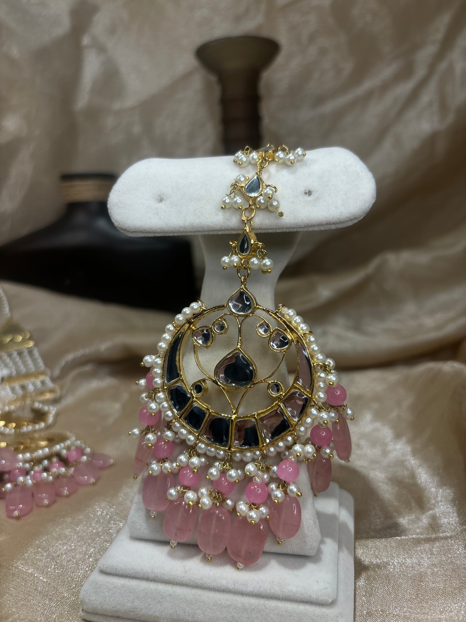 22k gold plated Pakistani farshi kundan Pakistani style earrings with baby pink accents and heavy pearl details. Comes with oversized tikka and non-removable heavy pearl detail sahare.