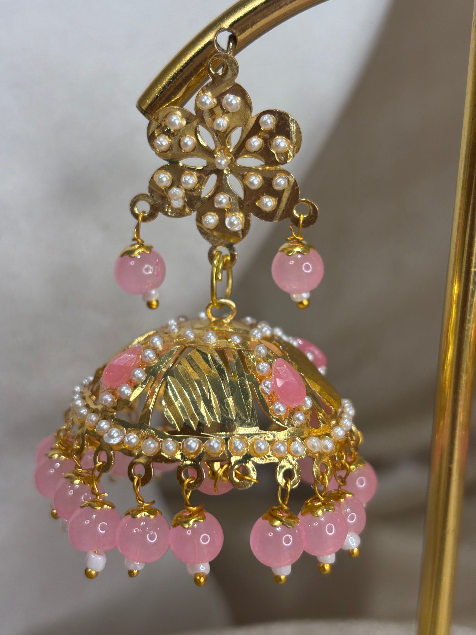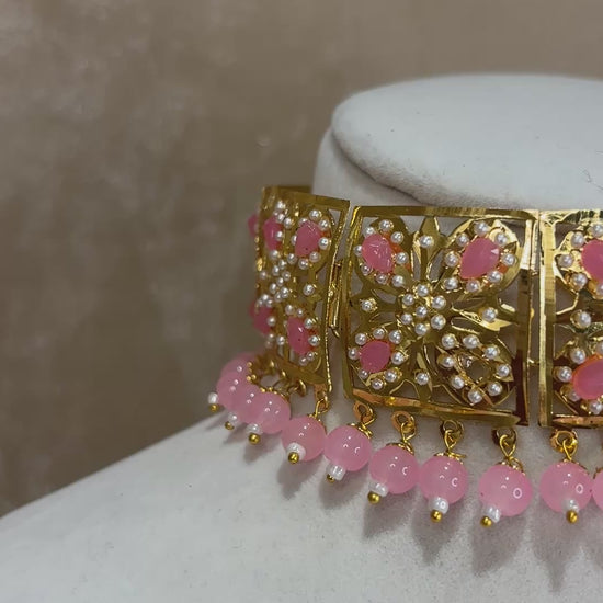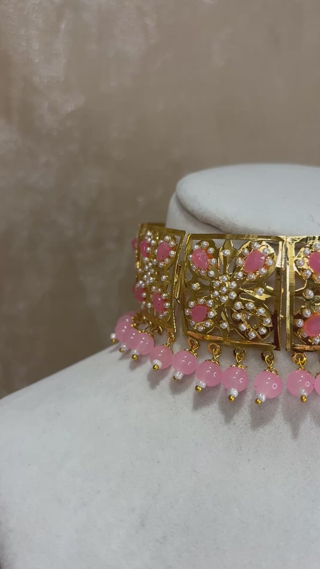 Baby pink jadau choker set with small pearl details; comes with earrings and tikka