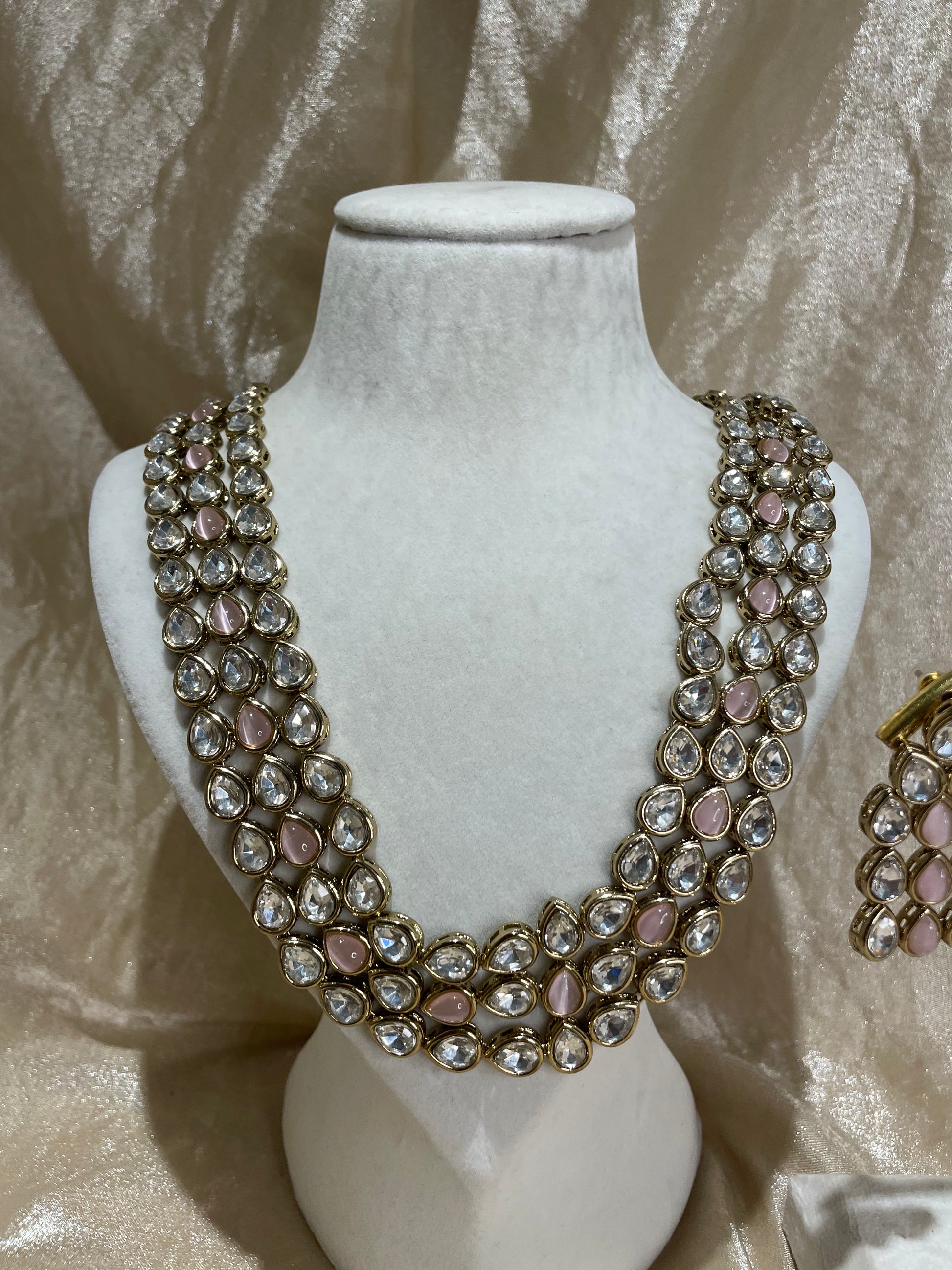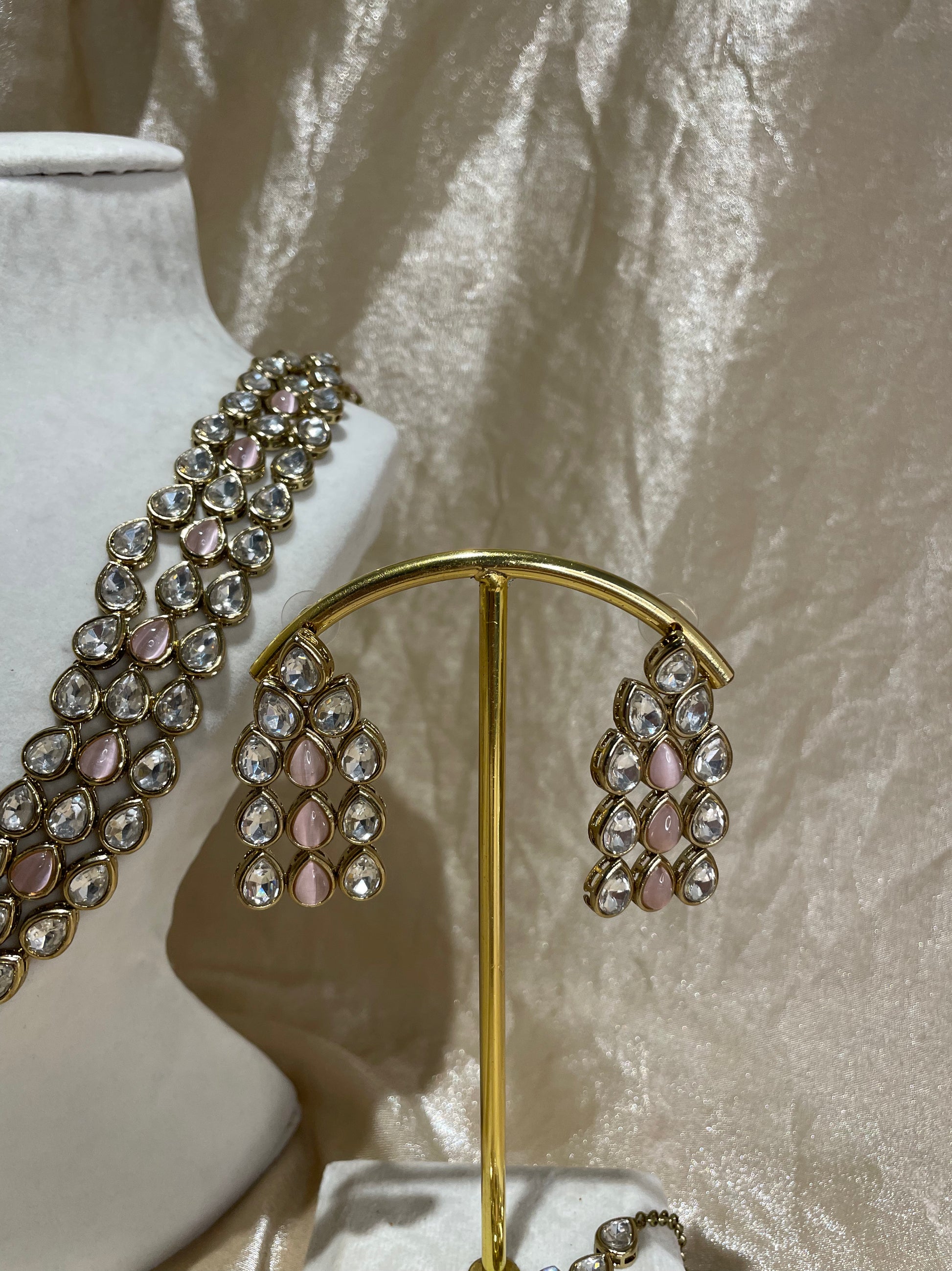 baby pink kundan long set; comes with earrings and tikka