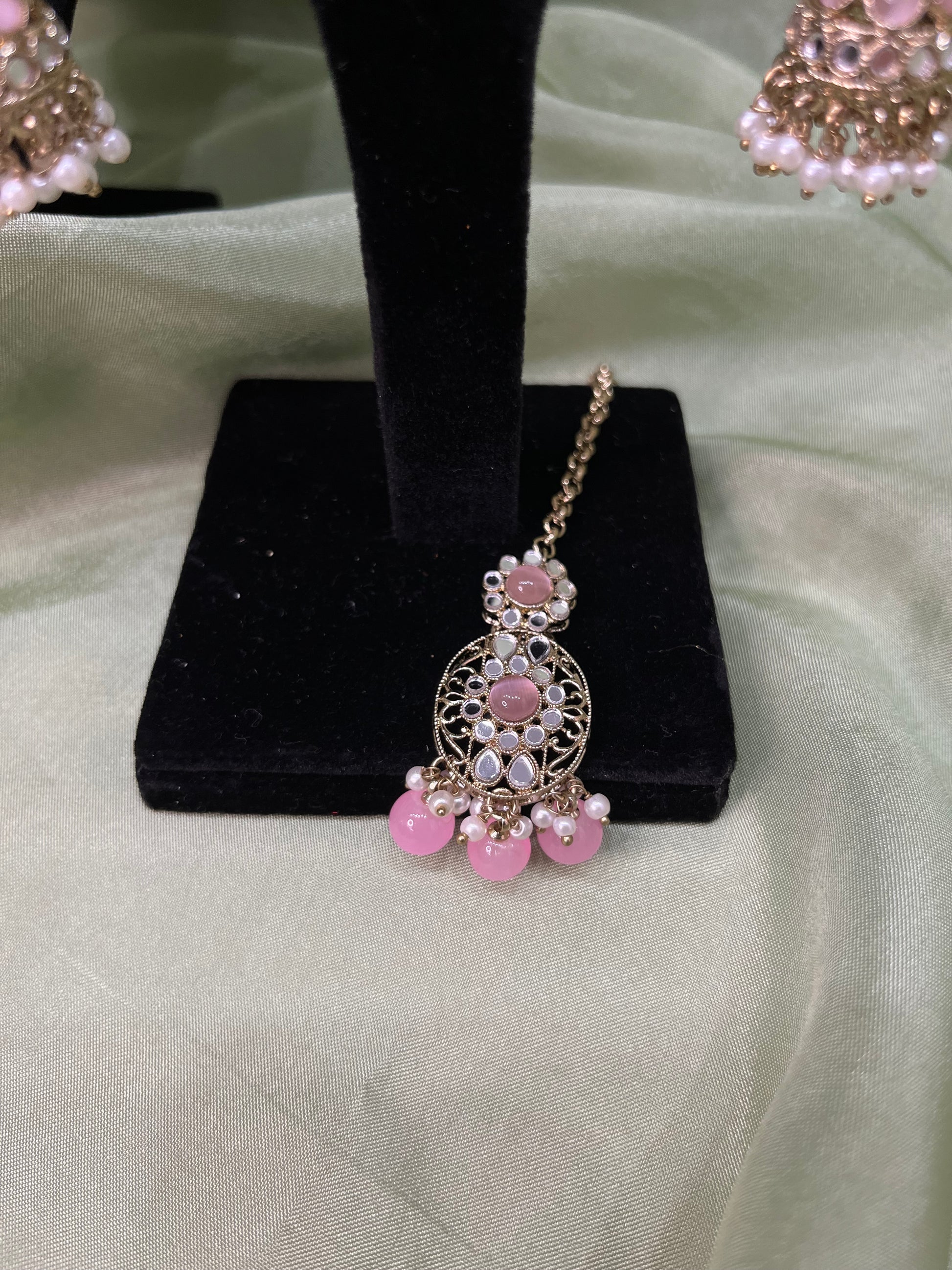 Baby pink choker with mirror work details; comes with earrings and tikka