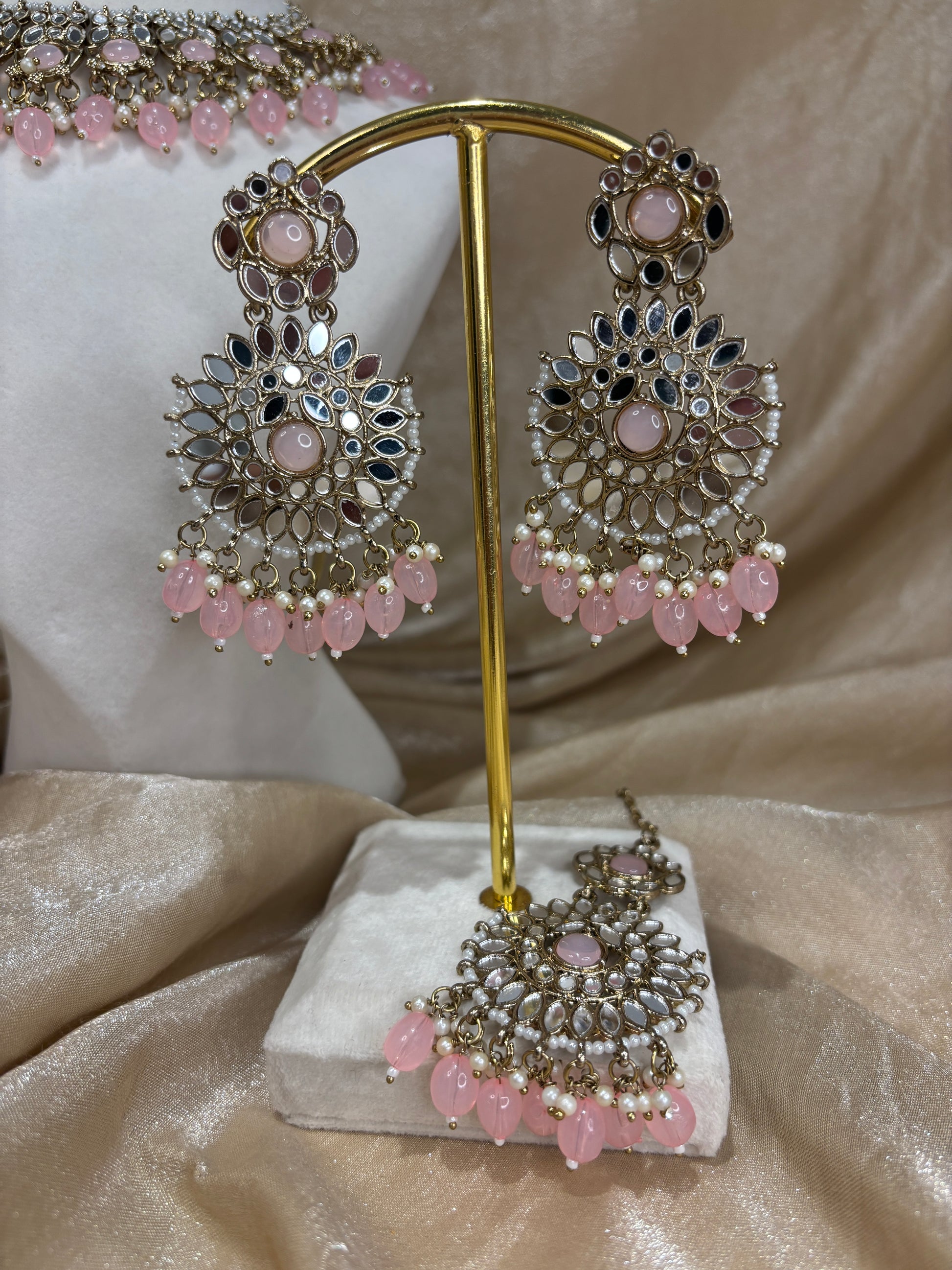 Light pink mirror work necklace with small pearl details; comes with earrings and tikka