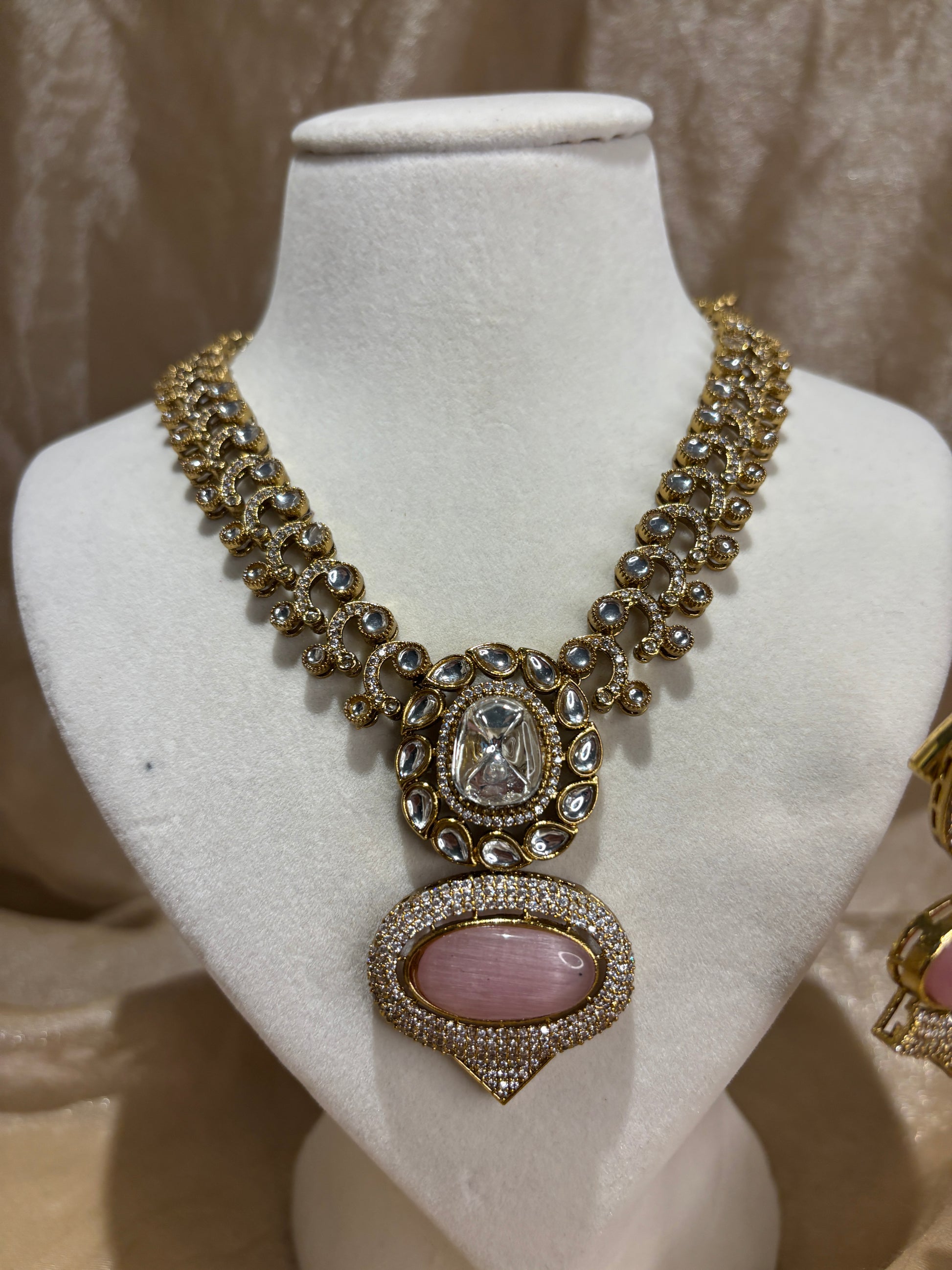 moissanite and tiyani kundan necklace set with baby pink Mona Lisa stones