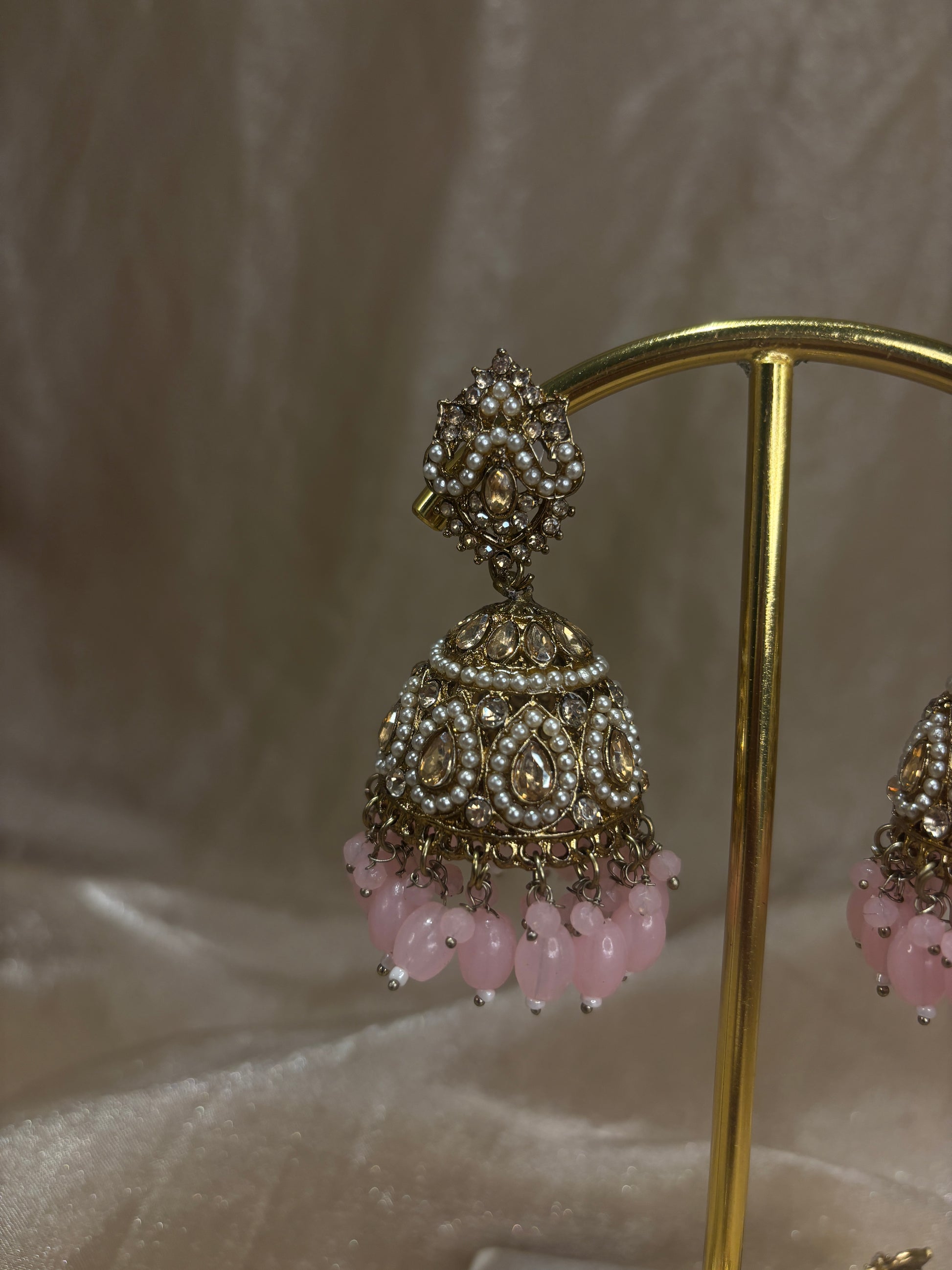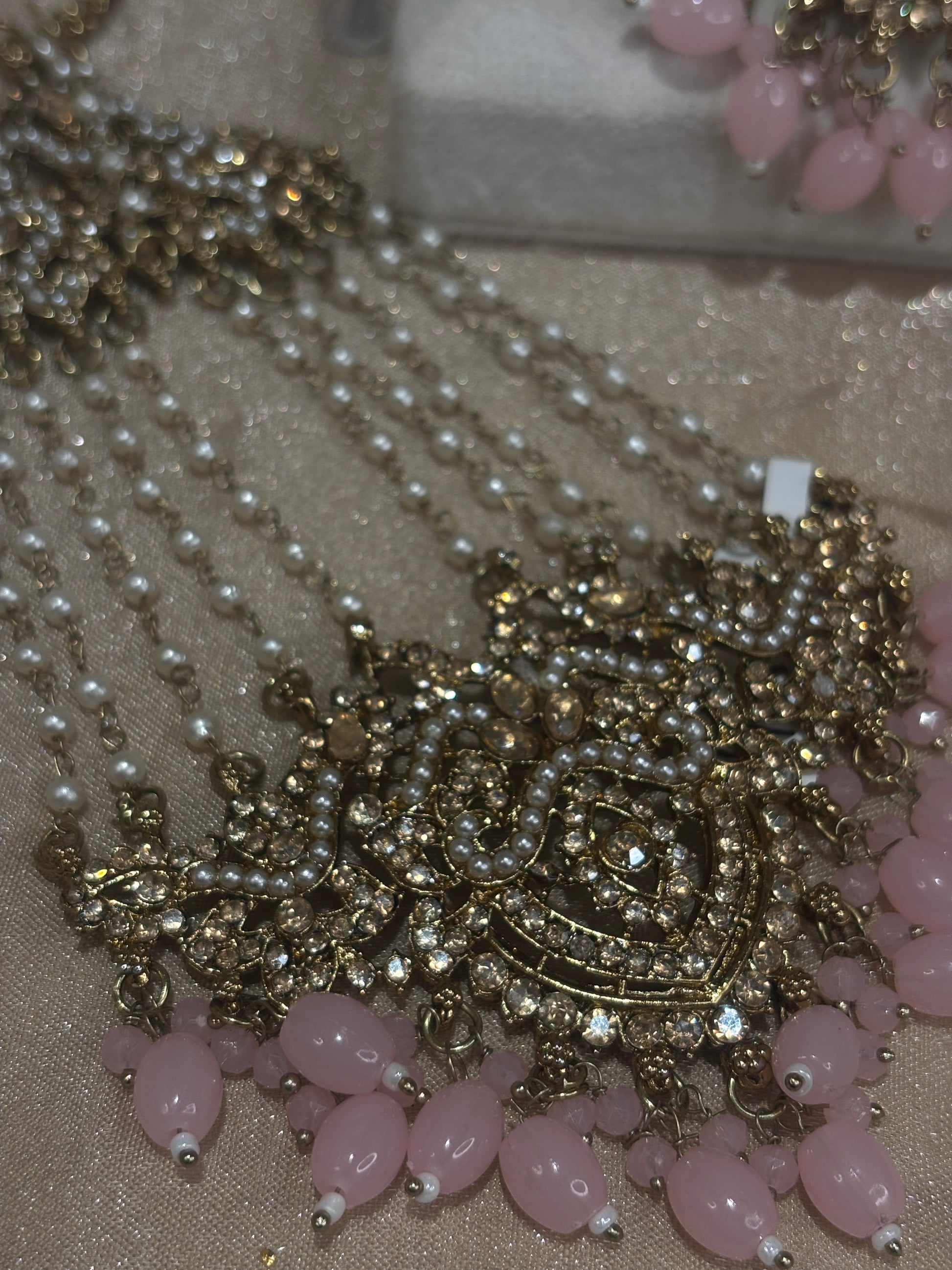 Baby pink earring, tikka, and passa set with pearl details