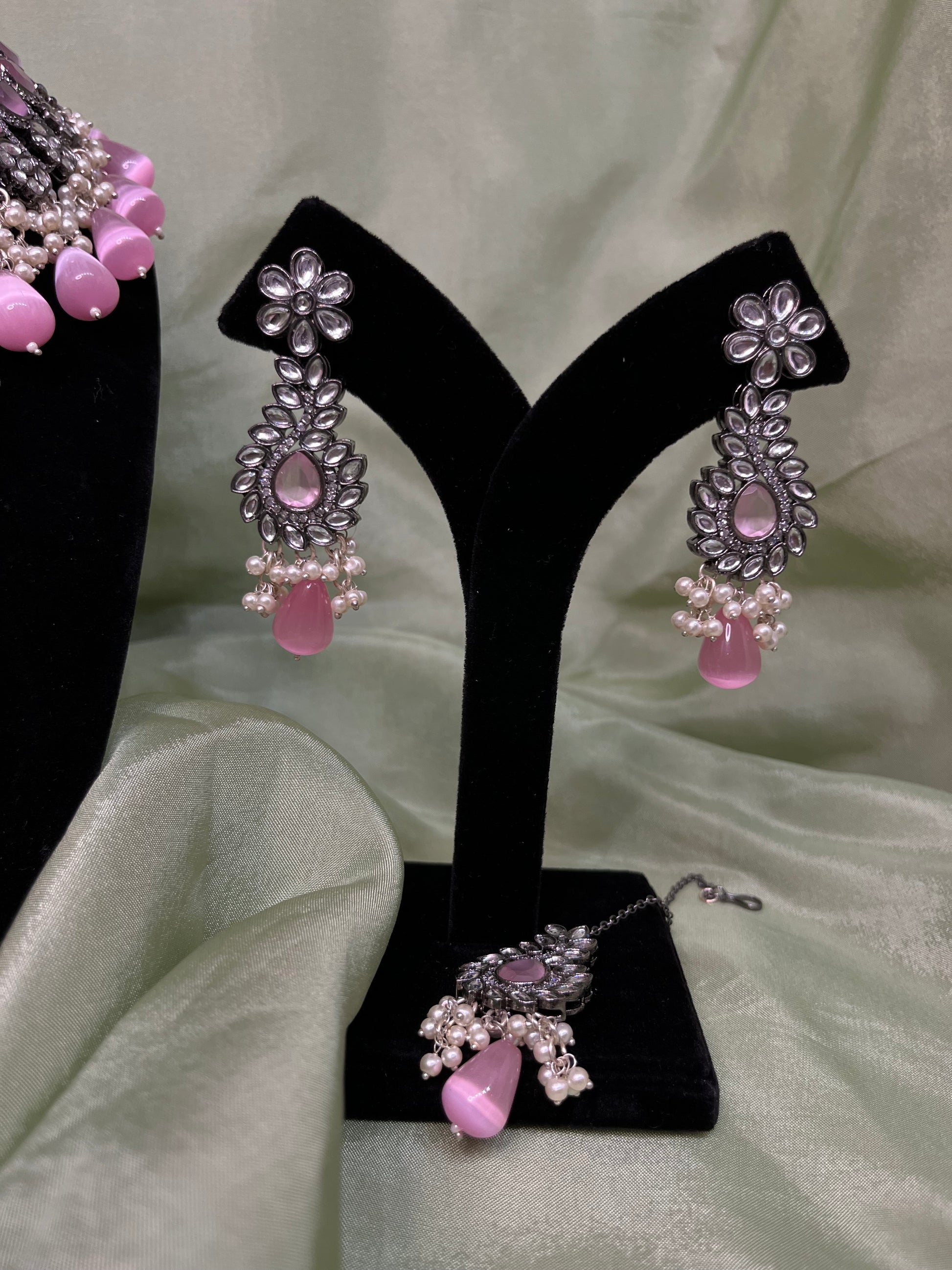 Baby pink heavy necklace with silver/black details and onyx beads.