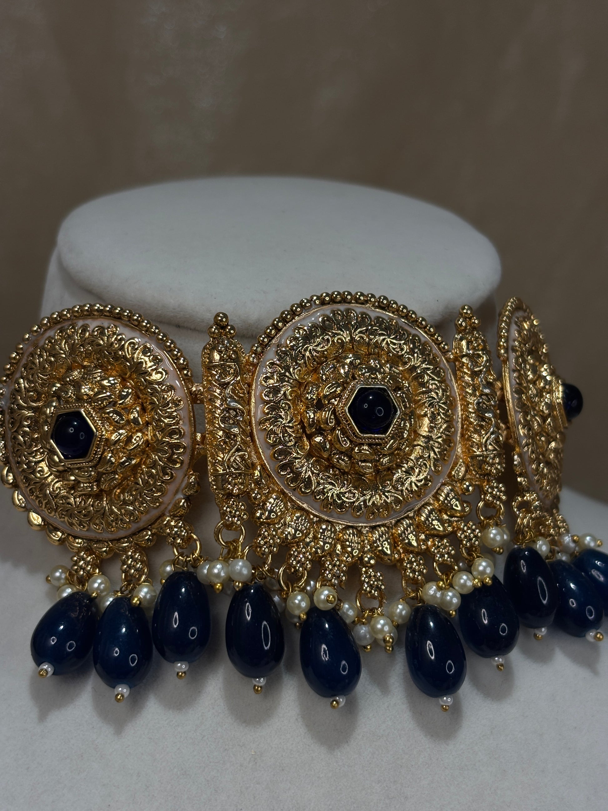 Antique gold choker in navy blue with small pearl details; comes with earrings and tikka