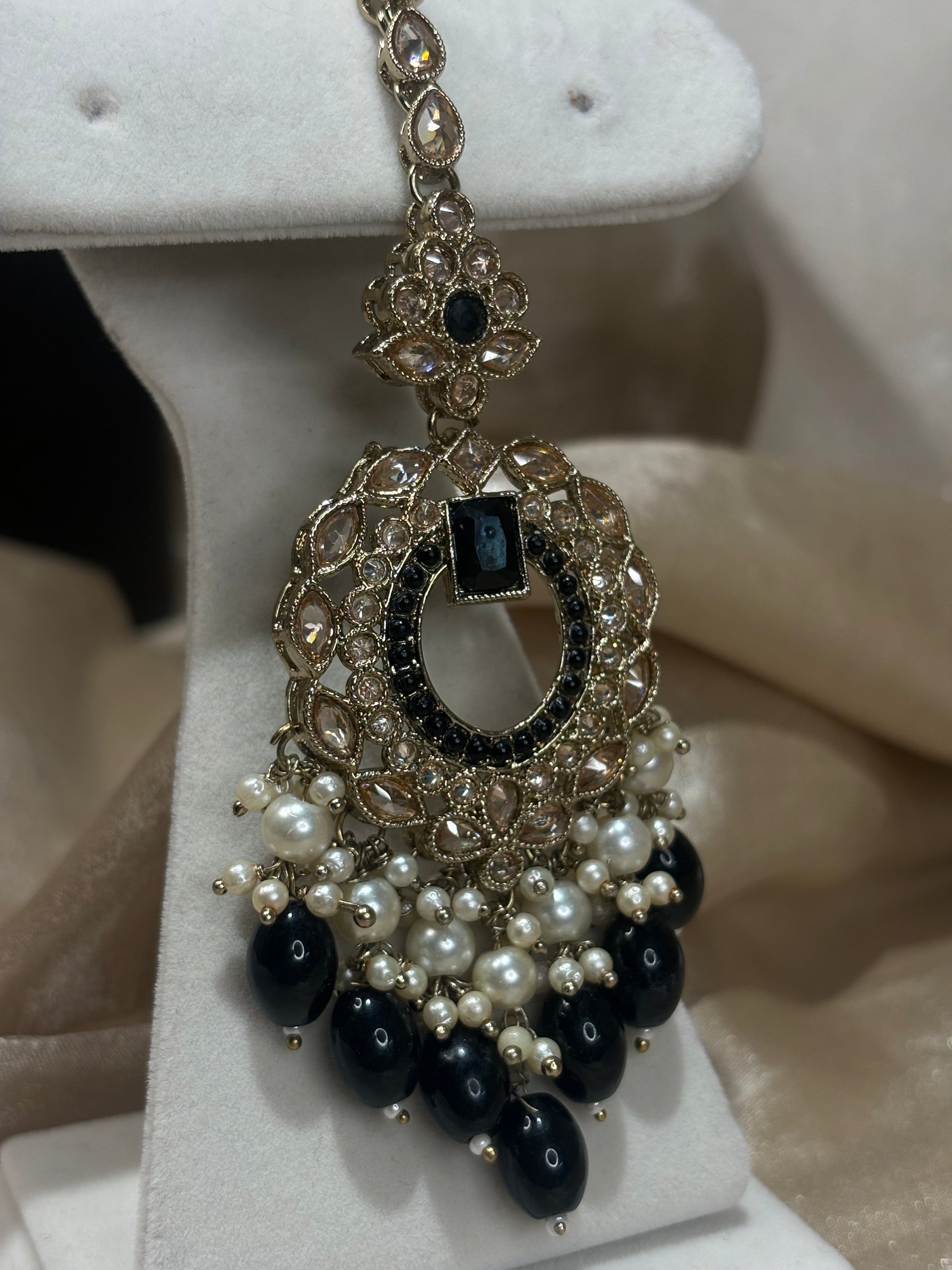 Black choker with intricate pearl details; comes with earrings and tikka.
