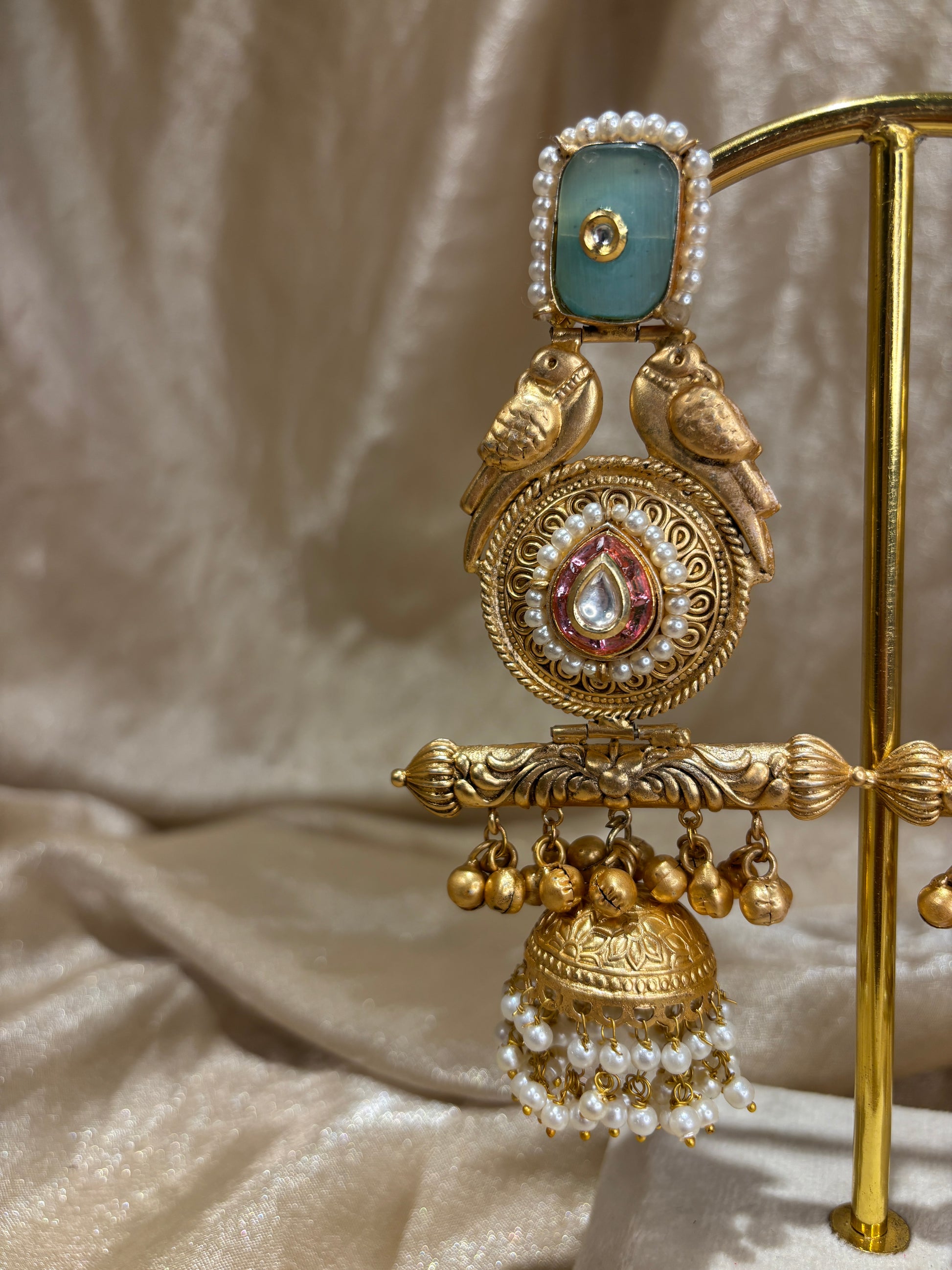 baby blue and baby pink statement earrings with 92.5 sterling silver base; with bells/ghungroos and bird details