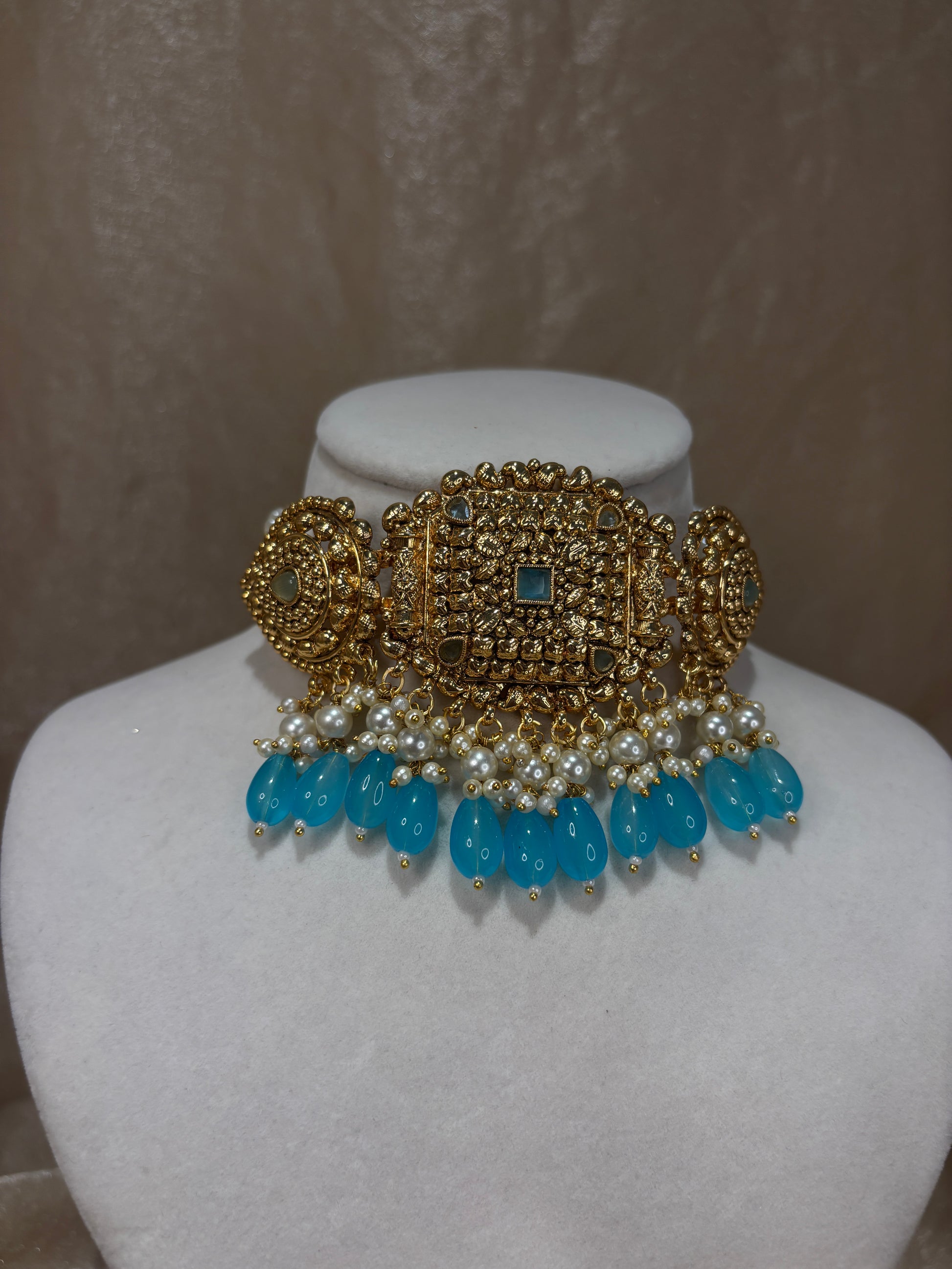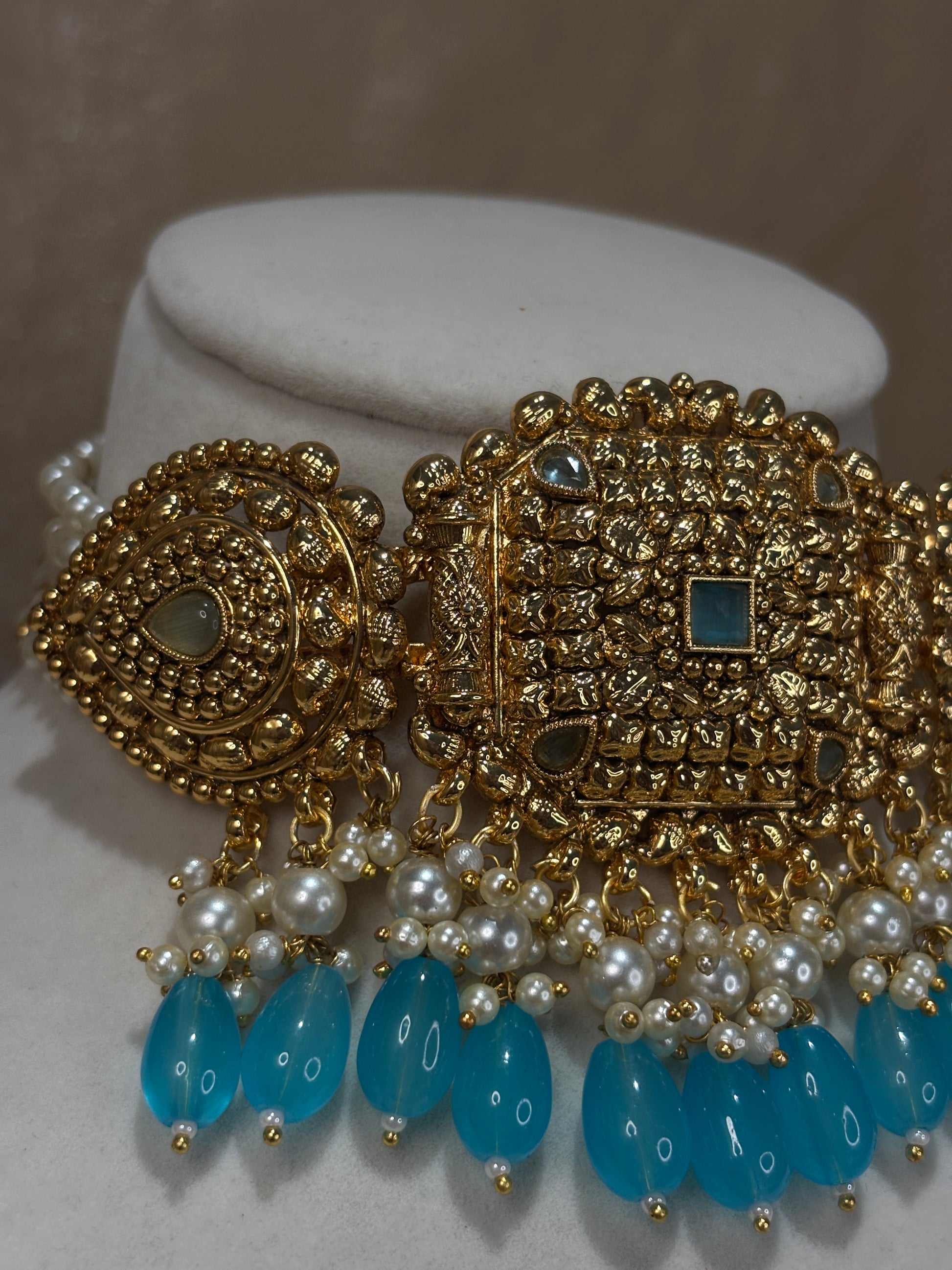 Antique gold choker in blue with small pearl details; comes with earrings and tikka