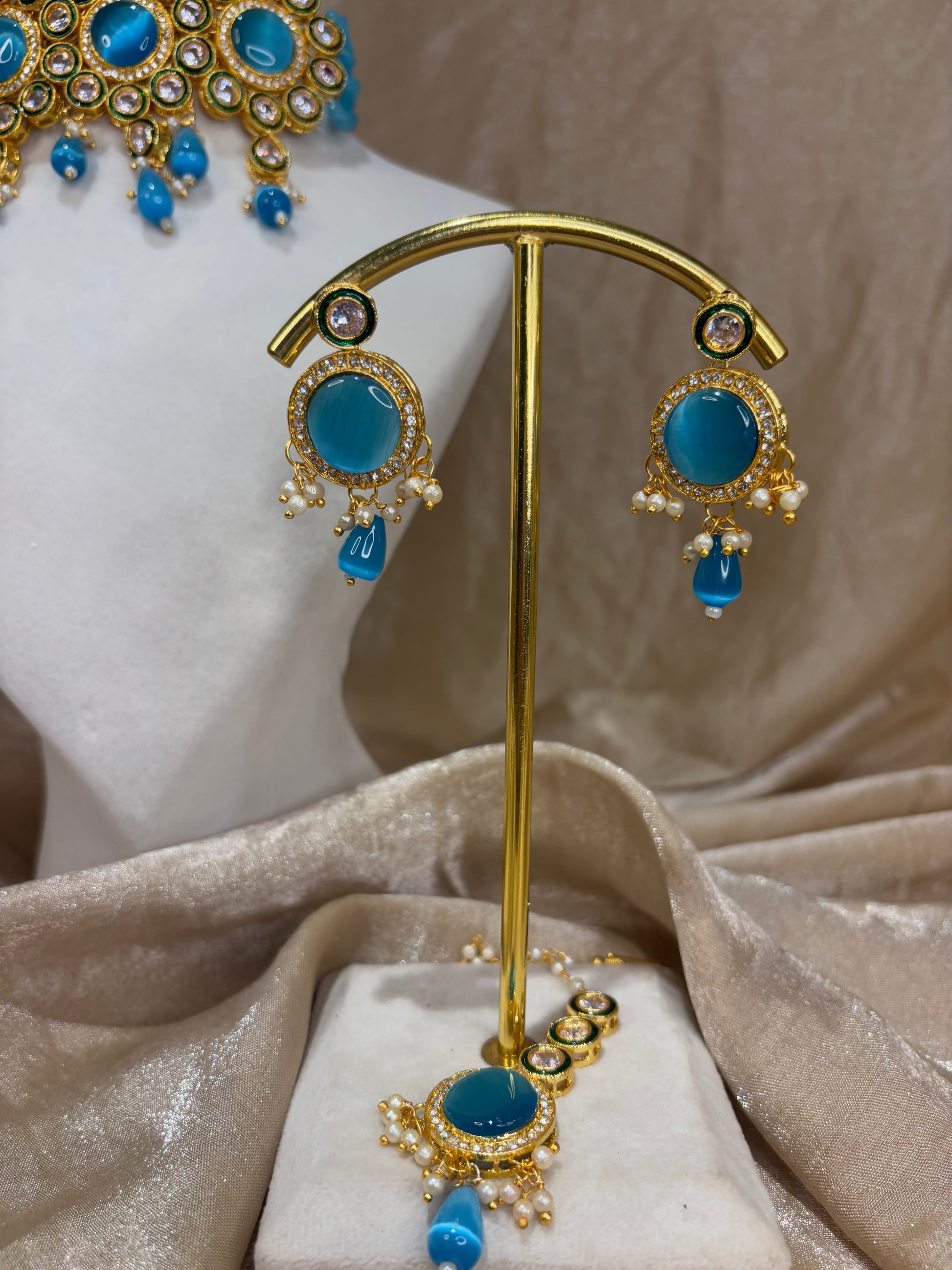 Sky blue/frozi choker with pearl details; comes with earrings and tikka