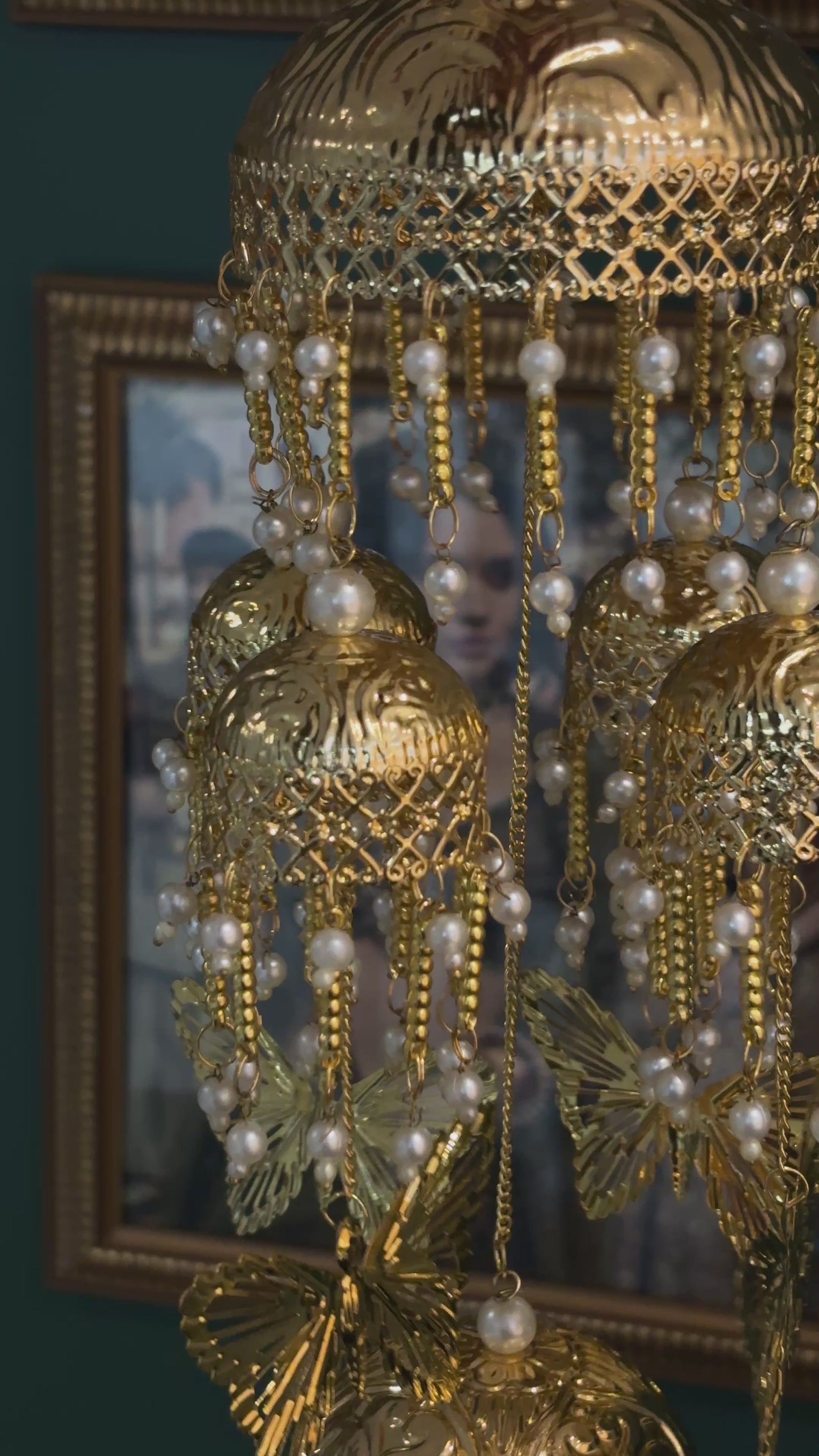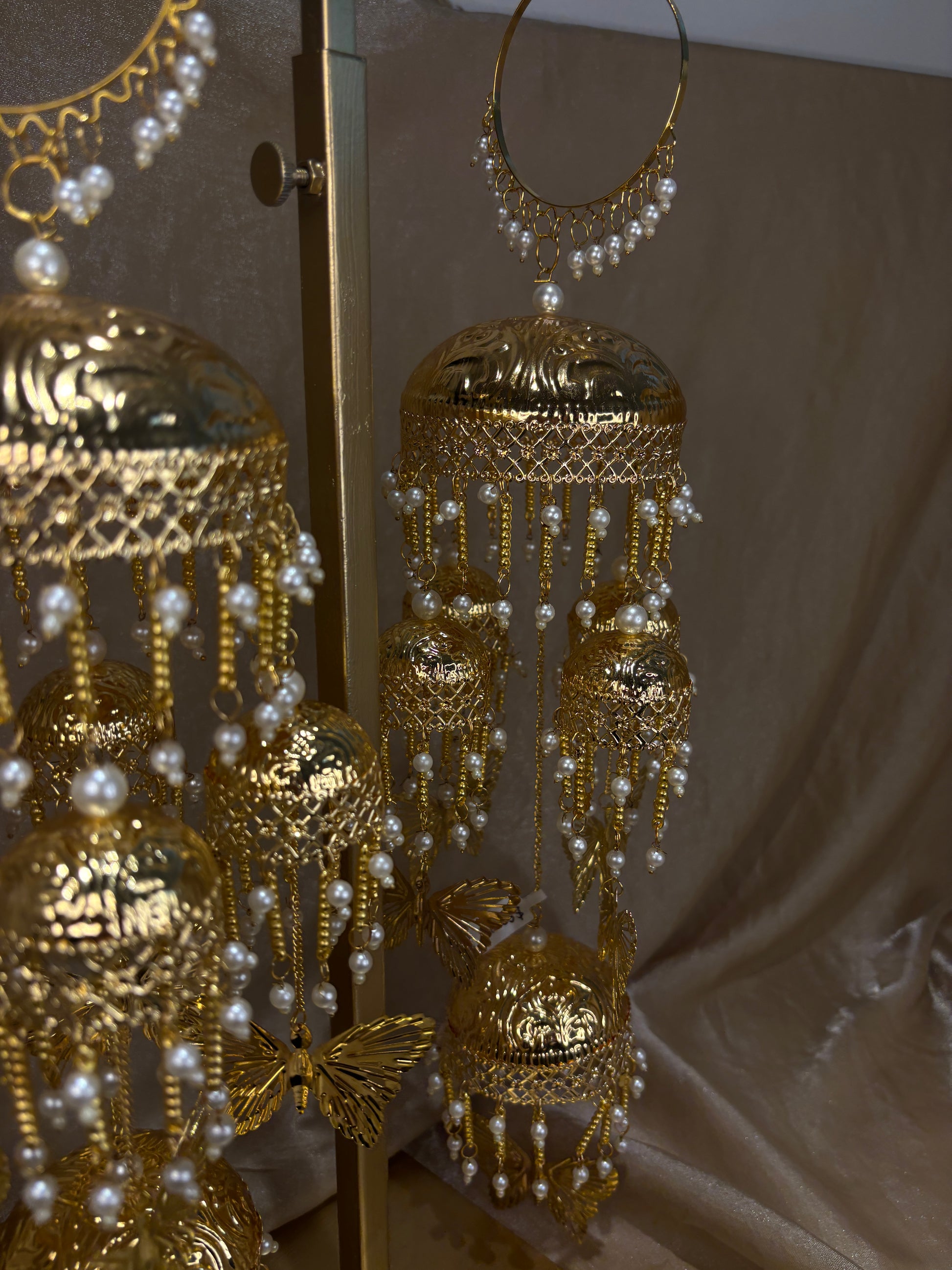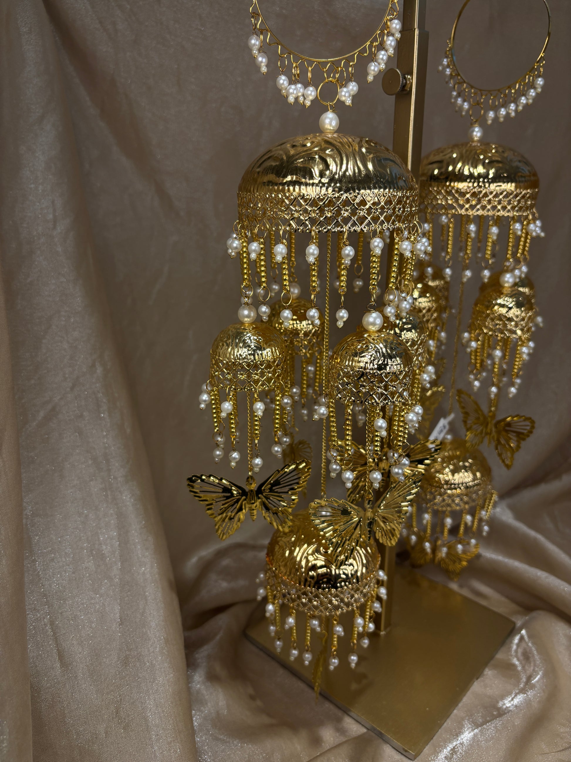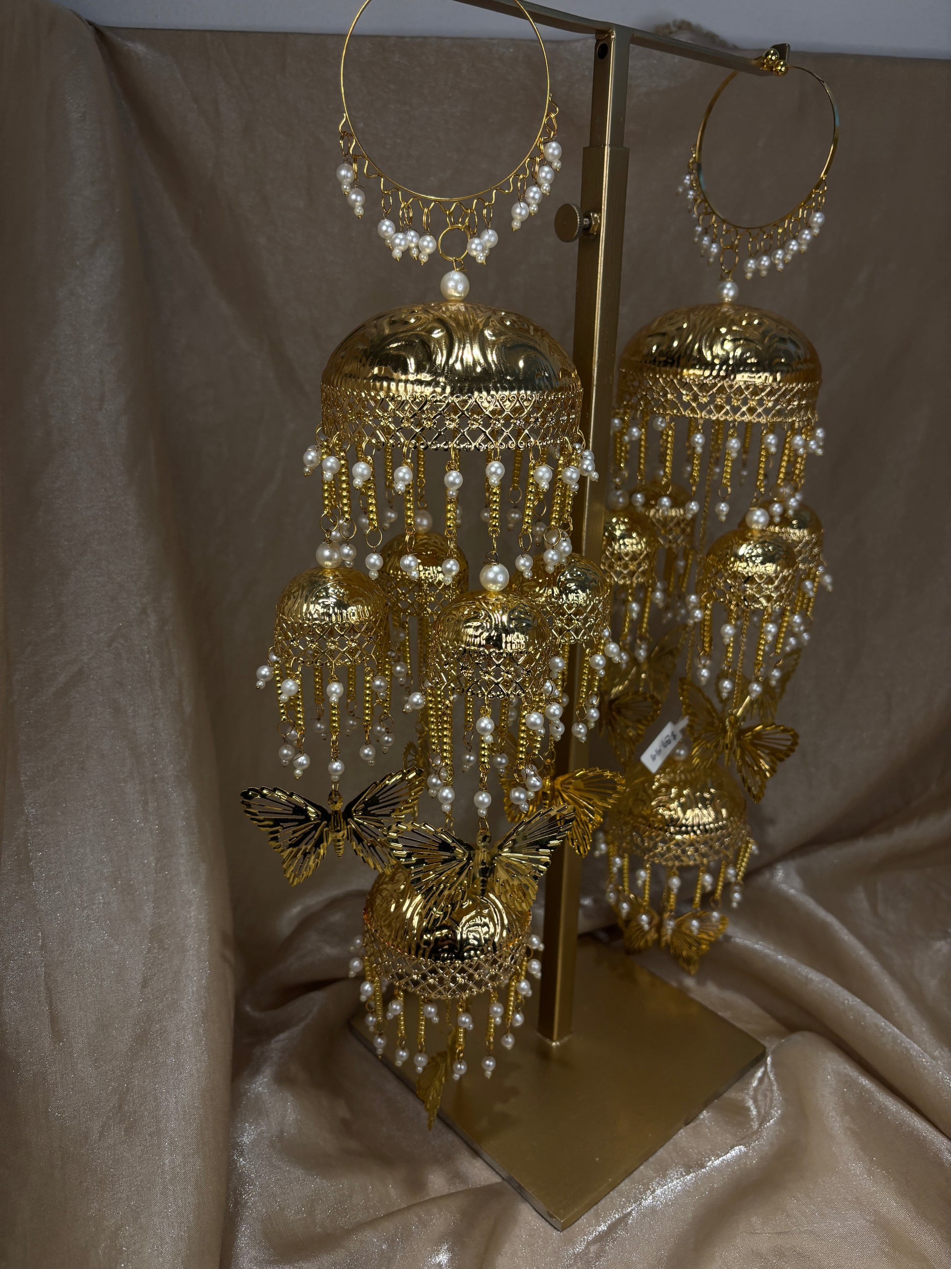 Large butterfly detail pipal Patti kalire with pearl details; comes with adjustable bangle to attach to wrist. About 14 inches long