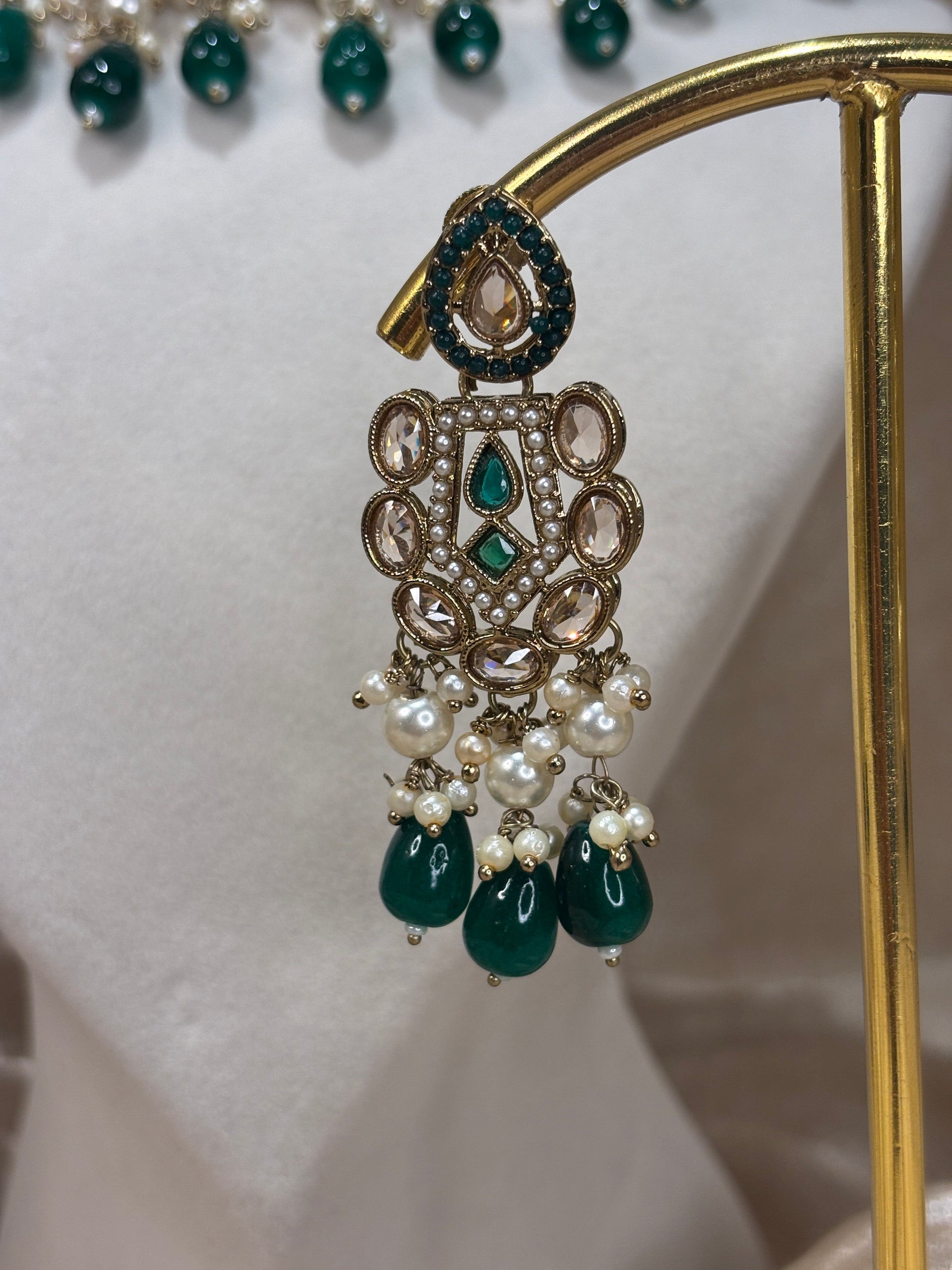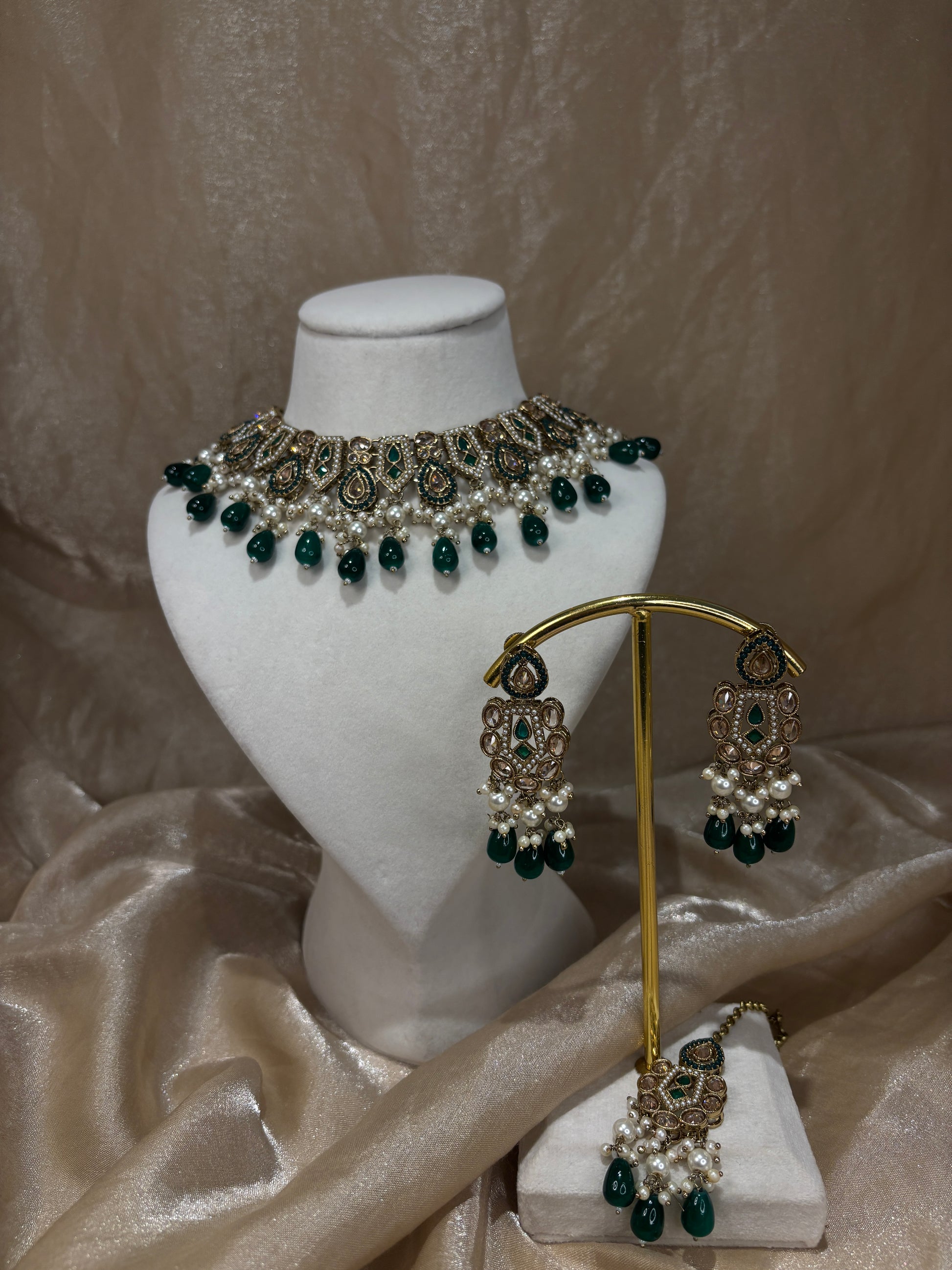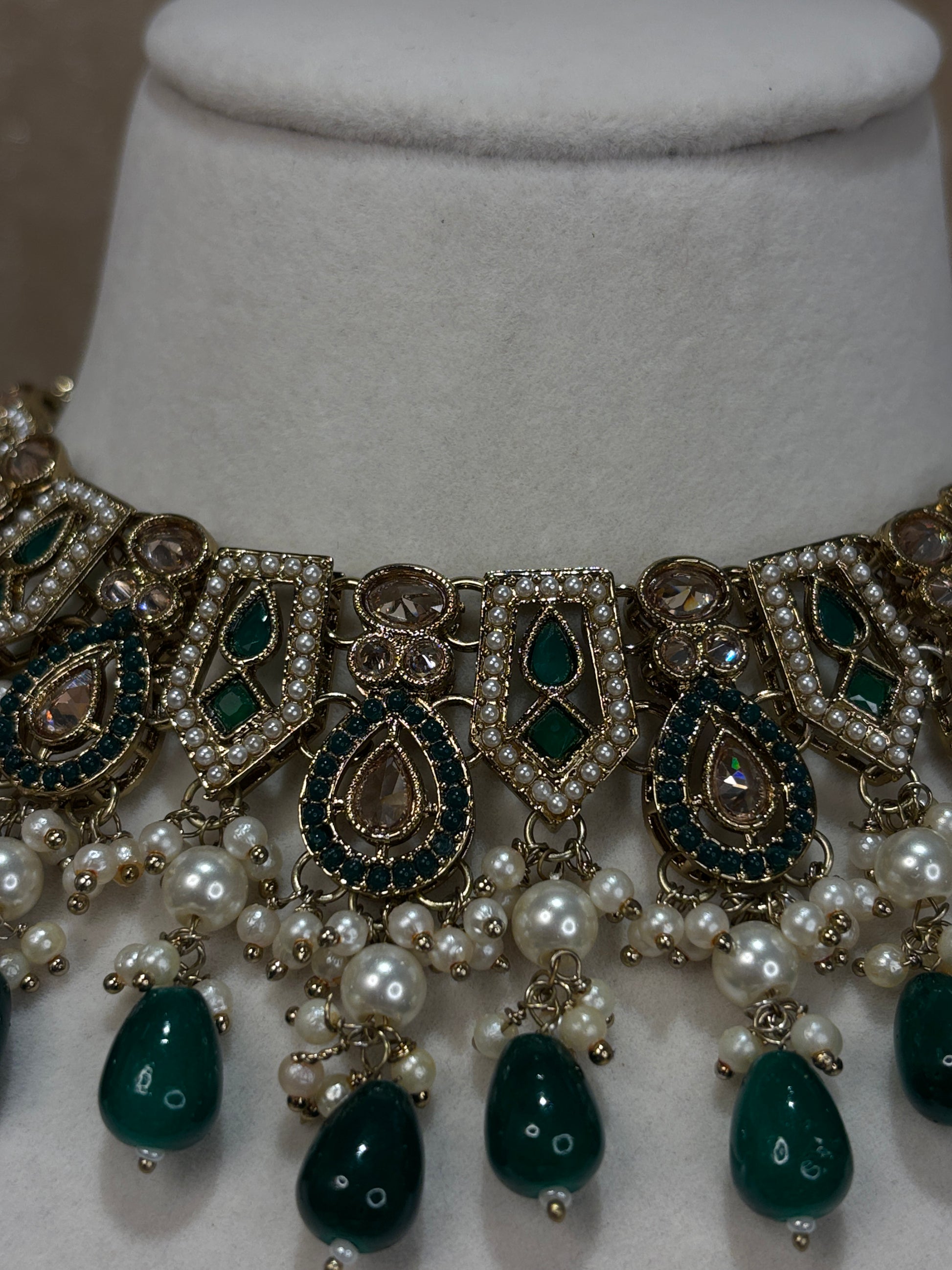 Emerald green necklace with intricate pearl details; can be worn as choker or necklace