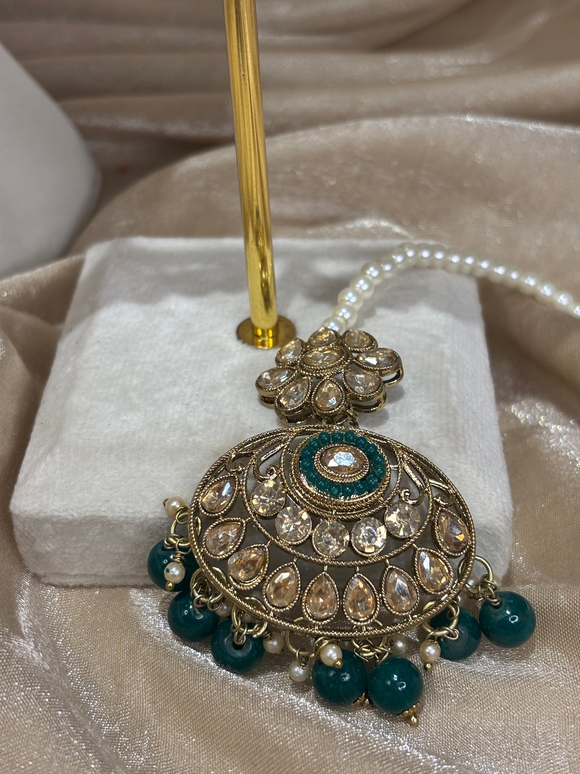Vibrant emerald green necklace with small pearl details; comes with earrings and tikka