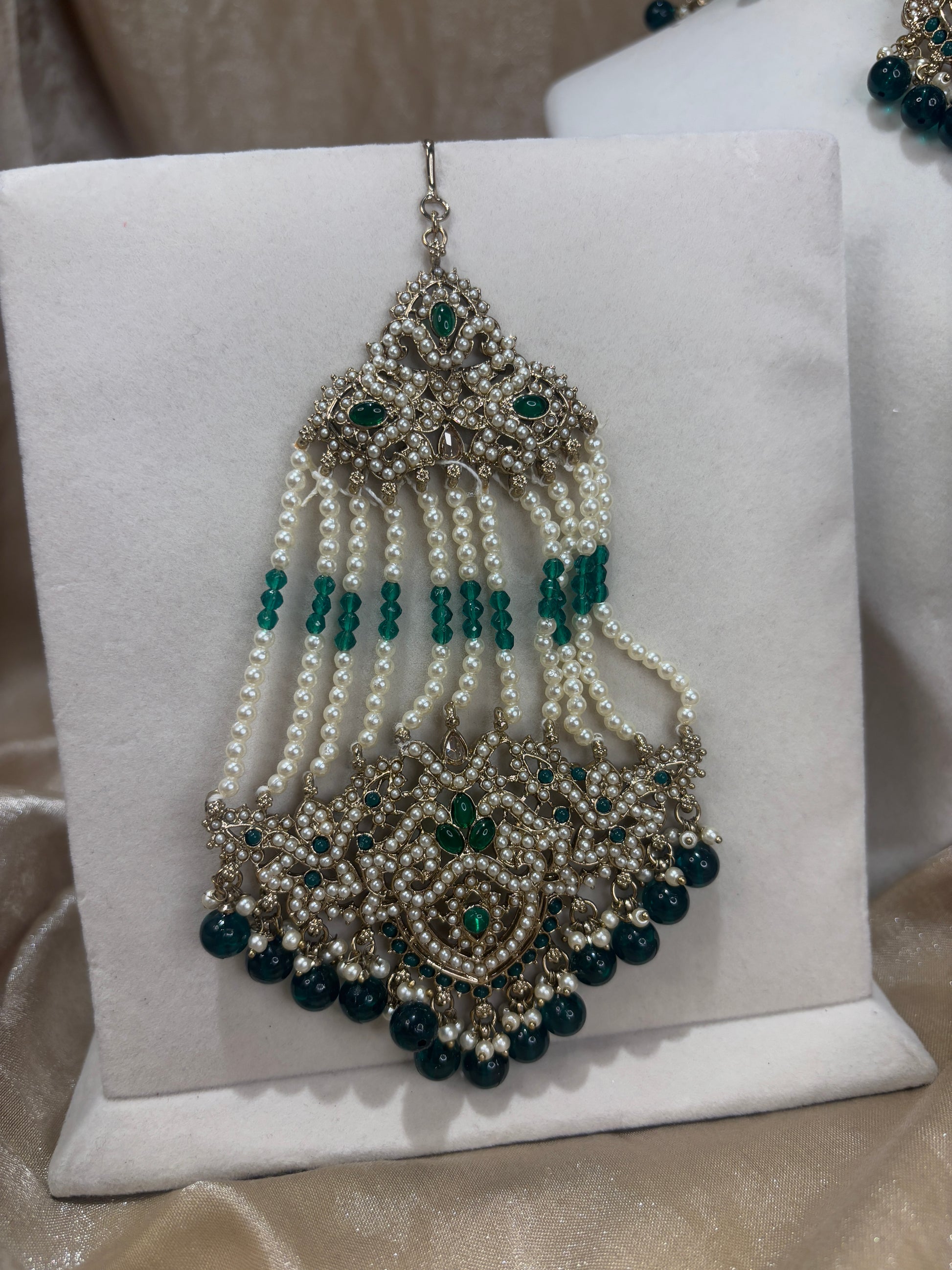 emerald green choker set with pearl details; comes with earrings tikka and passa