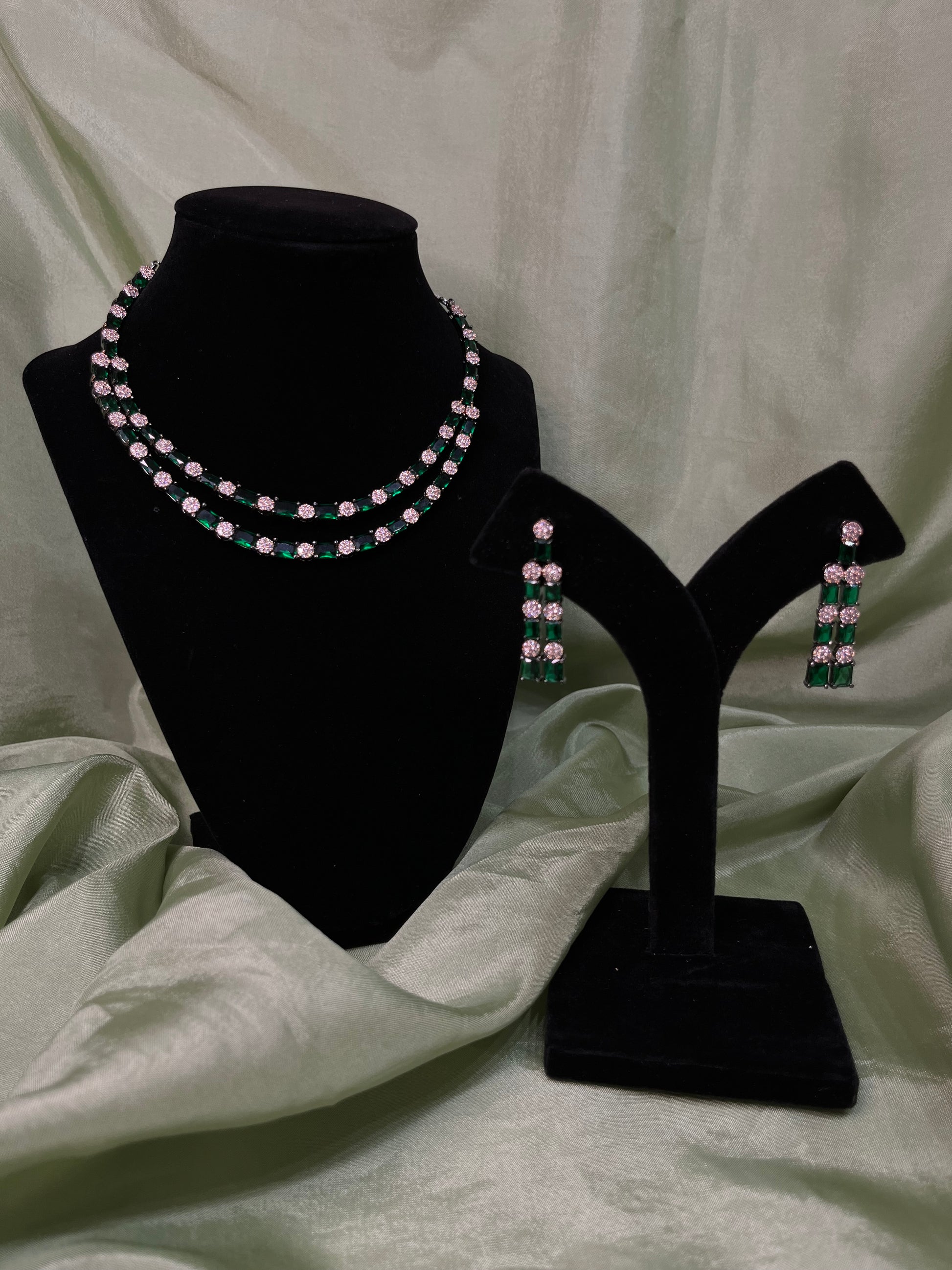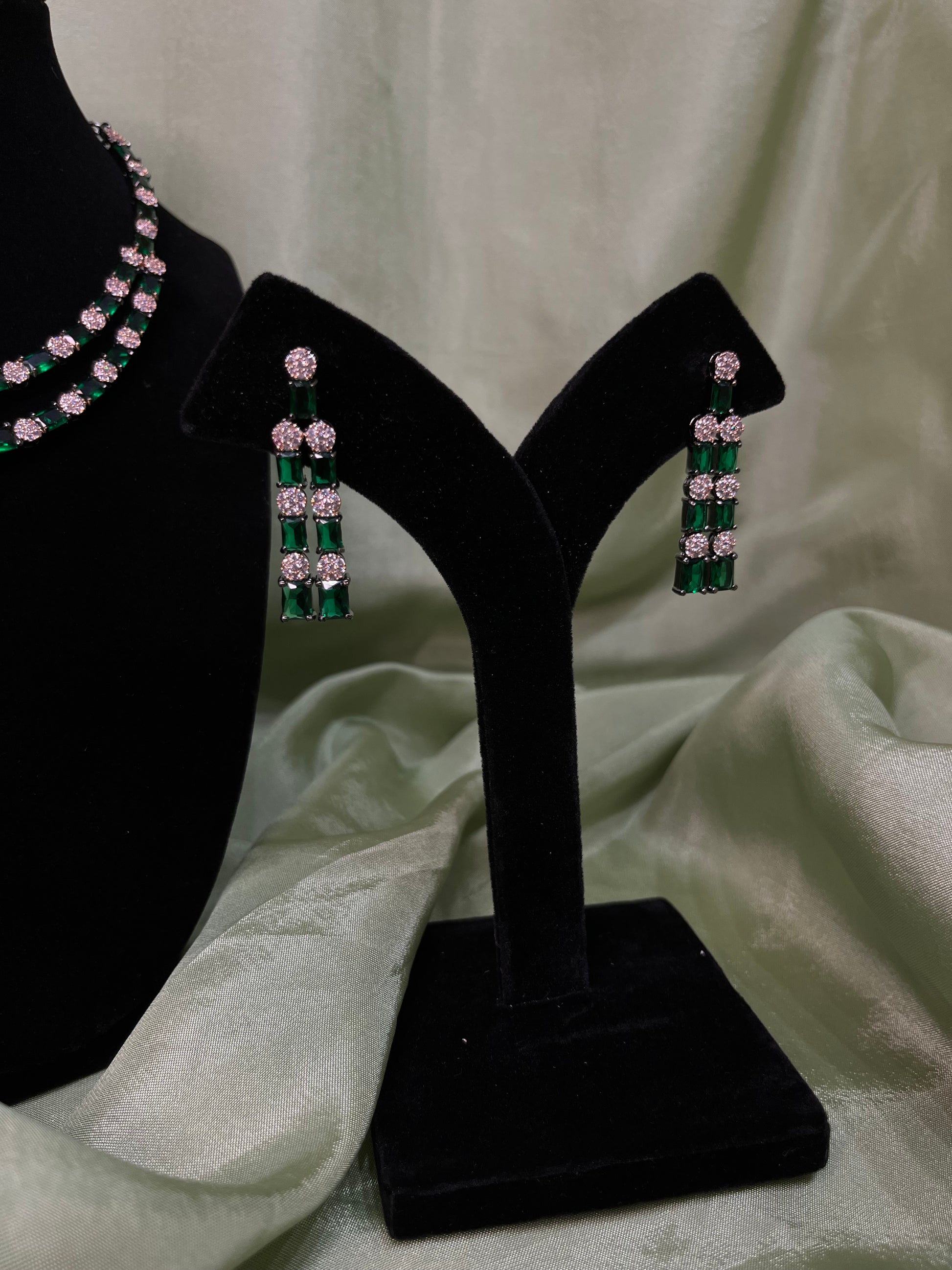 Emerald green necklace in American diamond with rose gold hues; comes with dangling earrings.