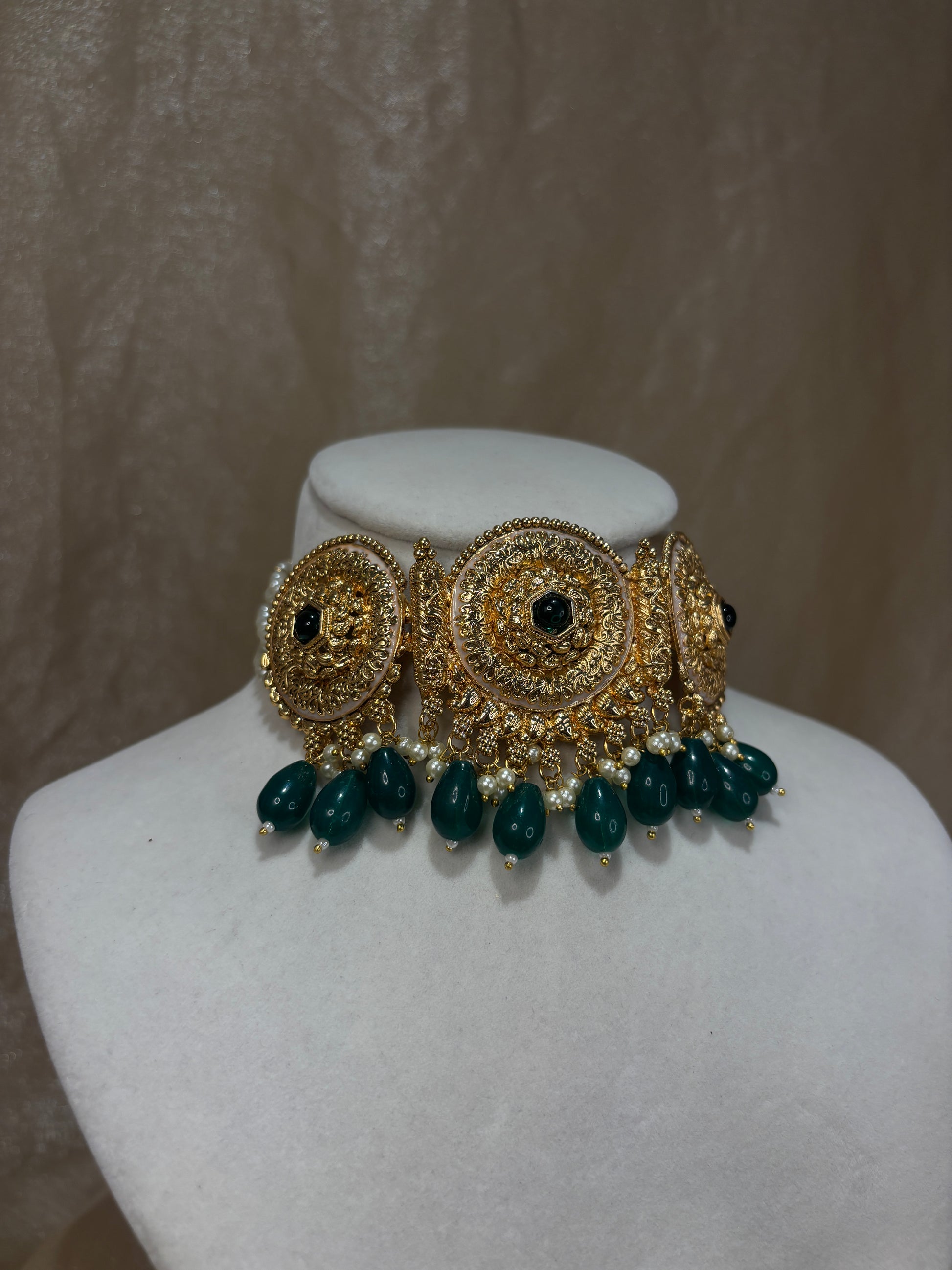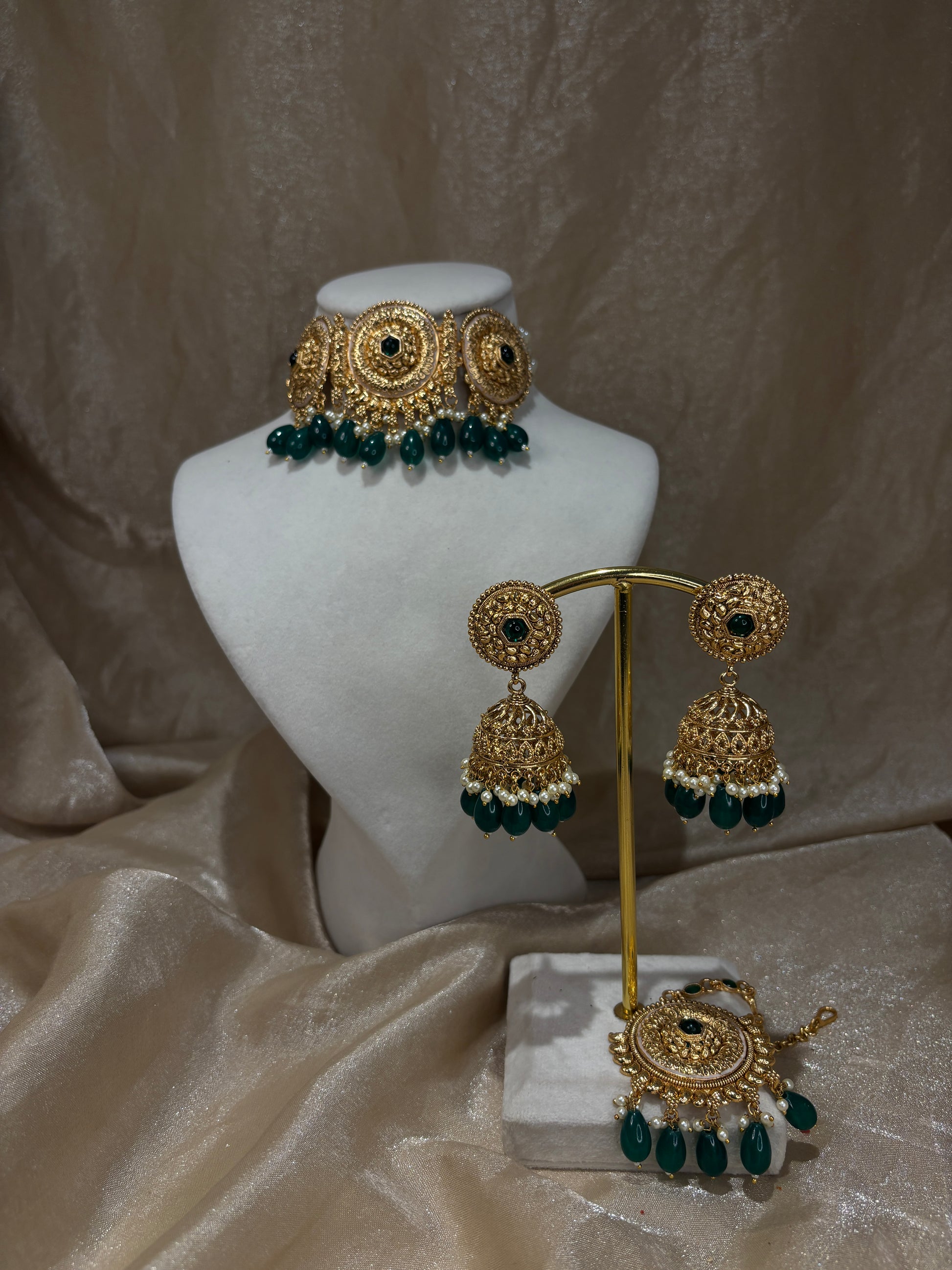 Antique gold choker in emerald green with small pearl details; comes with earrings and tikka