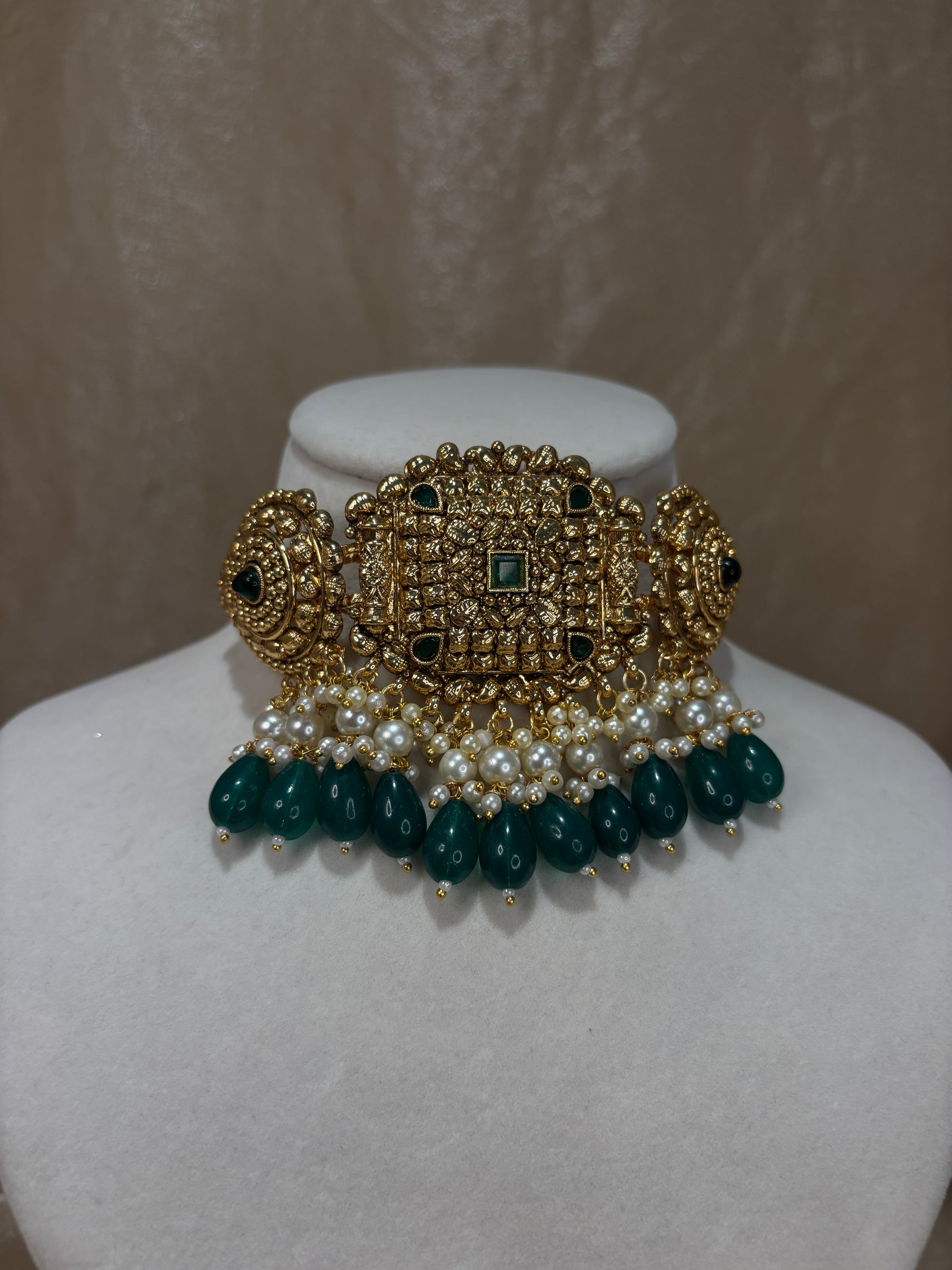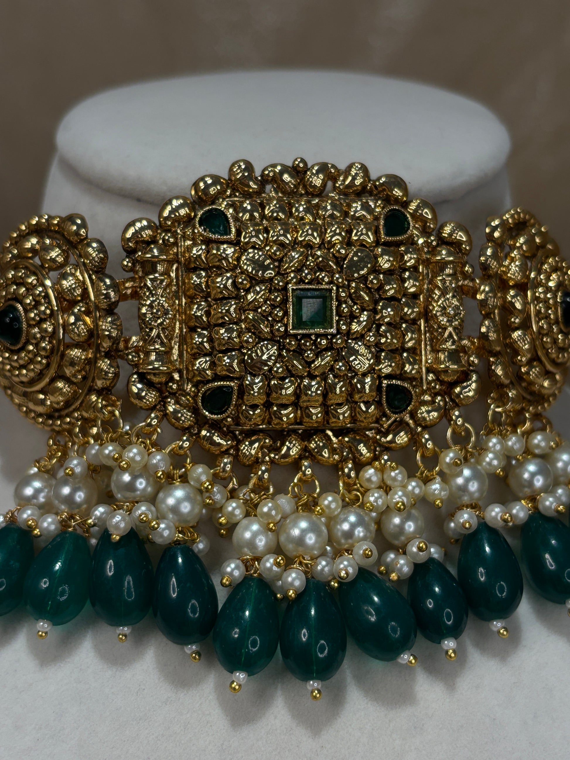 Antique gold choker in emerald green with small pearl details; comes with earrings and tikka