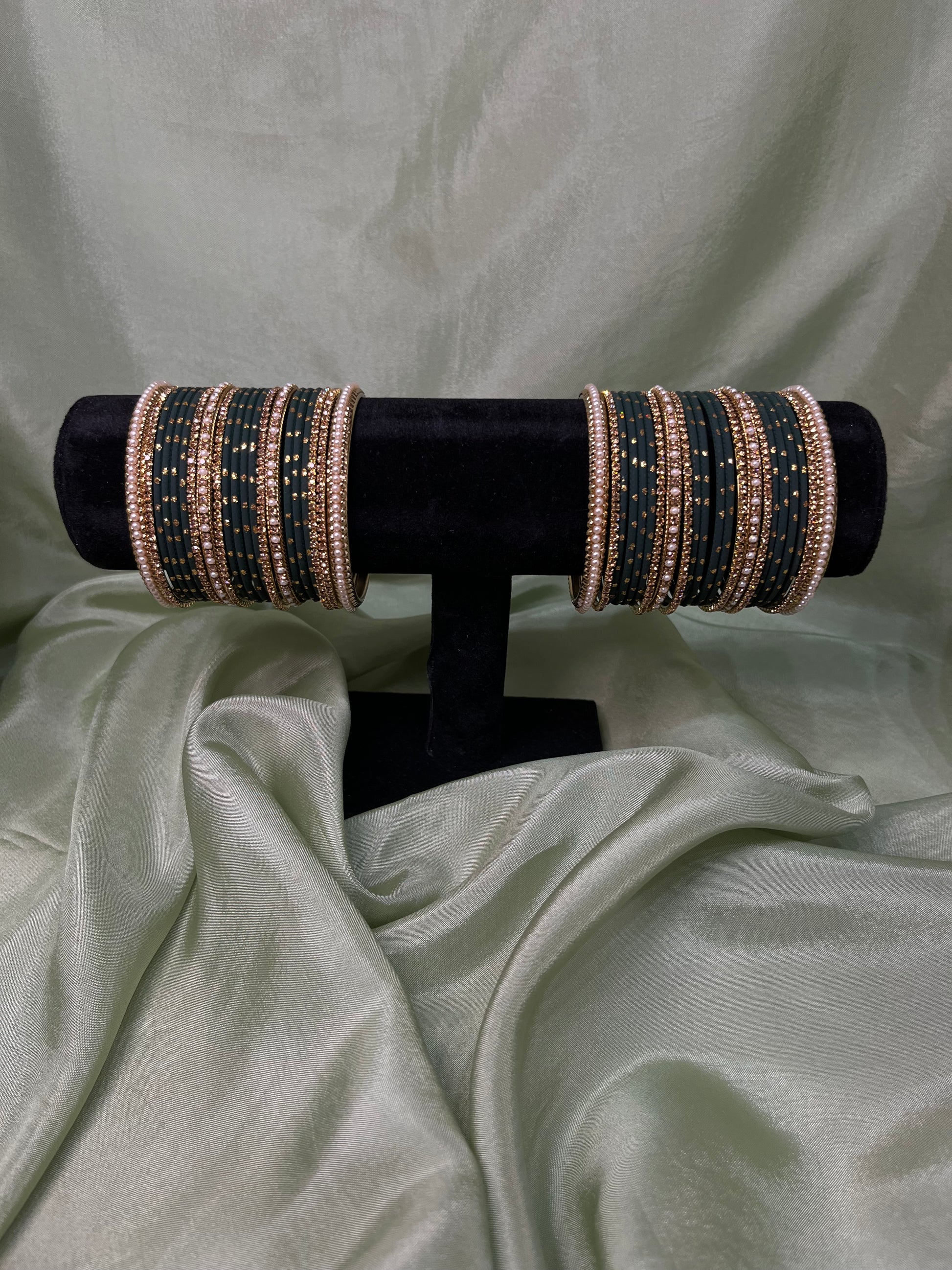 Emerald green bangles with bindi details and pearl kare. Set contains bangles for both hands.