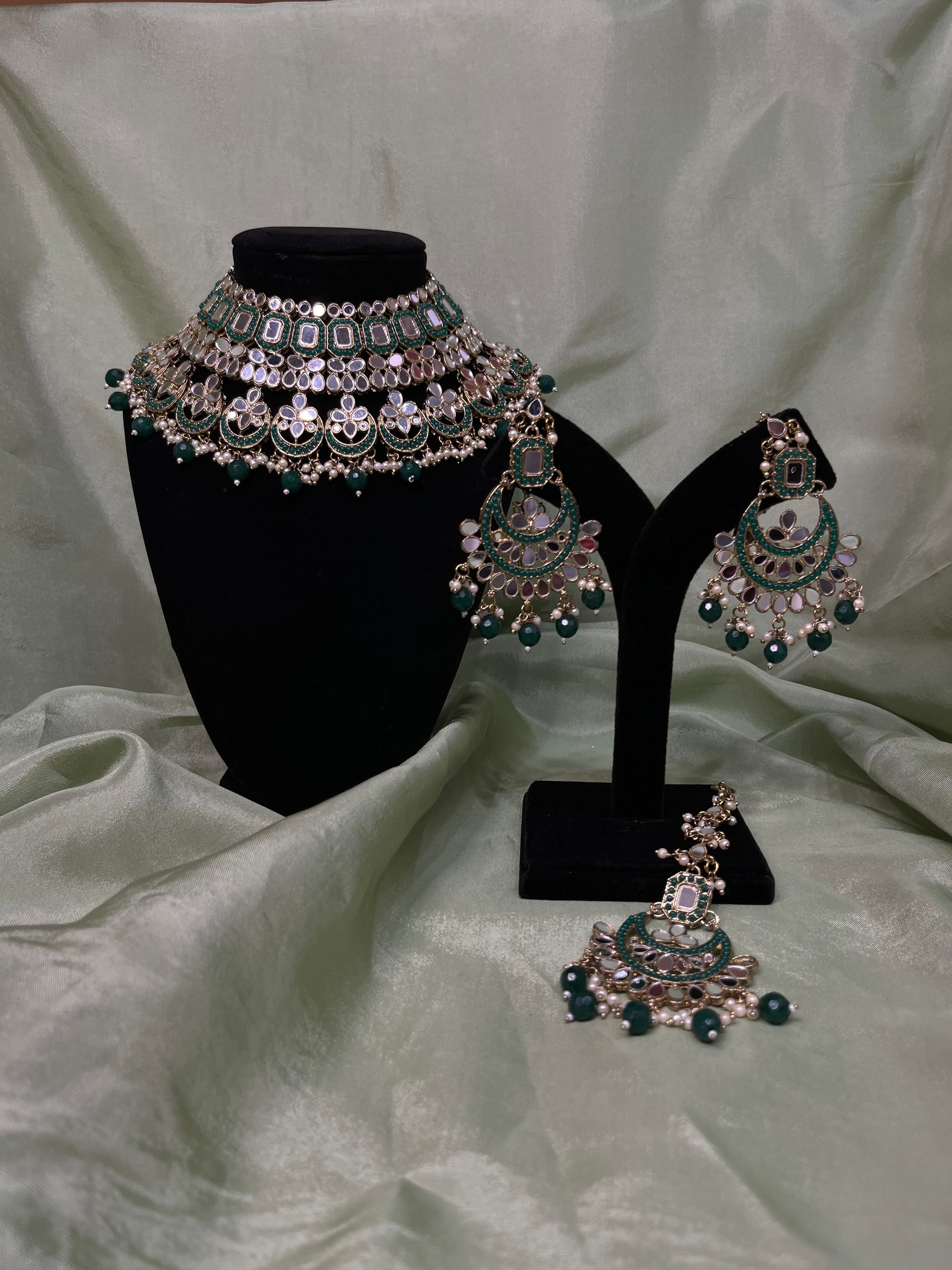 Heavy emerald green mirror work set; comes with Sahara earrings and tikka