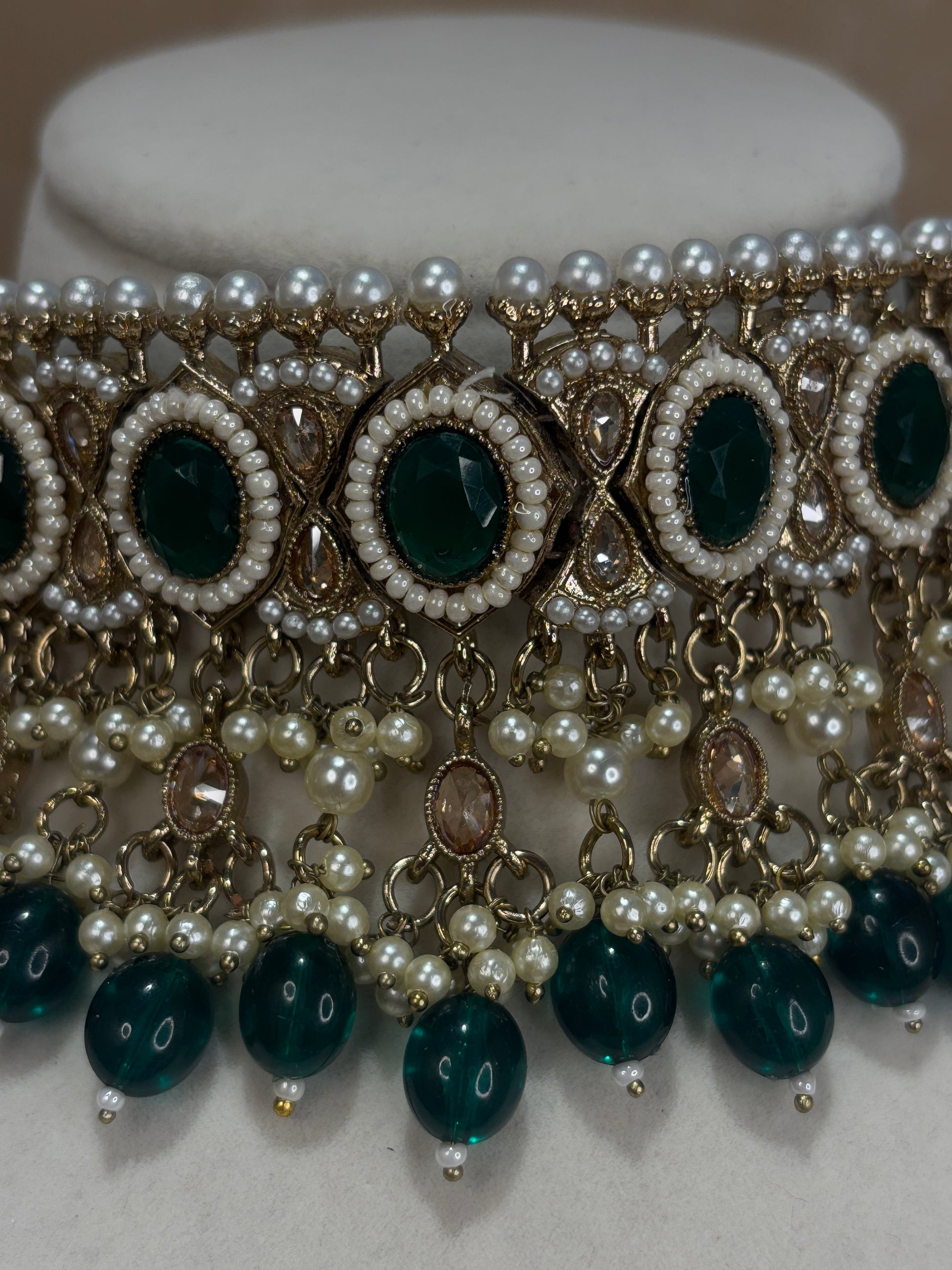 Emerald green chokier with pearl details; comes with earrings and tikka