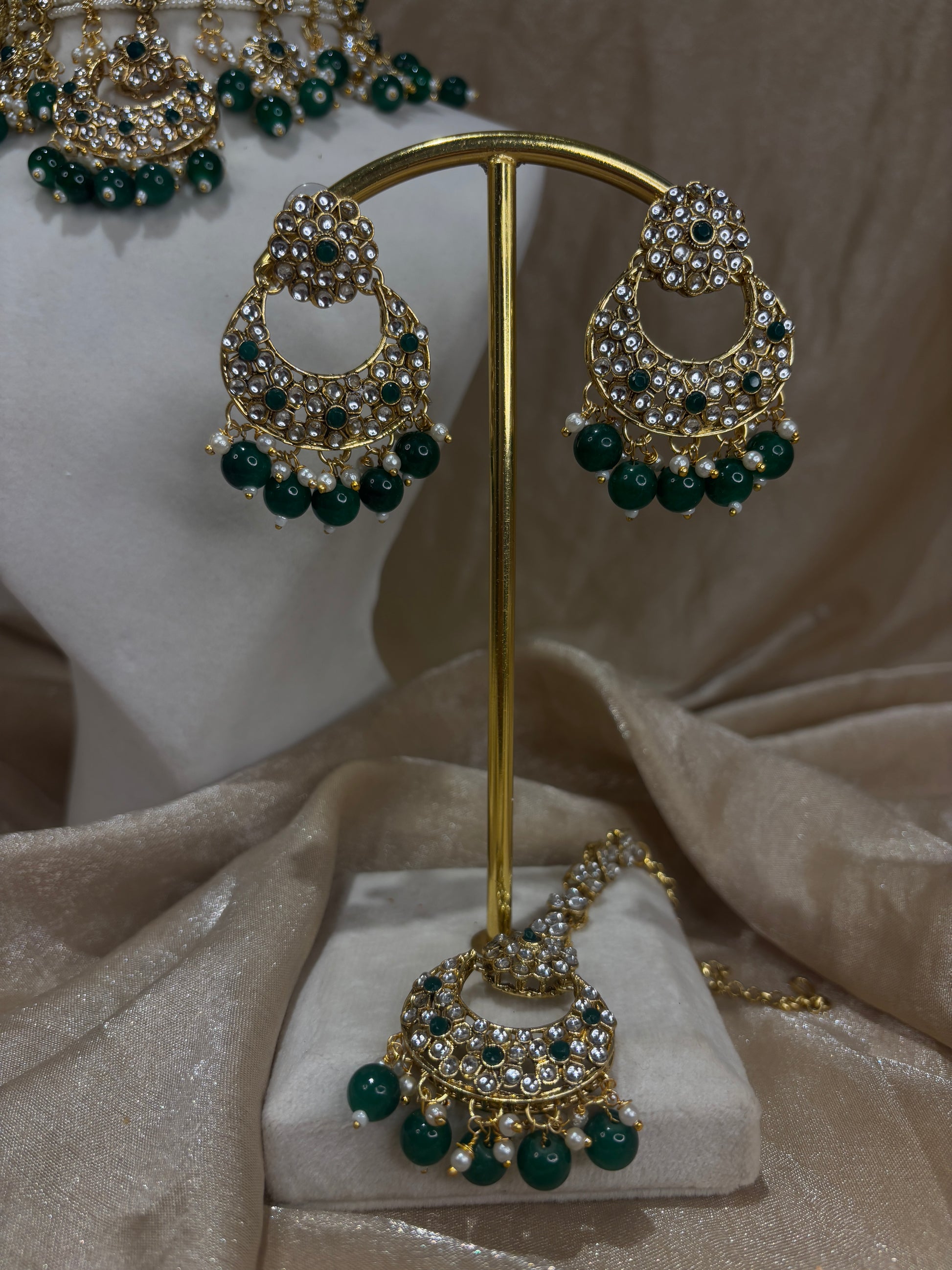 Emerald green kundan choker set with pearl details; comes with earrings and tikka