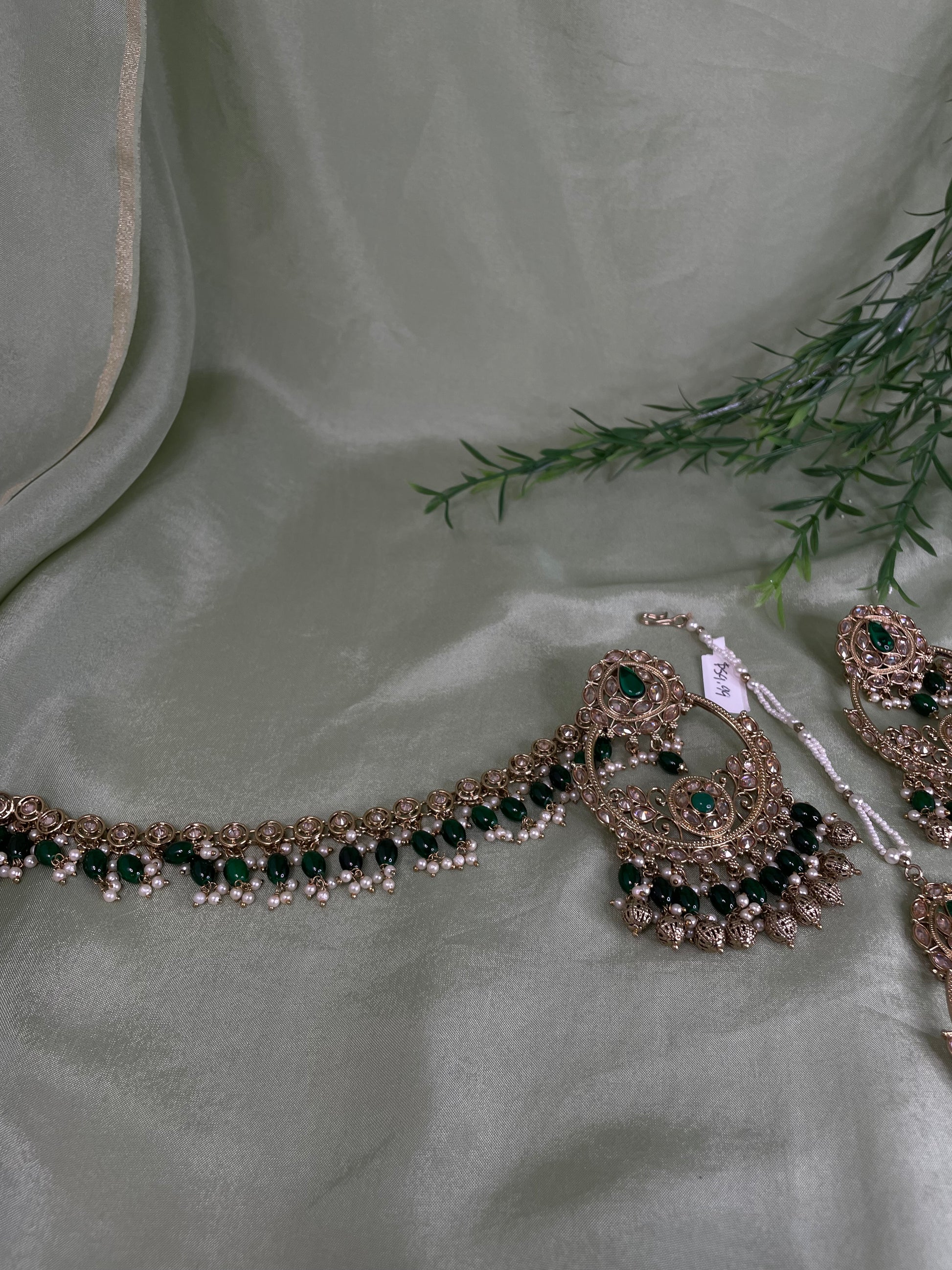 Emerald green earrings with heavy sahare and pearl details, comes with tikka