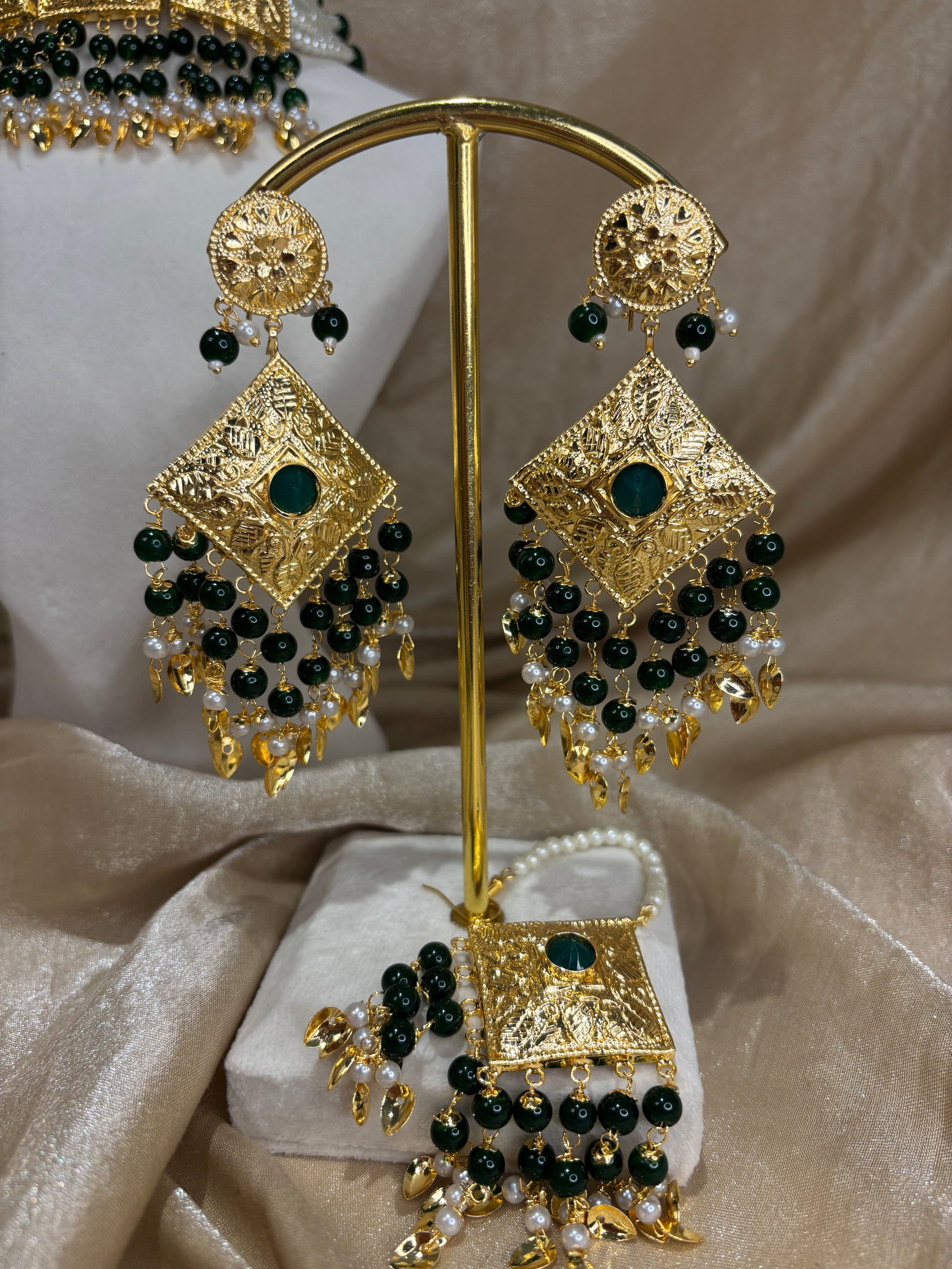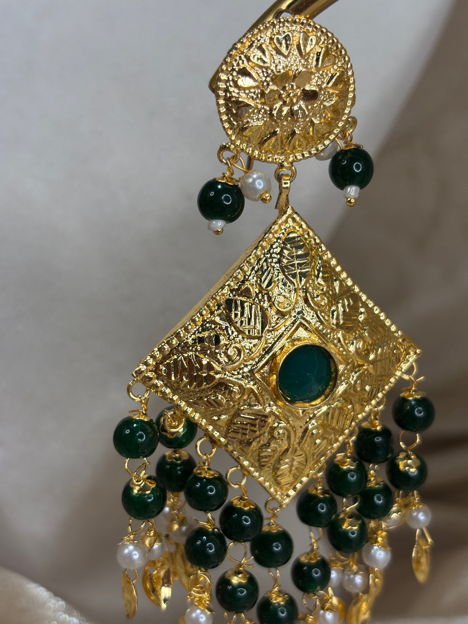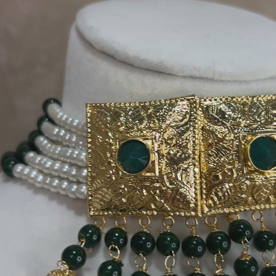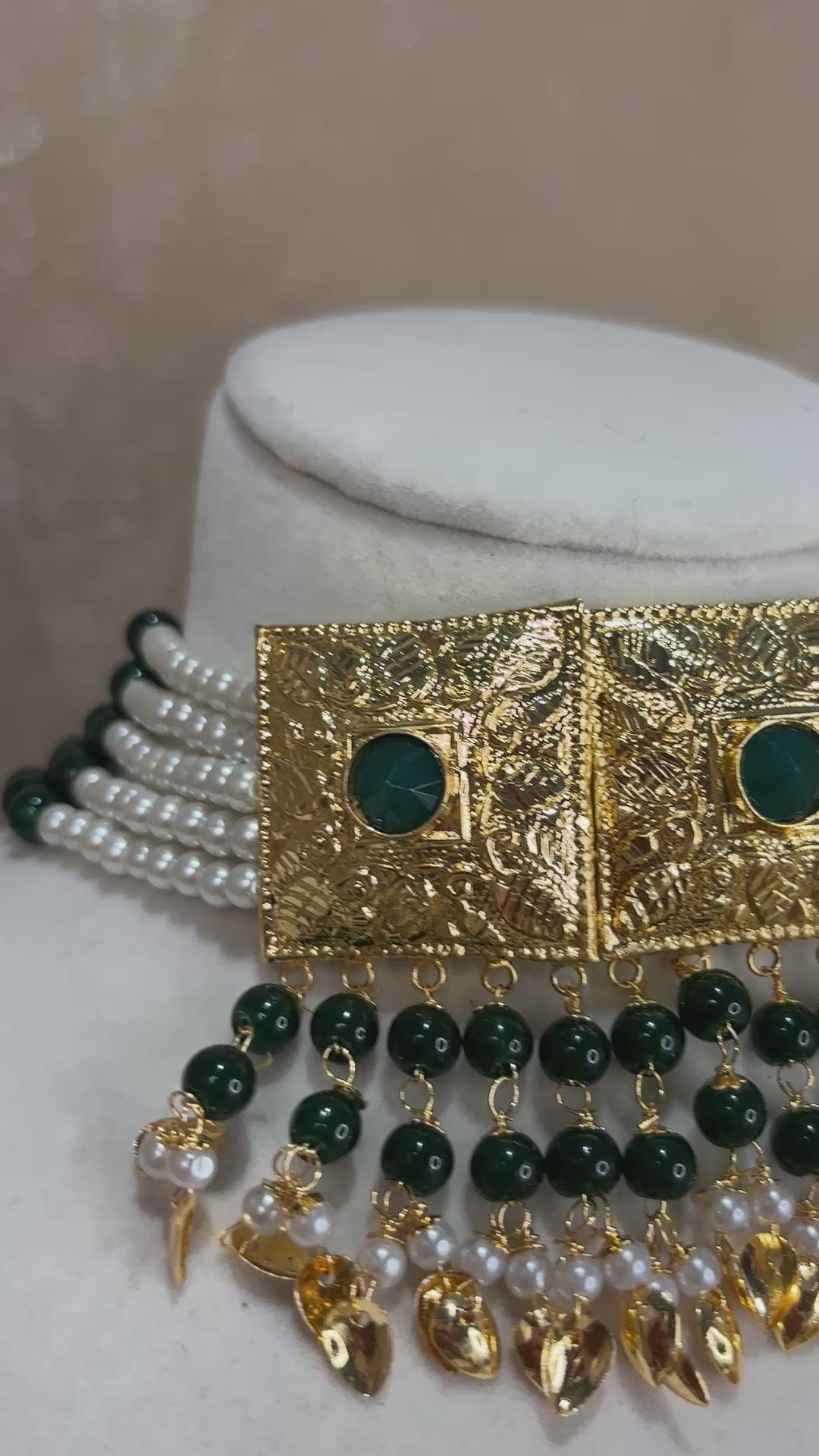 Deep emerald green jadau choker set in yellow gold. with pearl details; comes with earrings and tikka