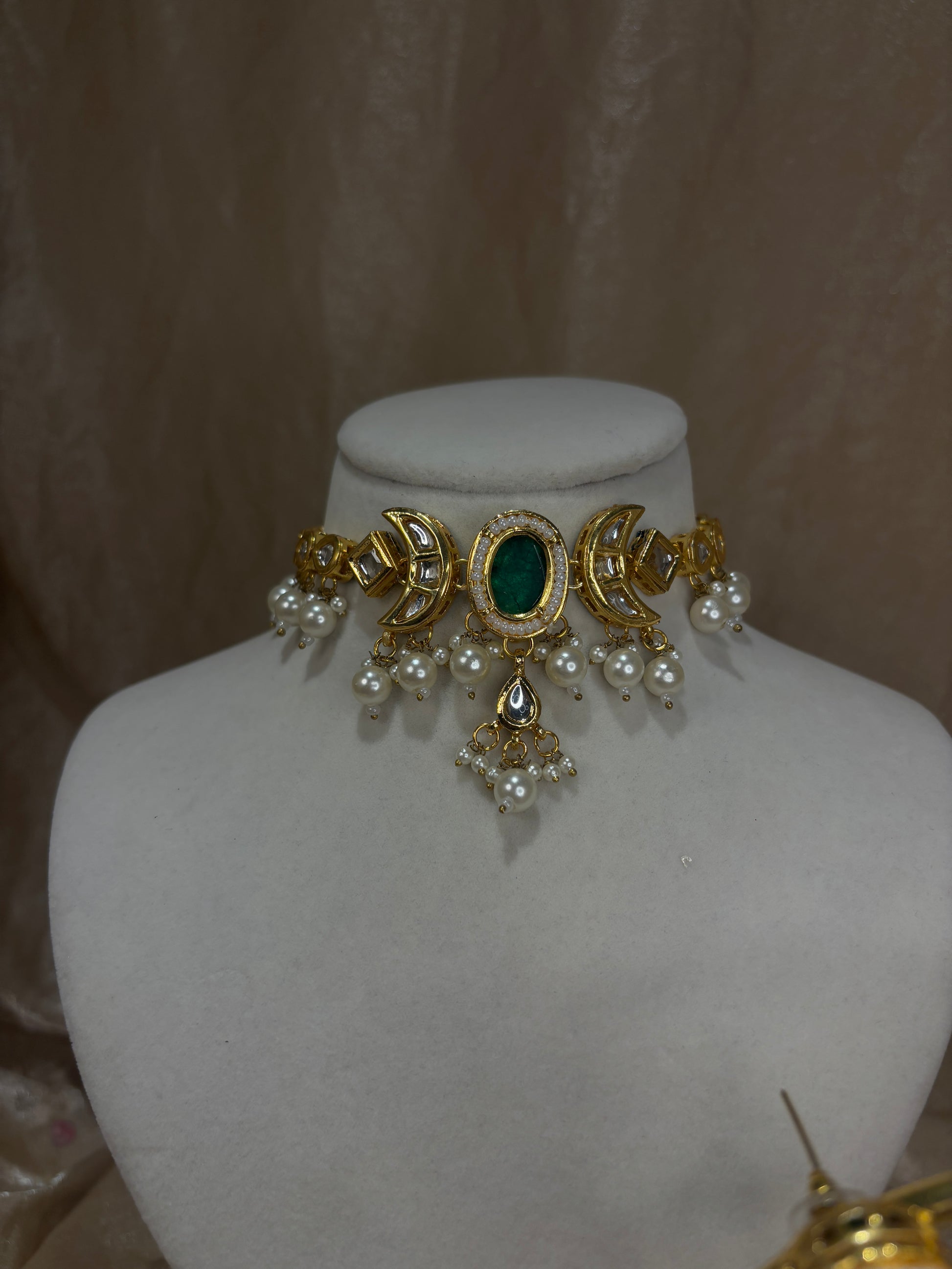 emerald green dainty kundan choker with pearl details; comes with studs and tikka
