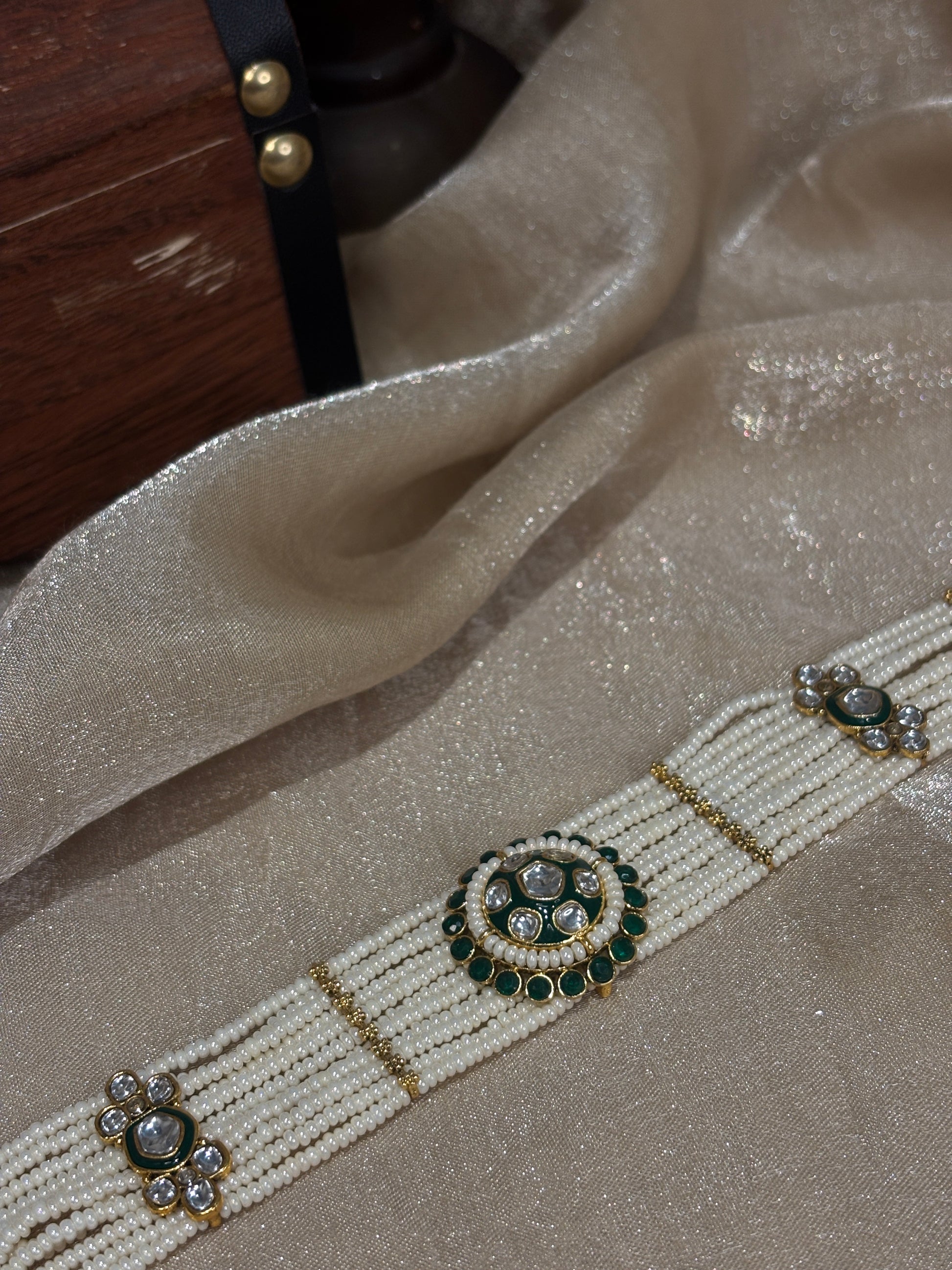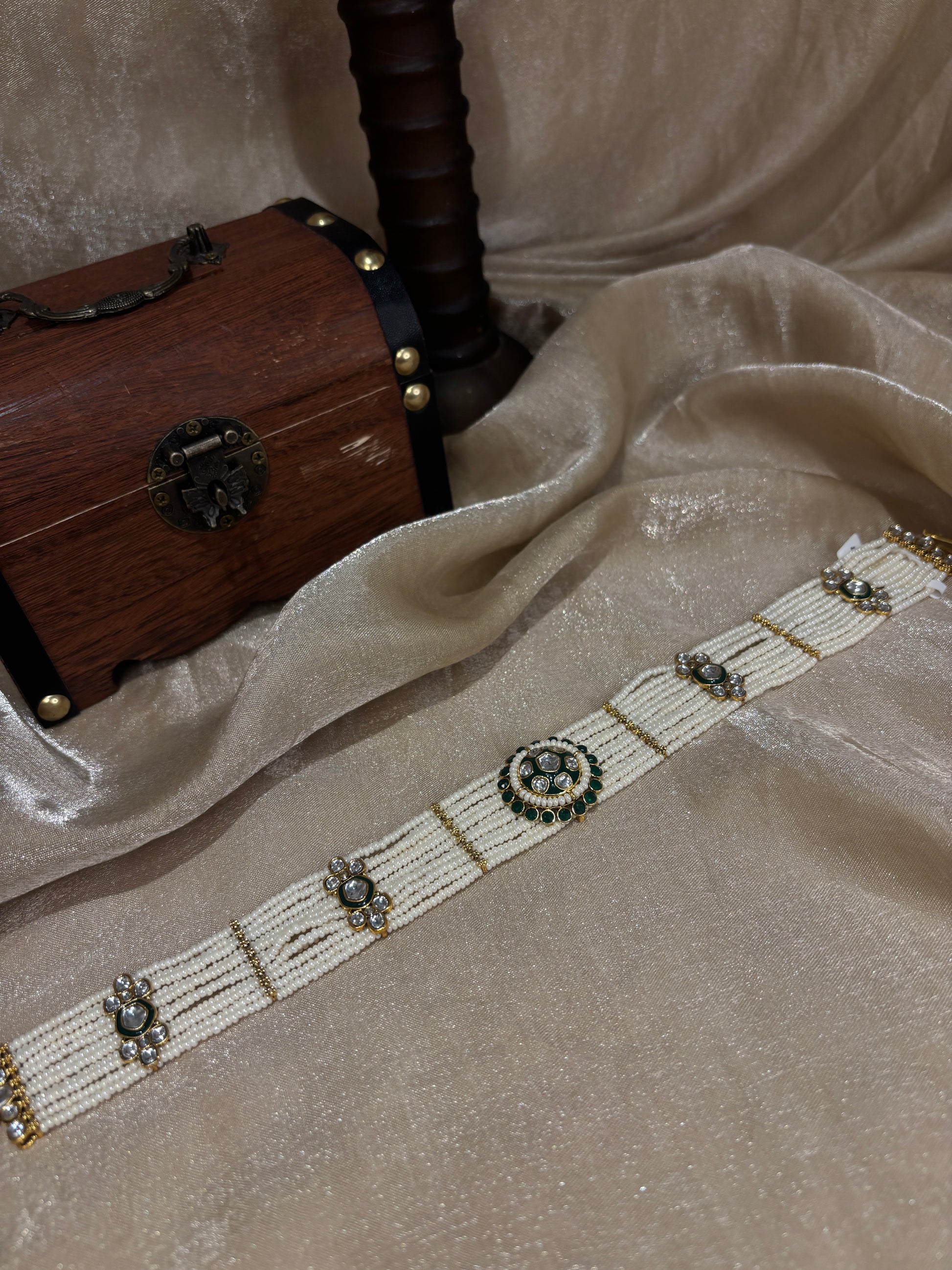 Emerald green flower detail matha Patti (headband) with kundan and pearl details; comes with hooks to attach to hair