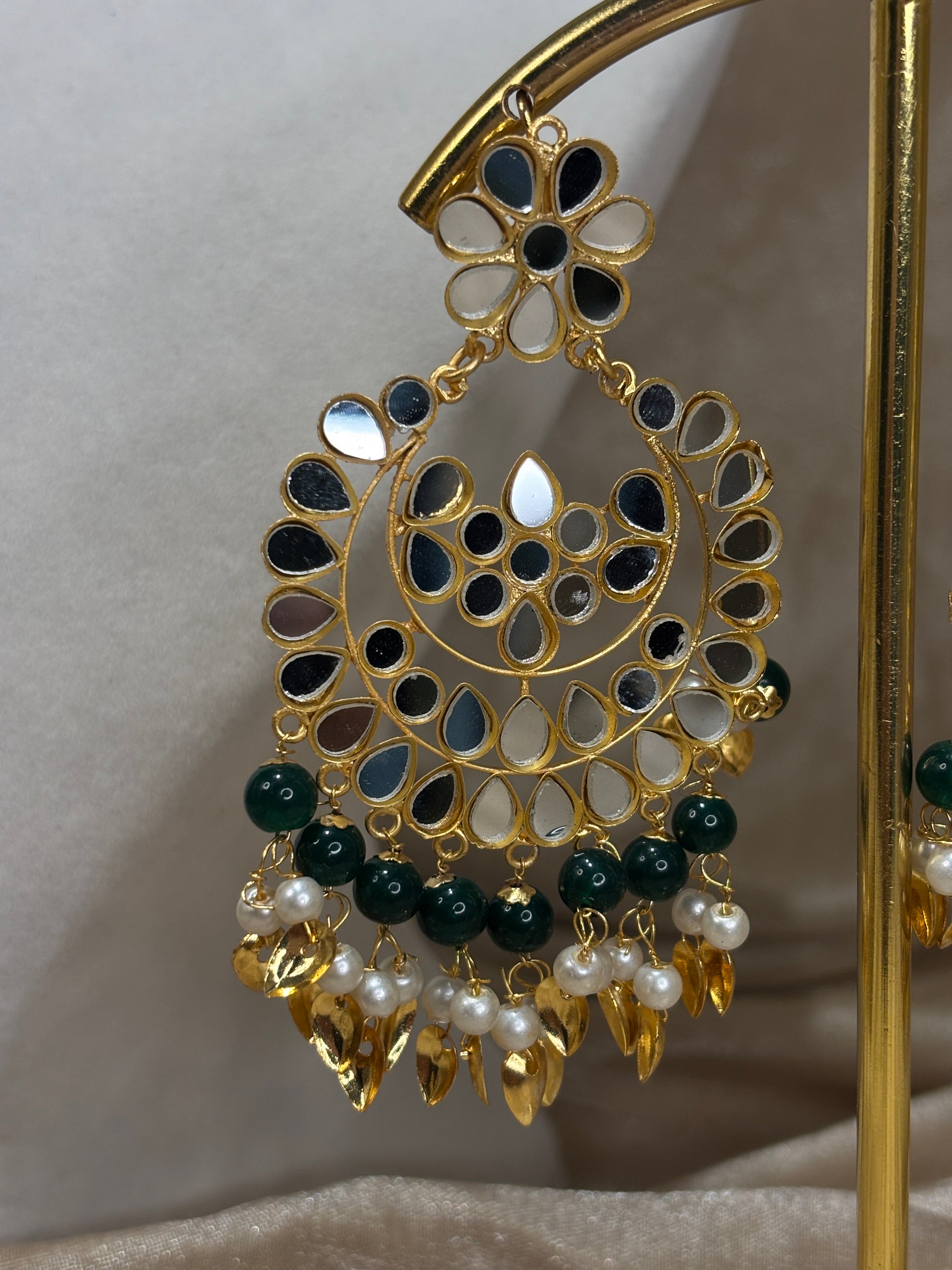 Emerald green mirror work choker set with pearl details; comes with earrings and tikka