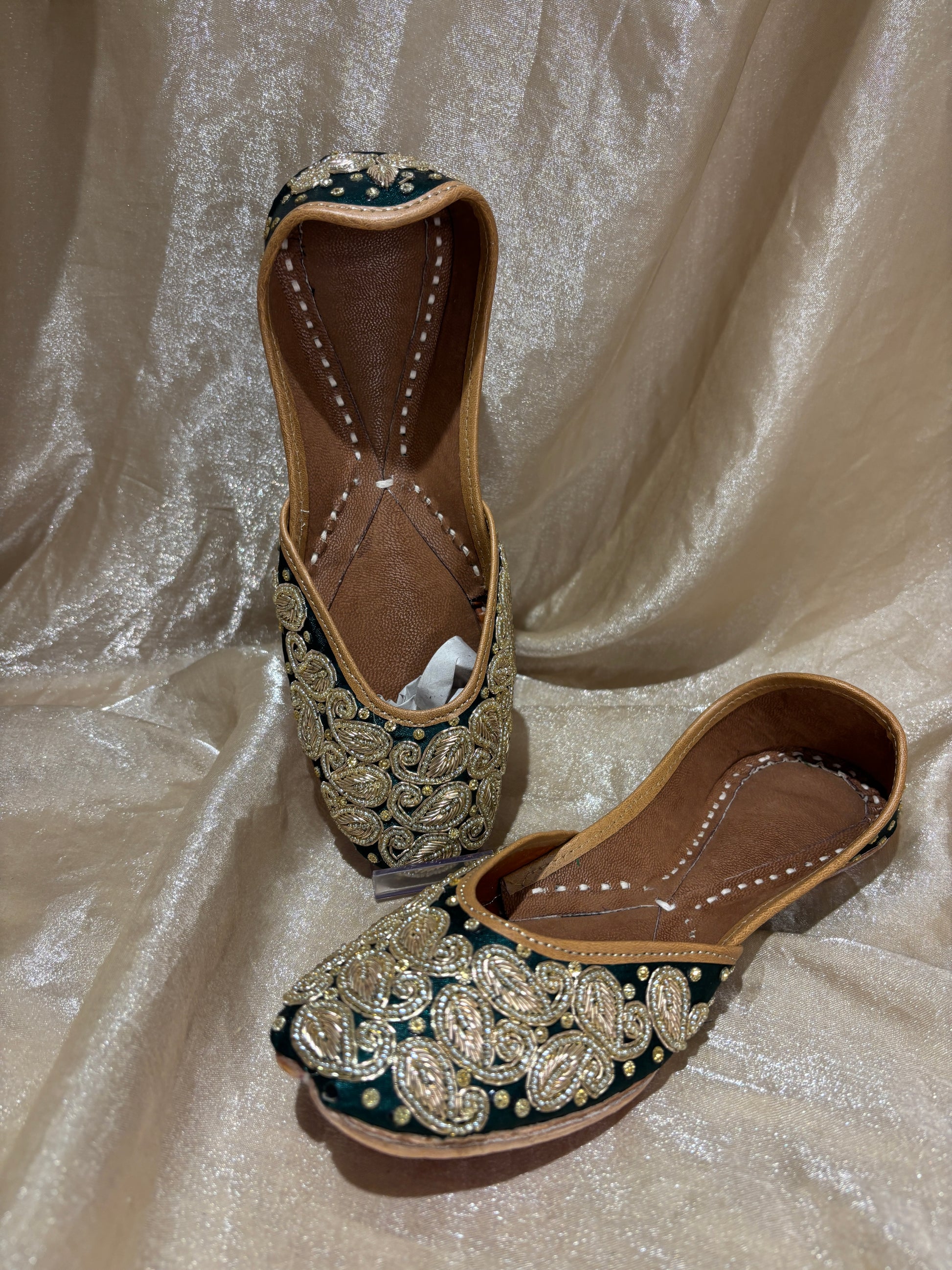 emerald green punjabi jutti with detailed embroidery; all juttis come with double padding for ultimate comfort