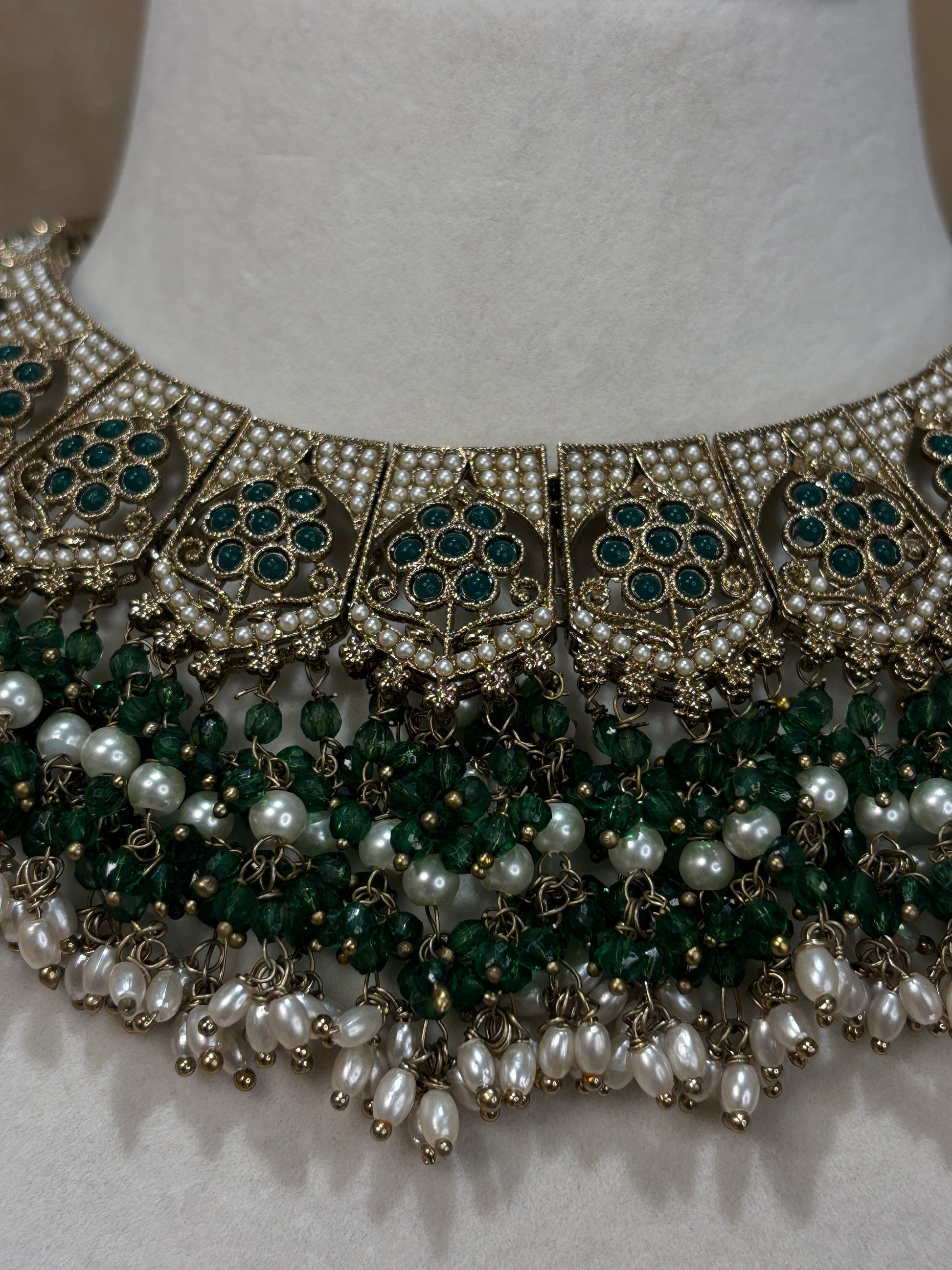 Emerald green statement necklace with pearl details; comes with jhumki earrings and statement tikka