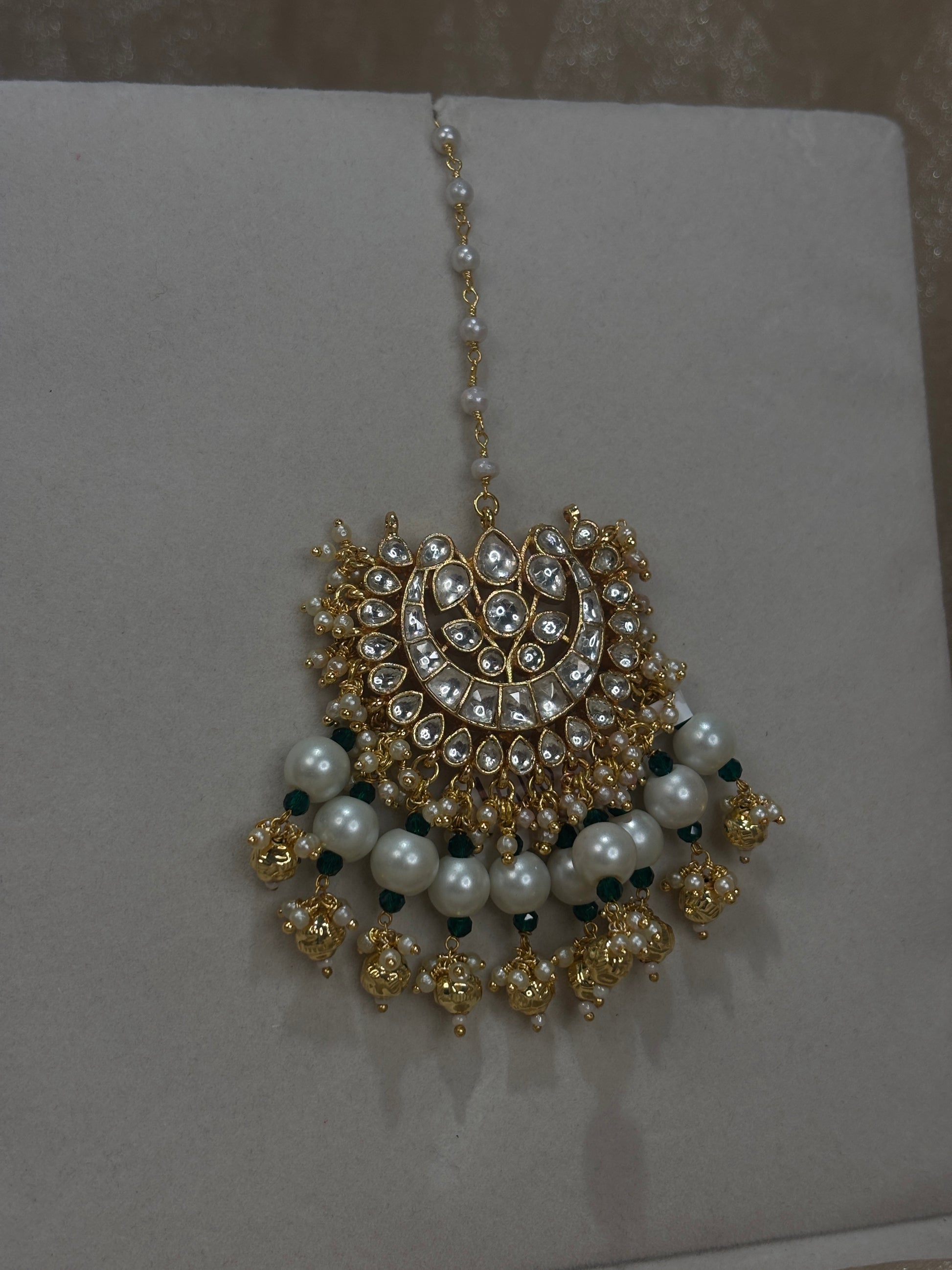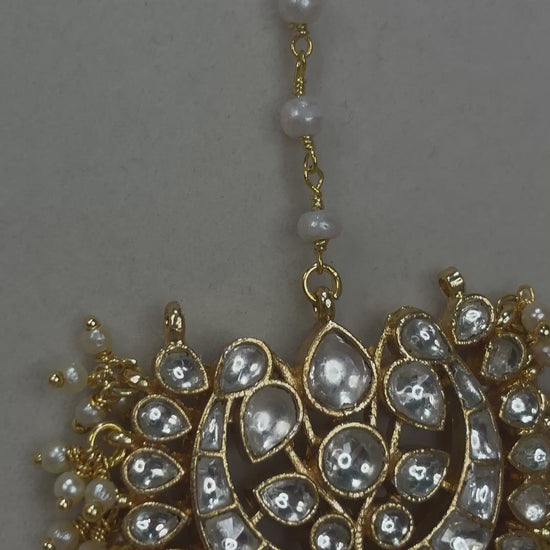 22k gold plated ahmedabadi pachi kundan tikka with pearl details; about 2 inches in diameter