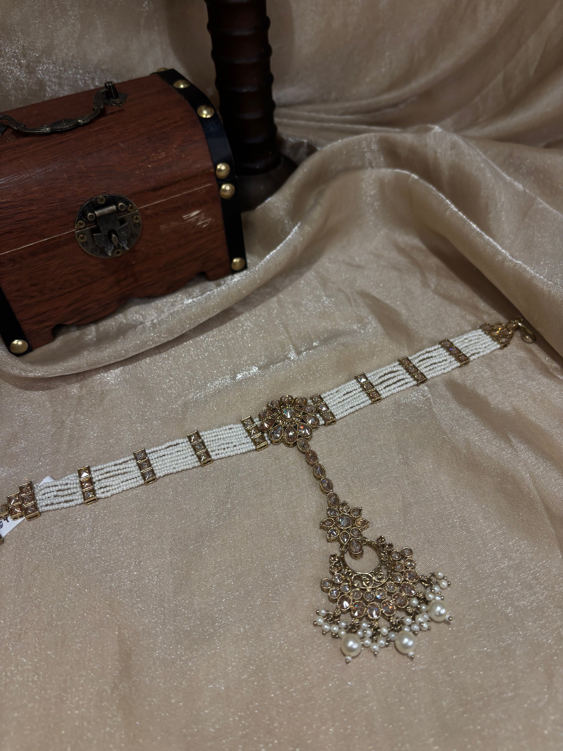 Flower detail sheeshphool (headband with tikka) with pearl details; comes with hooks to attach to hair