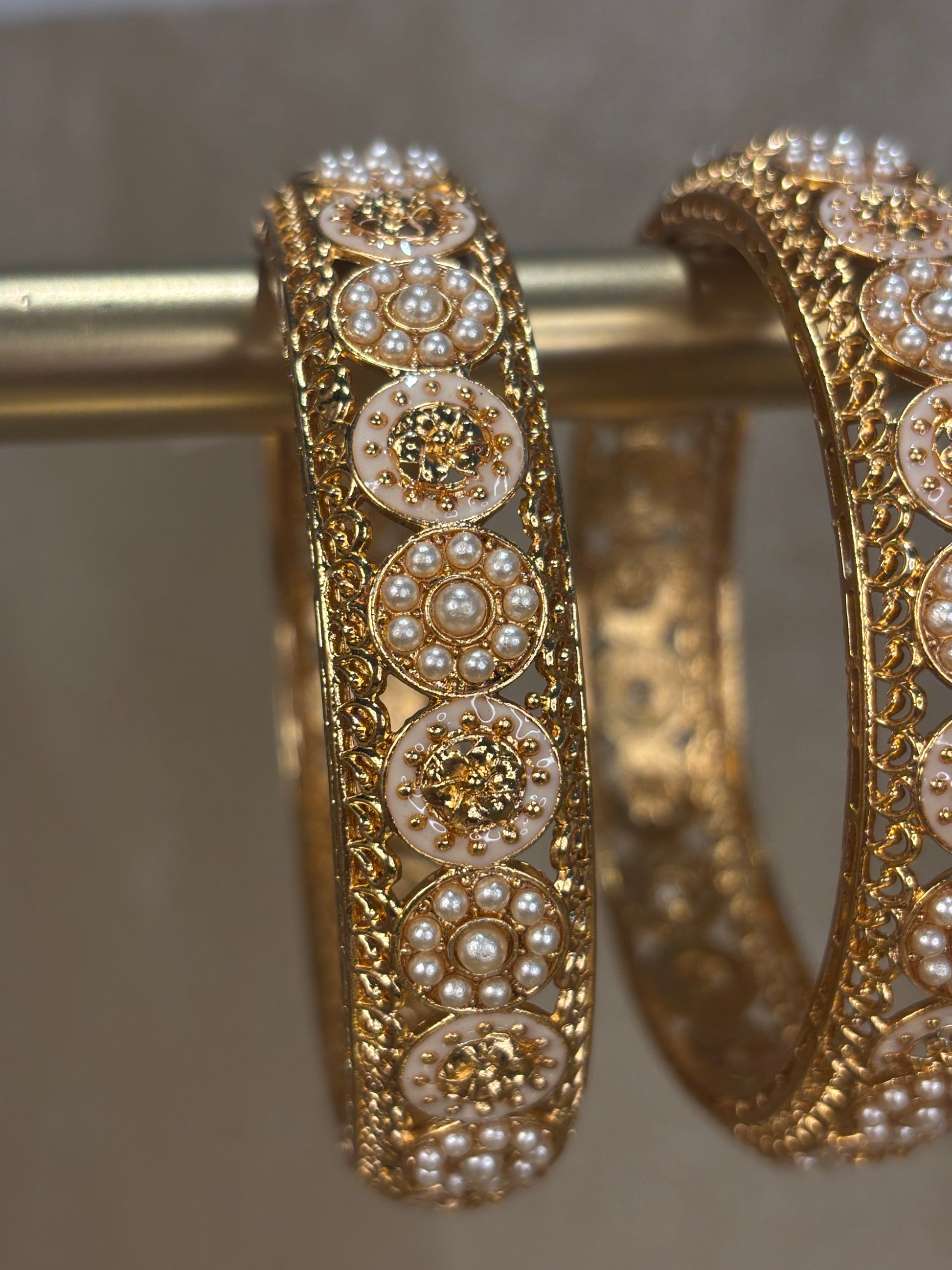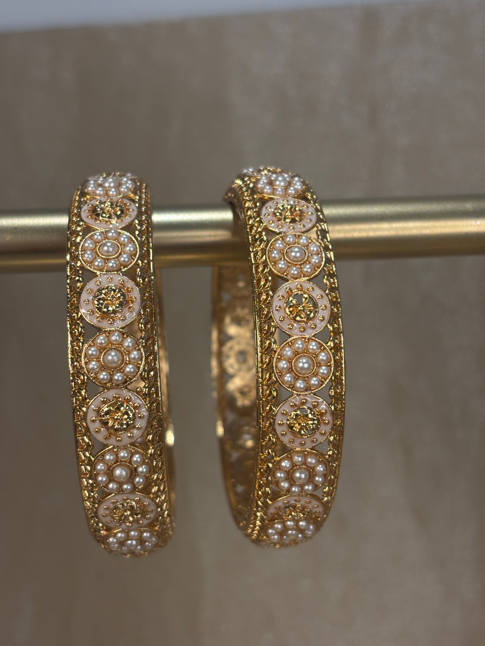 Yellow gold kare with pearl and flower details; comes in a set of 2