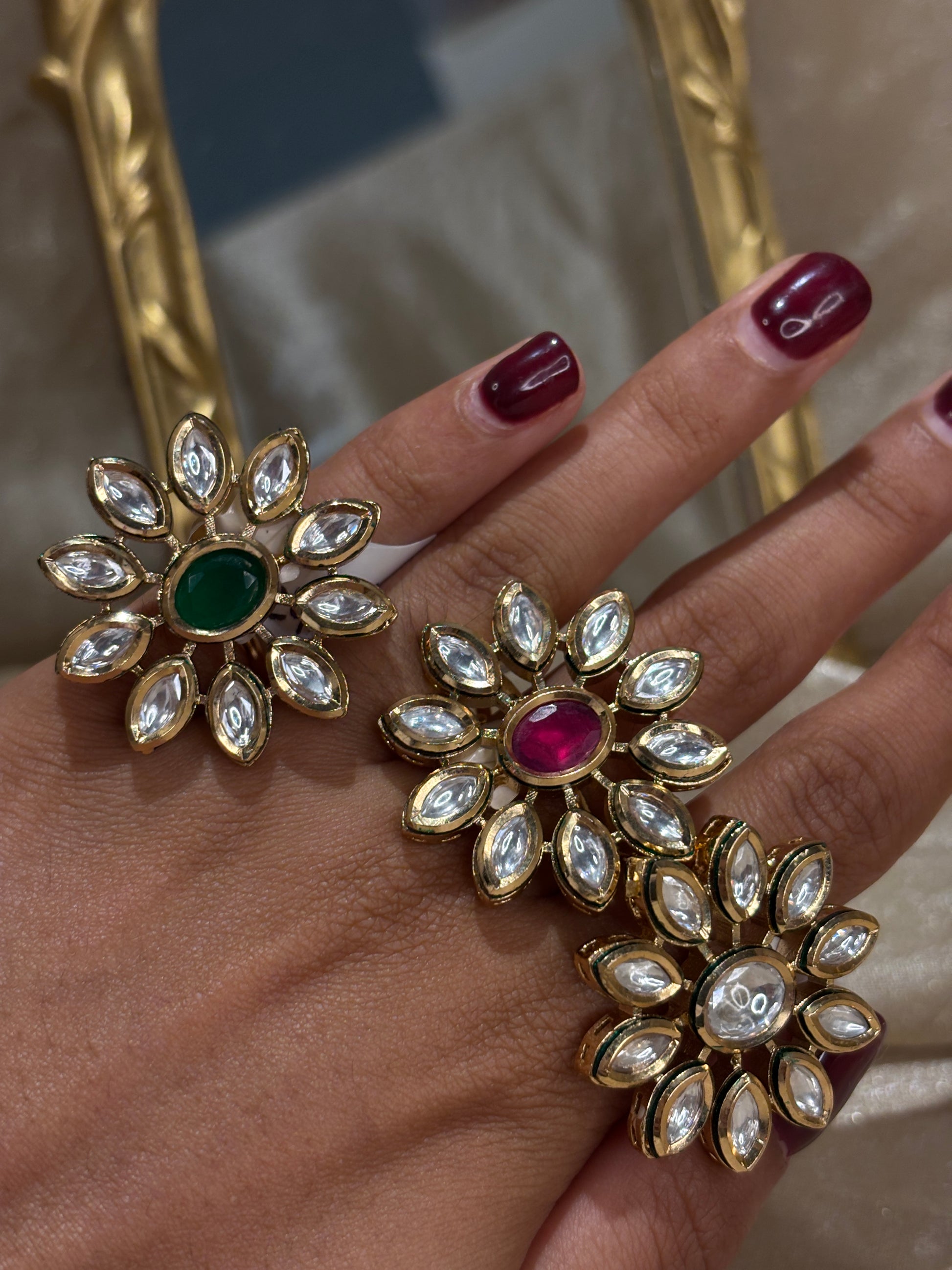 flower detail adjustable kundan statement ring; available in red, emerald green and gold