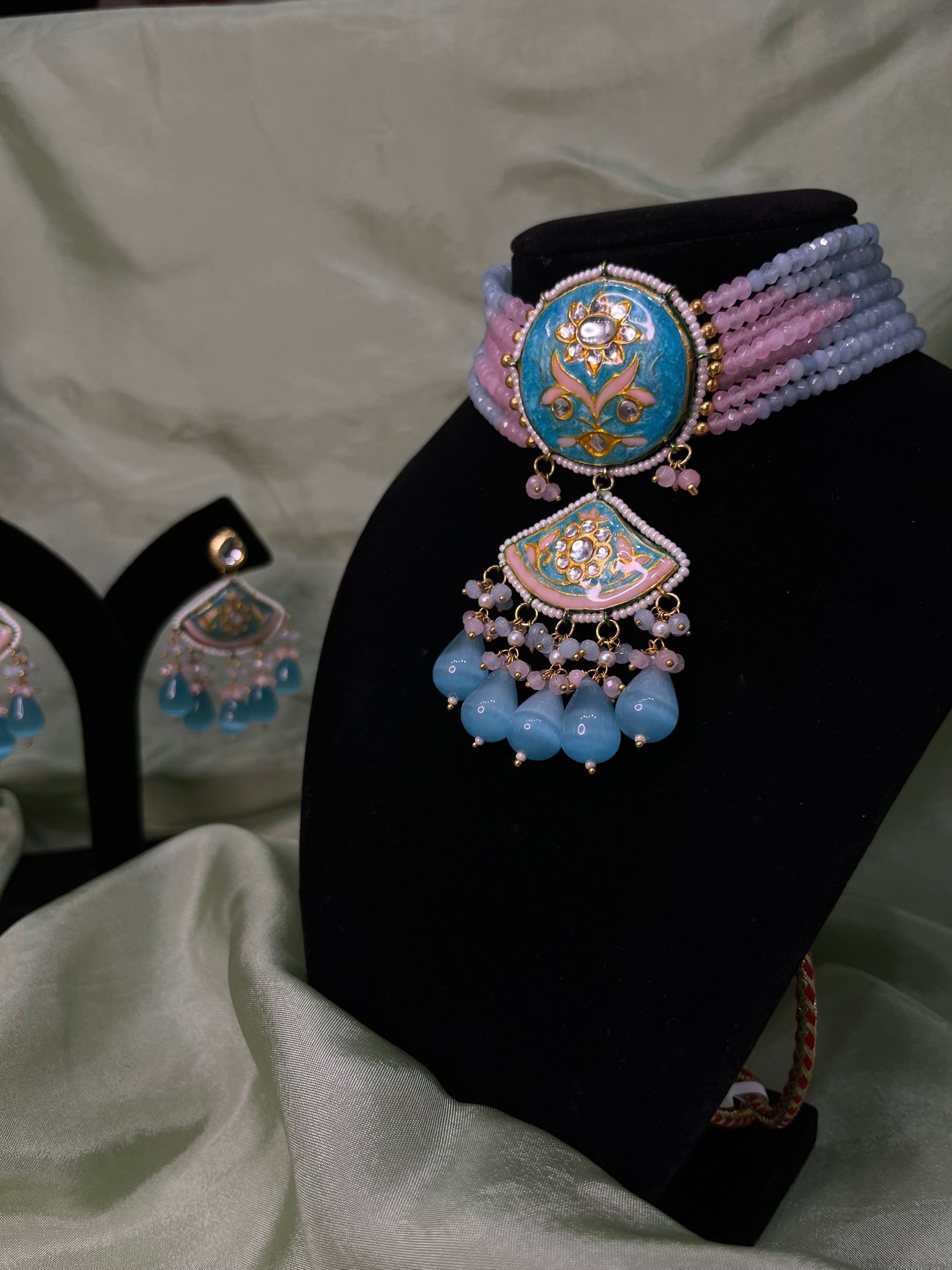 Frozi and baby pink meenakari Tiyani kundan choker set